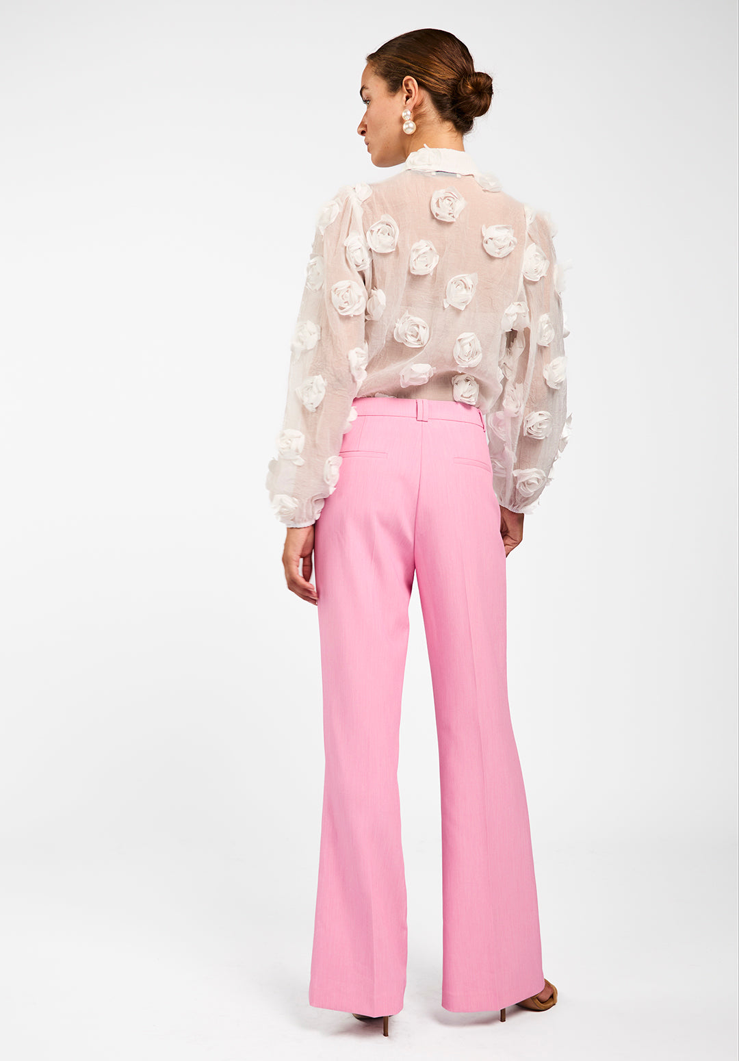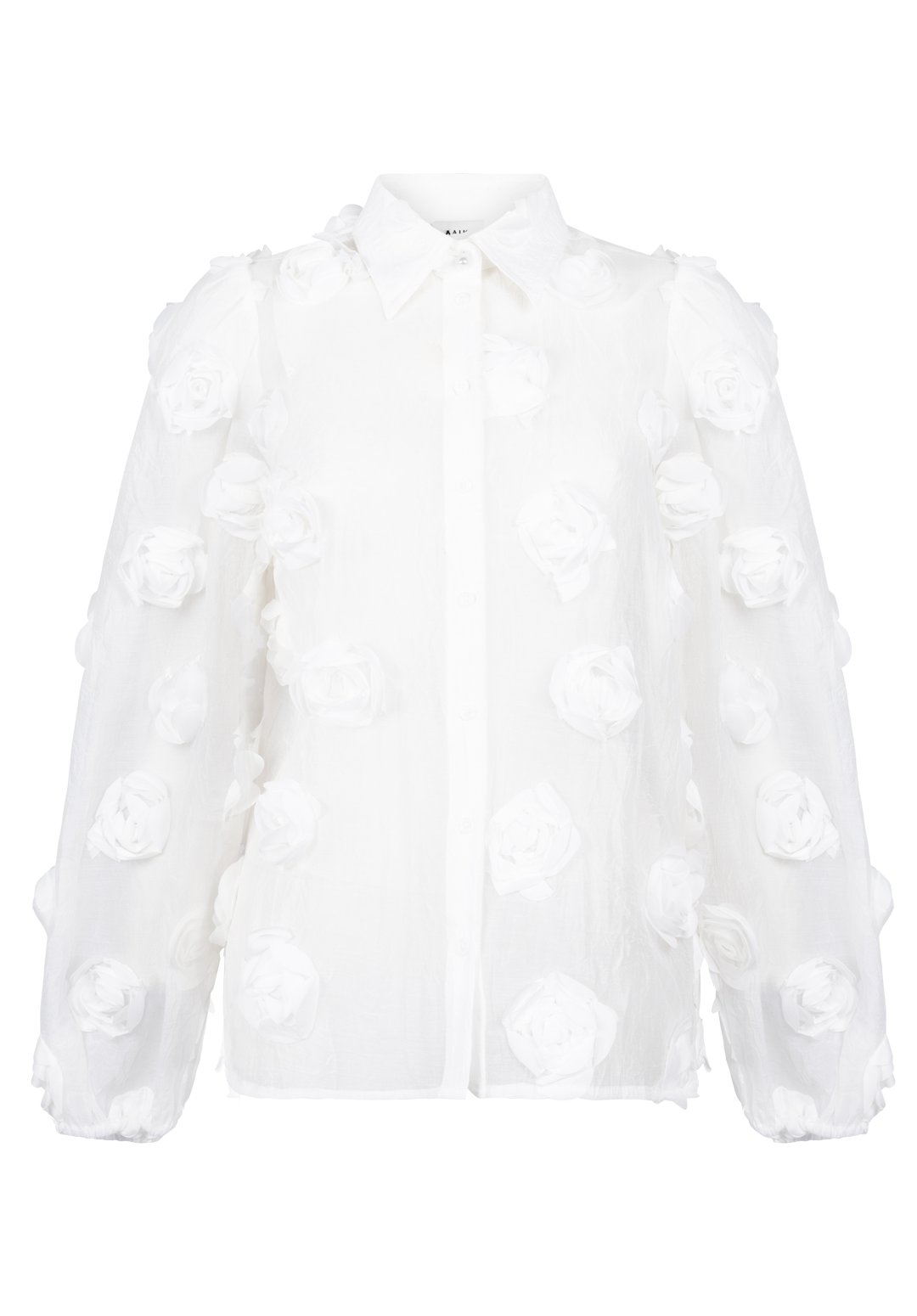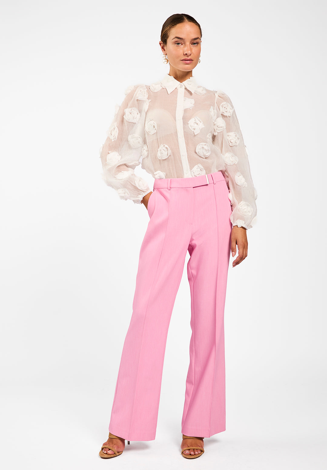 The Lien blouse is a true statement piece with its bold structure and semi-sheer finish. Light and airy, it features 3D floral appliqués that add unexpected texture and depth. The classic collar and button-down front keep the look refined, while voluminous balloon sleeves bring a playful edge. Layer it over a bralette or a simple top to achieve a sophisticated yet modern vibe. Style it with the Chantalle trousers.
