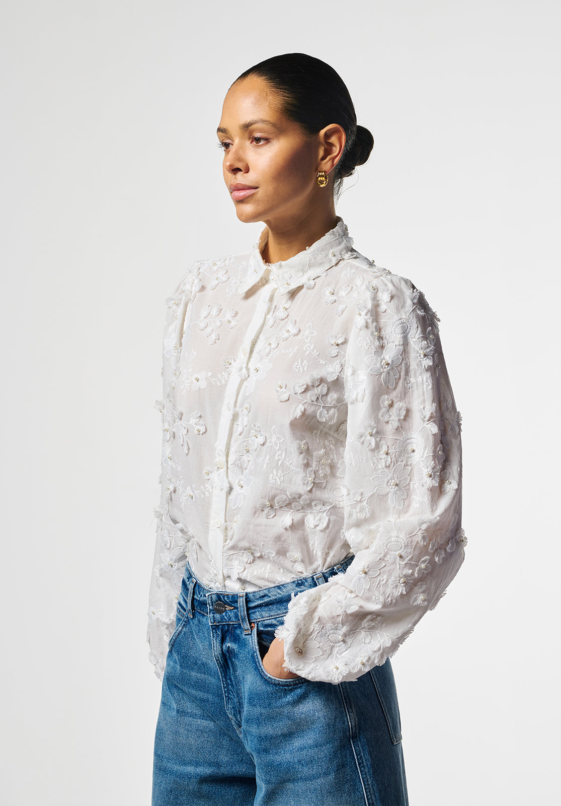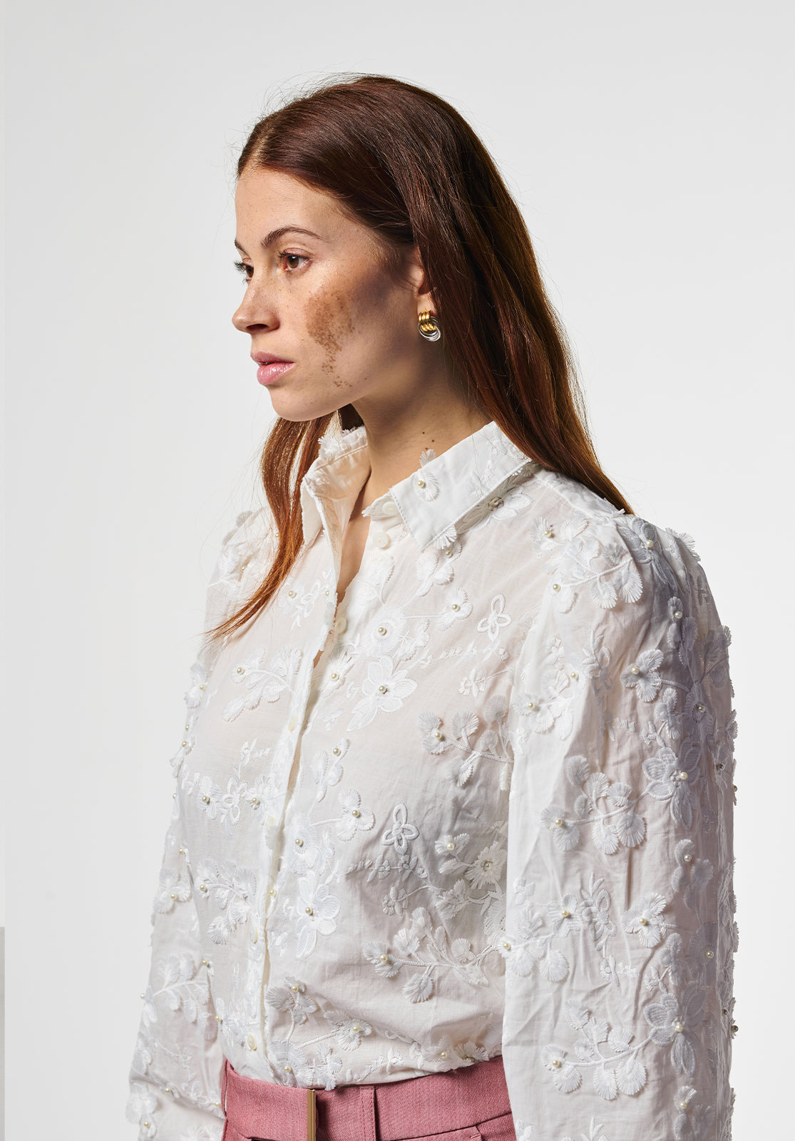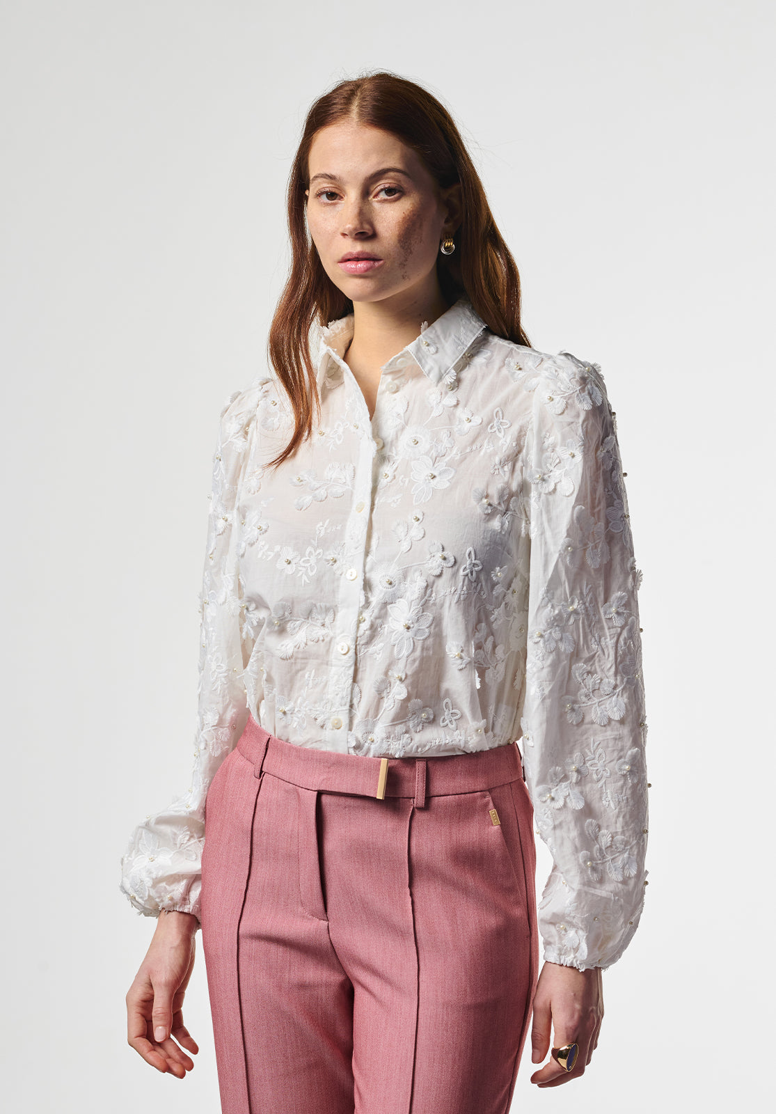 The Lien Blouse is crafted from 100% organic cotton and features delicate floral appliqués adorned with small beads for subtle detail. The semi-sheer fabric, combined with puff sleeves and a straight fit, creates a refined yet wearable silhouette. Finished with a classic collar, it’s a versatile piece for both casual and more dressed-up occasions. Pair with the Harper trousers for a complete look.
