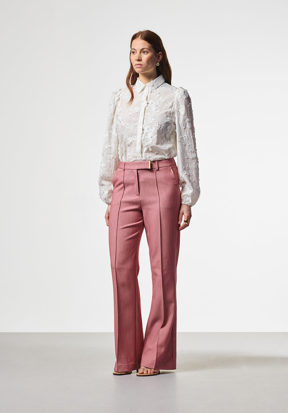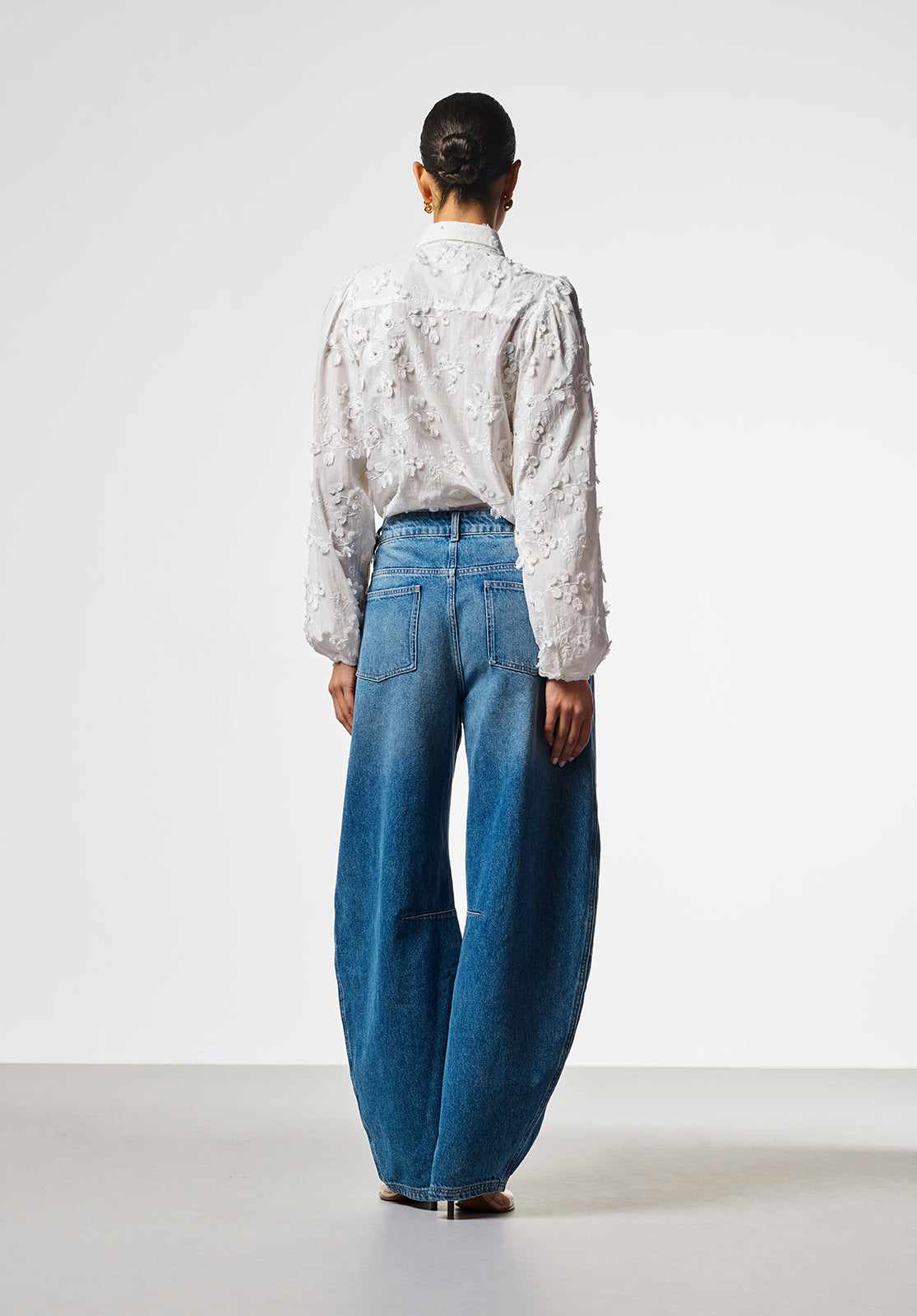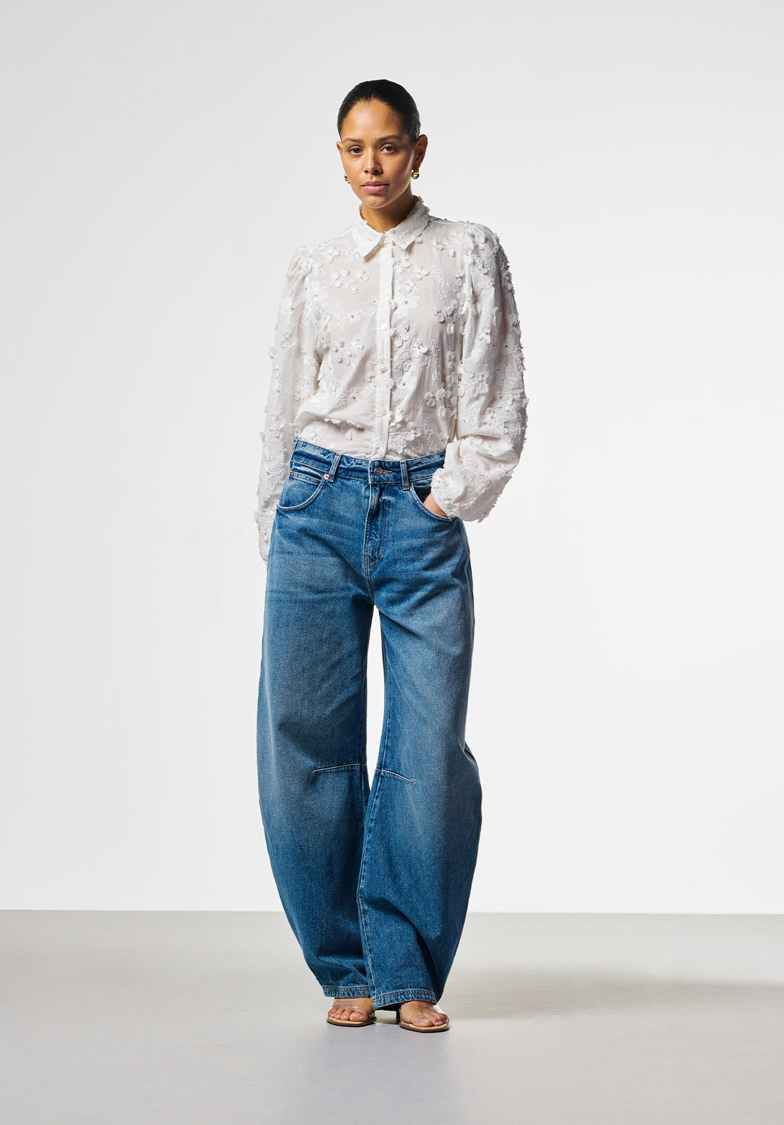 The Lien Blouse is crafted from 100% organic cotton and features delicate floral appliqués adorned with small beads for subtle detail. The semi-sheer fabric, combined with puff sleeves and a straight fit, creates a refined yet wearable silhouette. Finished with a classic collar, it’s a versatile piece for both casual and more dressed-up occasions. Pair with the Harper trousers for a complete look.