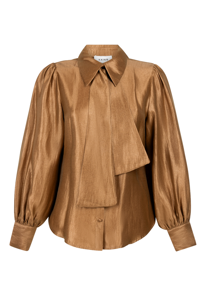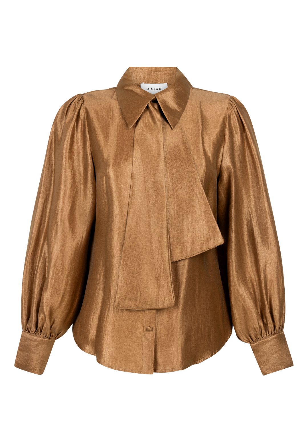 The Veronne Blouse is a feminine classic with a flowing fit and subtle balloon sleeves. Designed with a chic scarf detail at the neck, it can be tied in a loose bow for a relaxed vibe or styled neatly for a more polished look. The soft shimmer fabric adds a refined touch, making it easy to pair with both tailored trousers and casual denim.