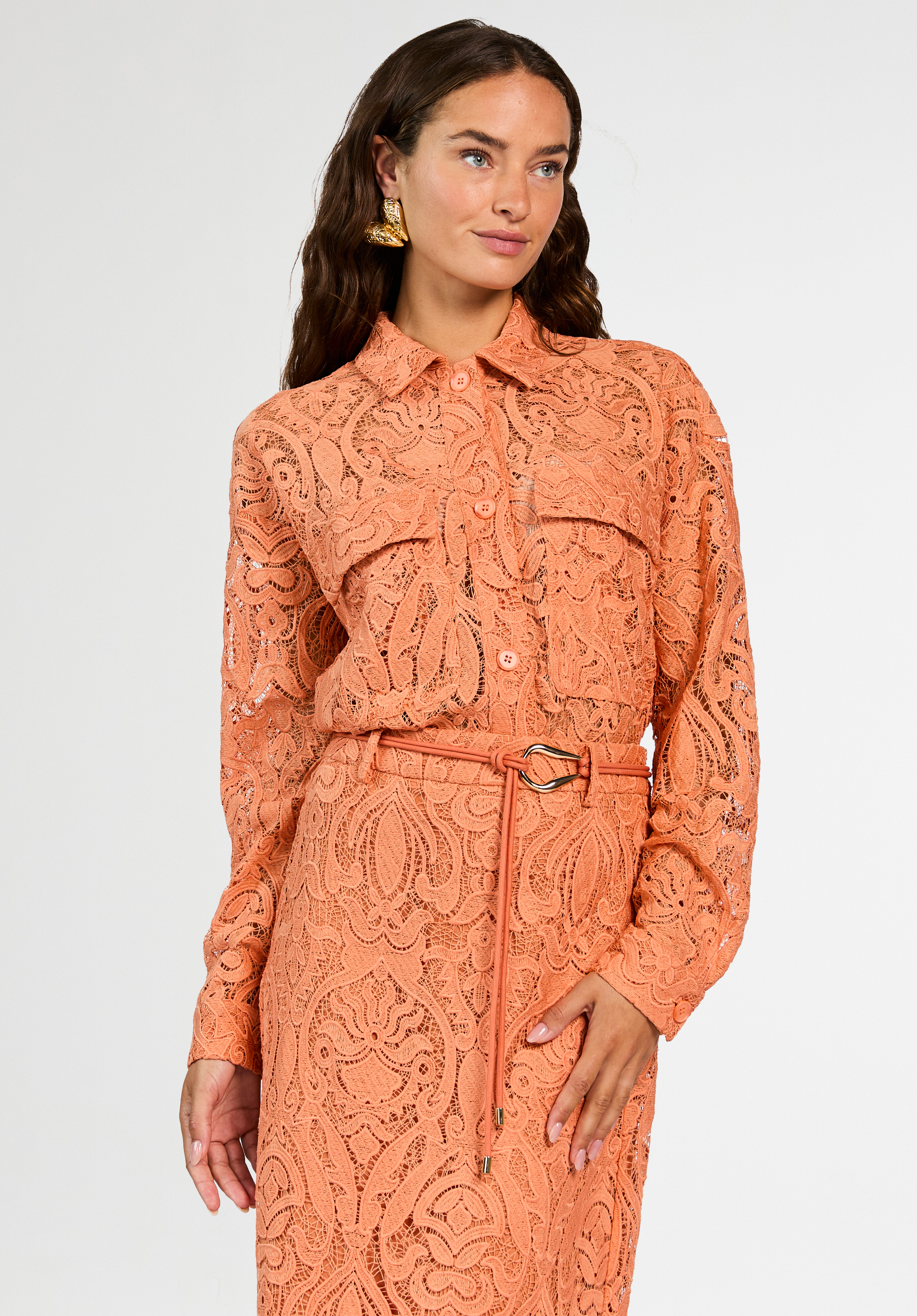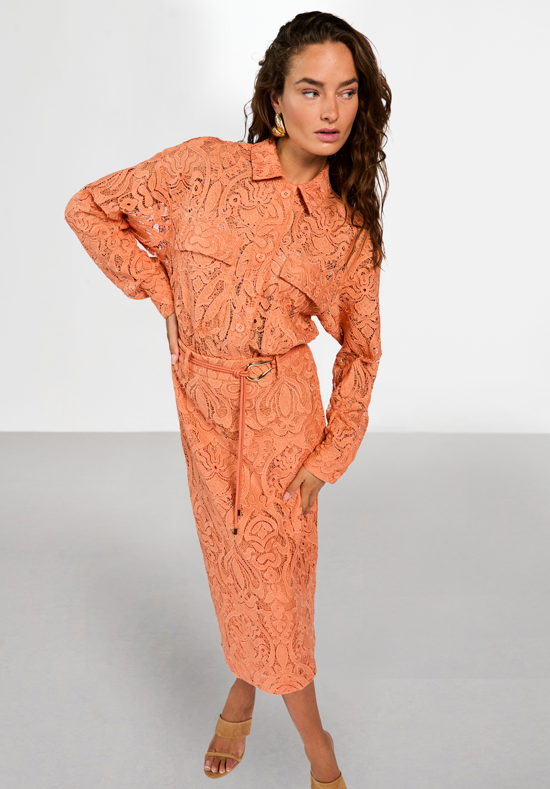 This stylish lace coat is a real eye-catcher with a luxurious look. The refined pattern and button placket create an elegant, feminine look. The matching waistband beautifully accentuates the waist. Perfect for wearing as a statement piece and pairing beautifully with the Amia skirt.