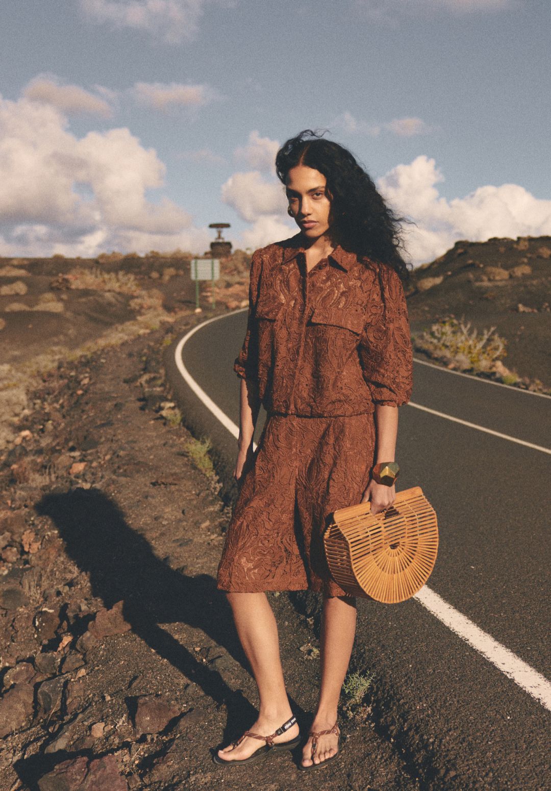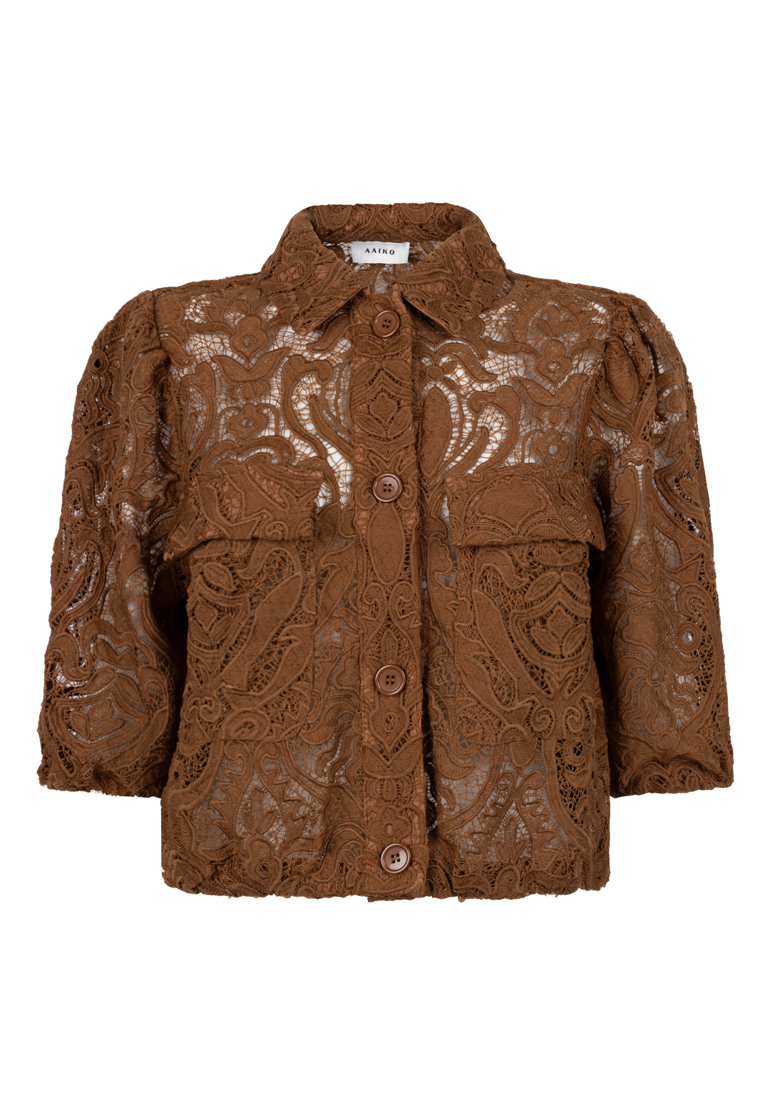 This jacket has a rich, elegant look. The intricate lace with its detailed pattern adds a luxurious feel, while the chest pockets and structured collar bring a subtle, rugged contrast.