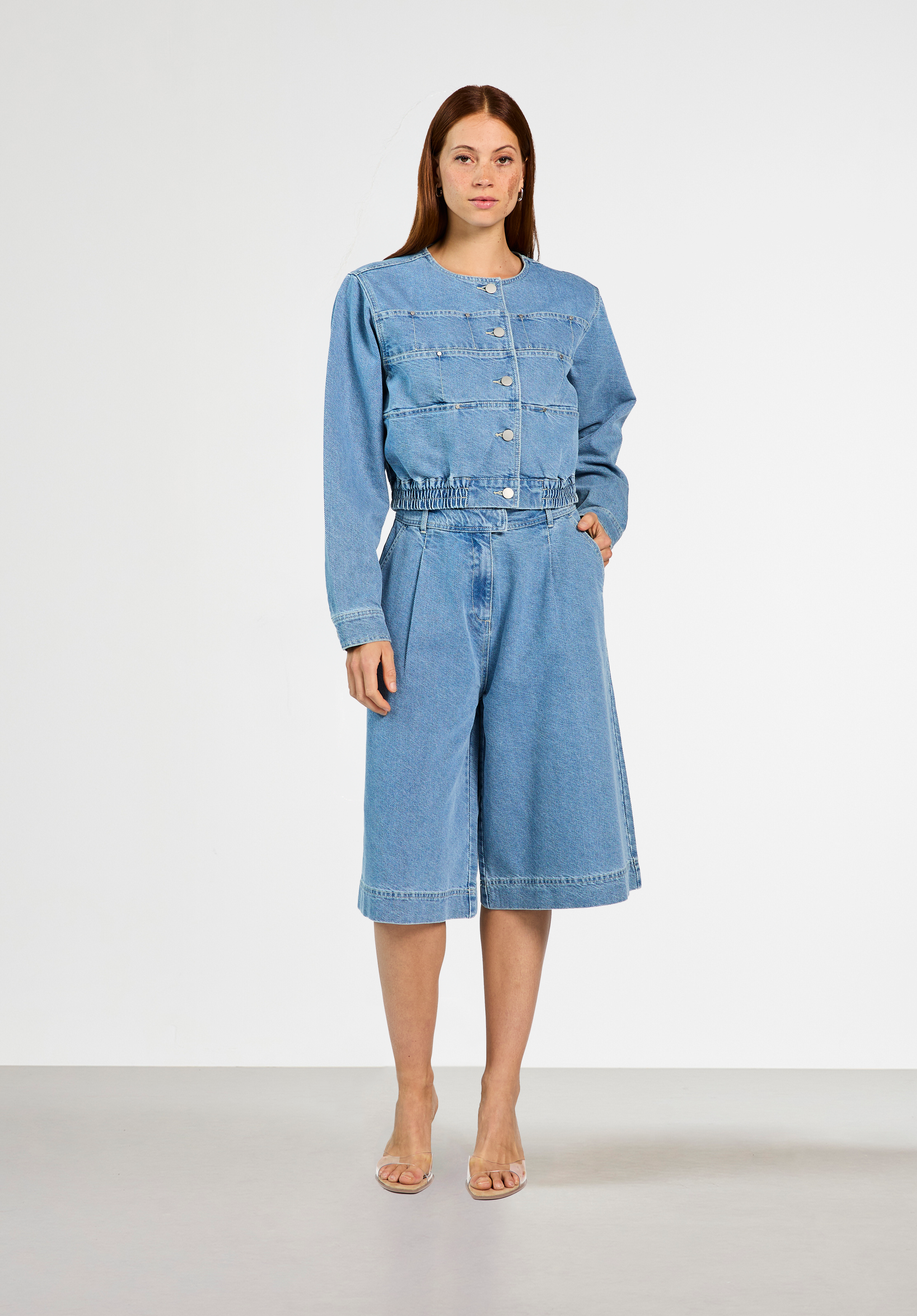 This denim culotte combines the comfort of trousers with the look of a skirt. The wide, straight fit falls just above the knee and has a high waist for a flattering fit. The sturdy denim adds a rugged edge while maintaining a feminine silhouette. Ideal for a modern, casual look.