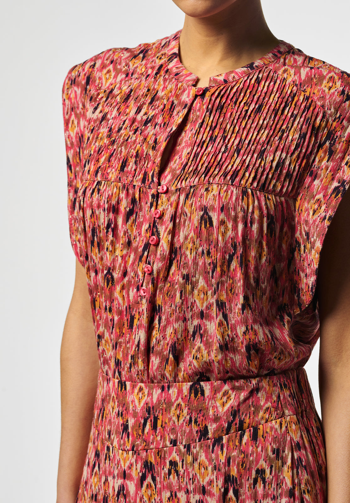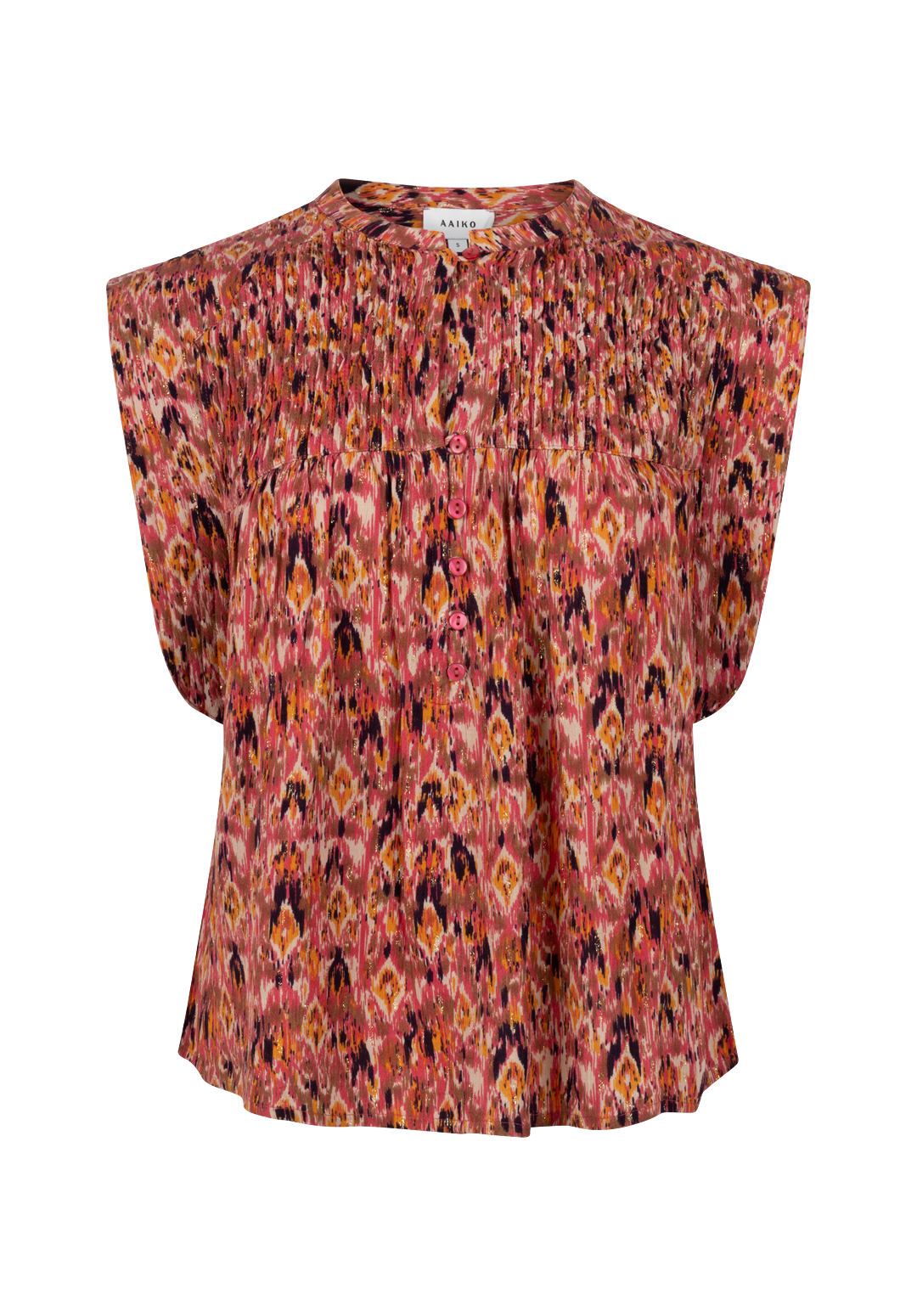 This top has an airy and feminine look thanks to the refined ikat print in warm tones. The subtle pleats at the neckline and the button closure at the front give the design an elegant and playful touch.