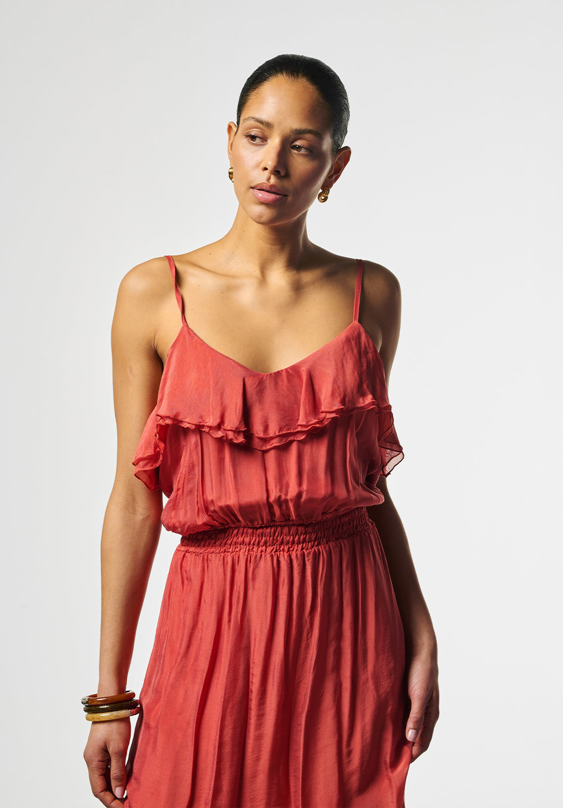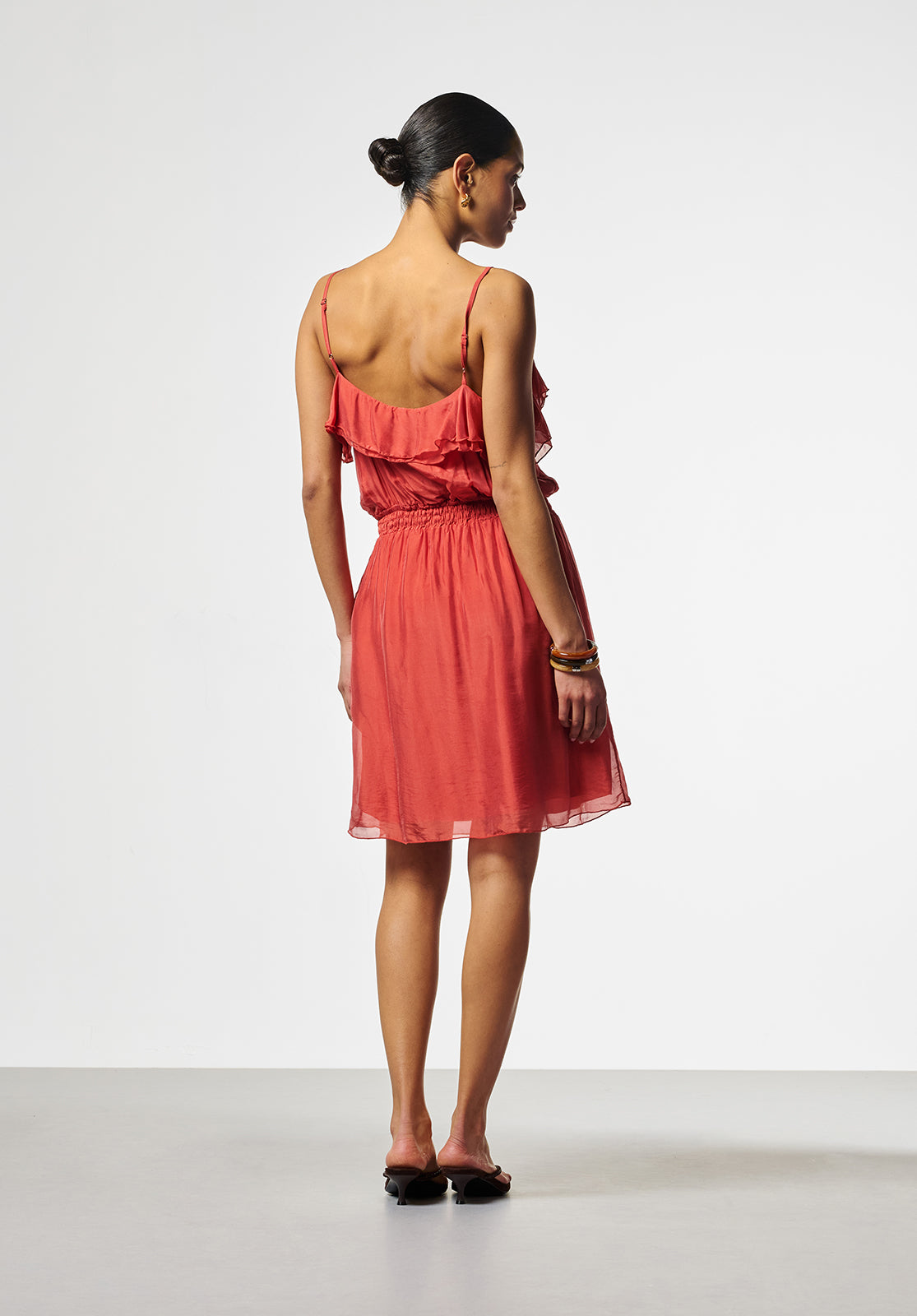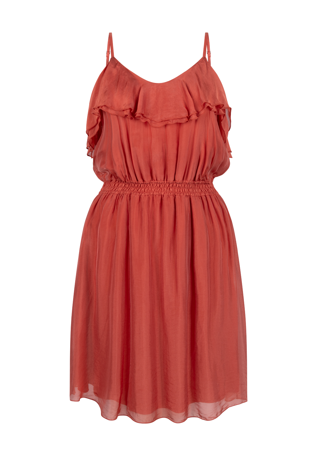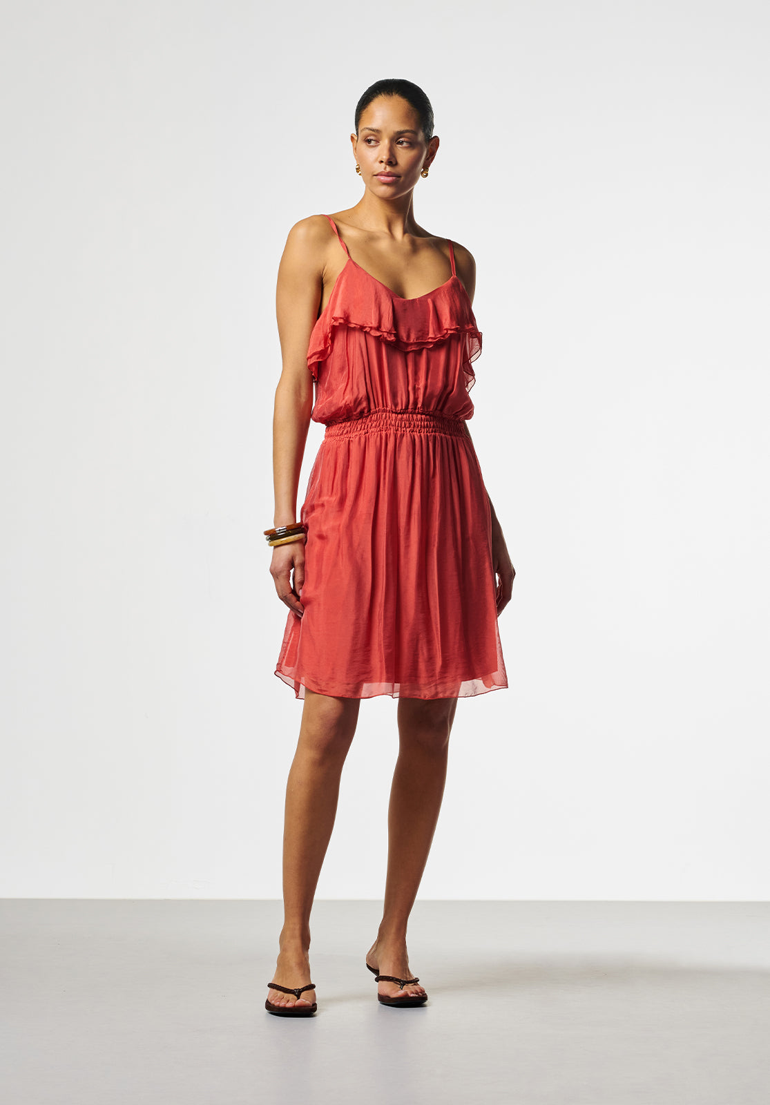This dress has a romantic and airy feel. The flowing fabric and subtle ruffles along the neckline give the design a playful and feminine touch. The narrow shoulder straps and elastic waist ensure a comfortable and flattering fit.