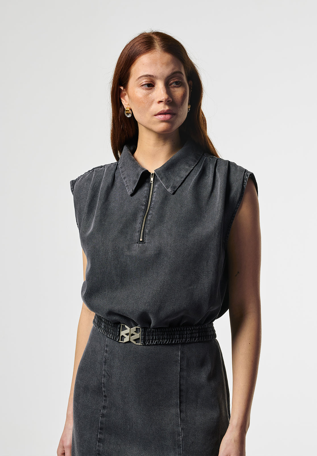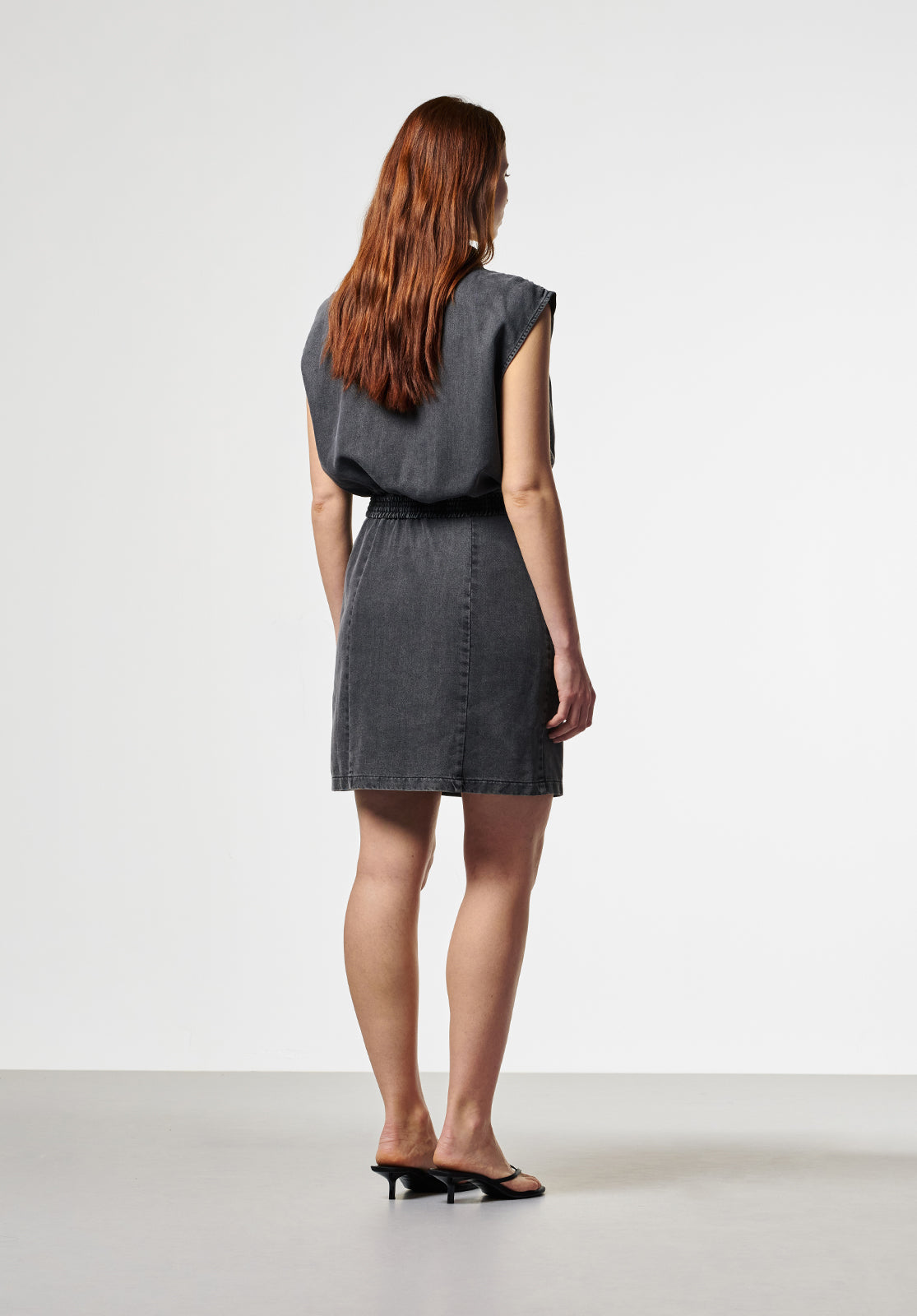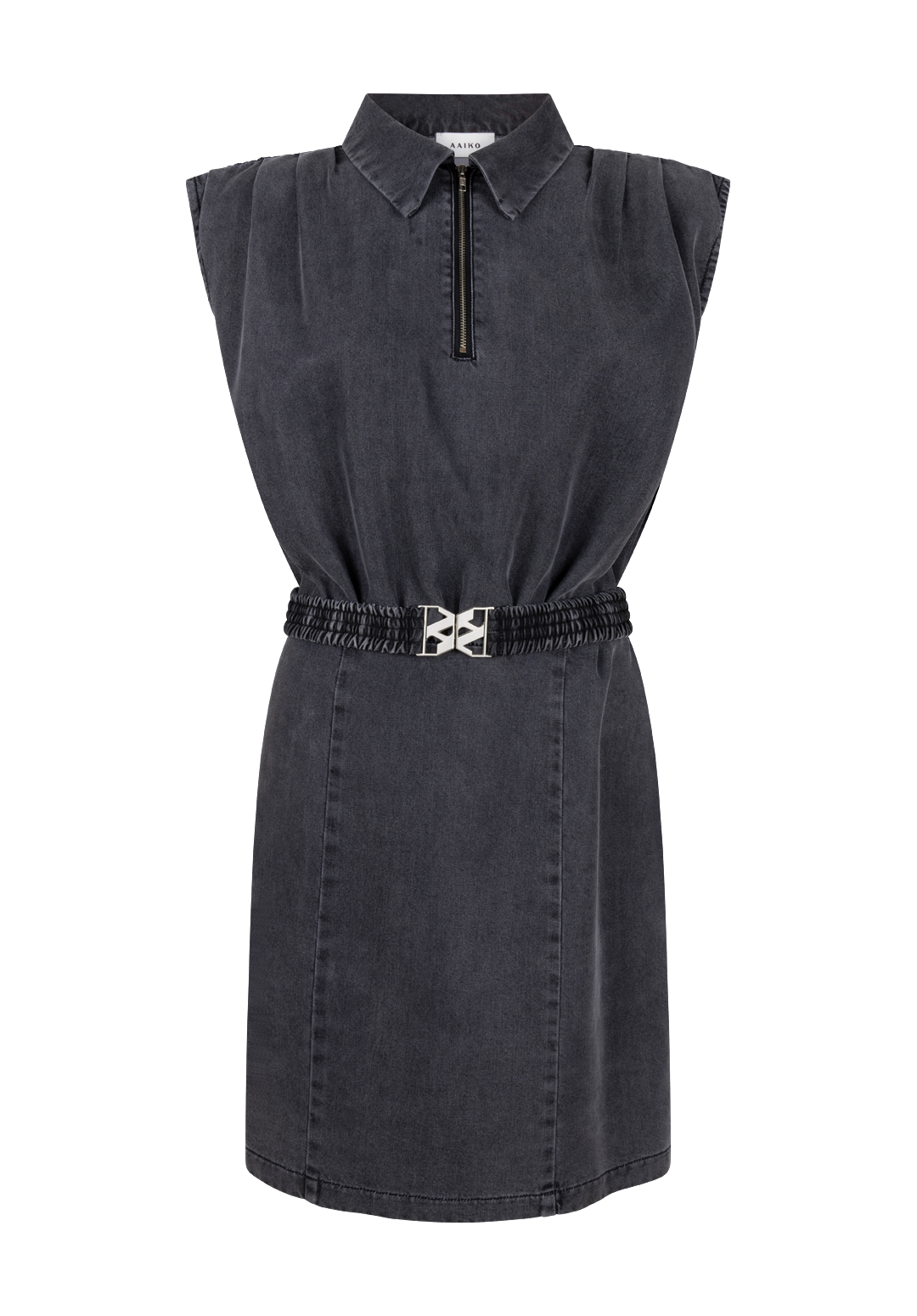Deze jurk heeft een stoere en moderne uitstraling. Het denimlook materiaal in combinatie met de ritssluiting en de elastische tailleband met gespdetail zorgt voor een krachtige en vrouwelijke look.
