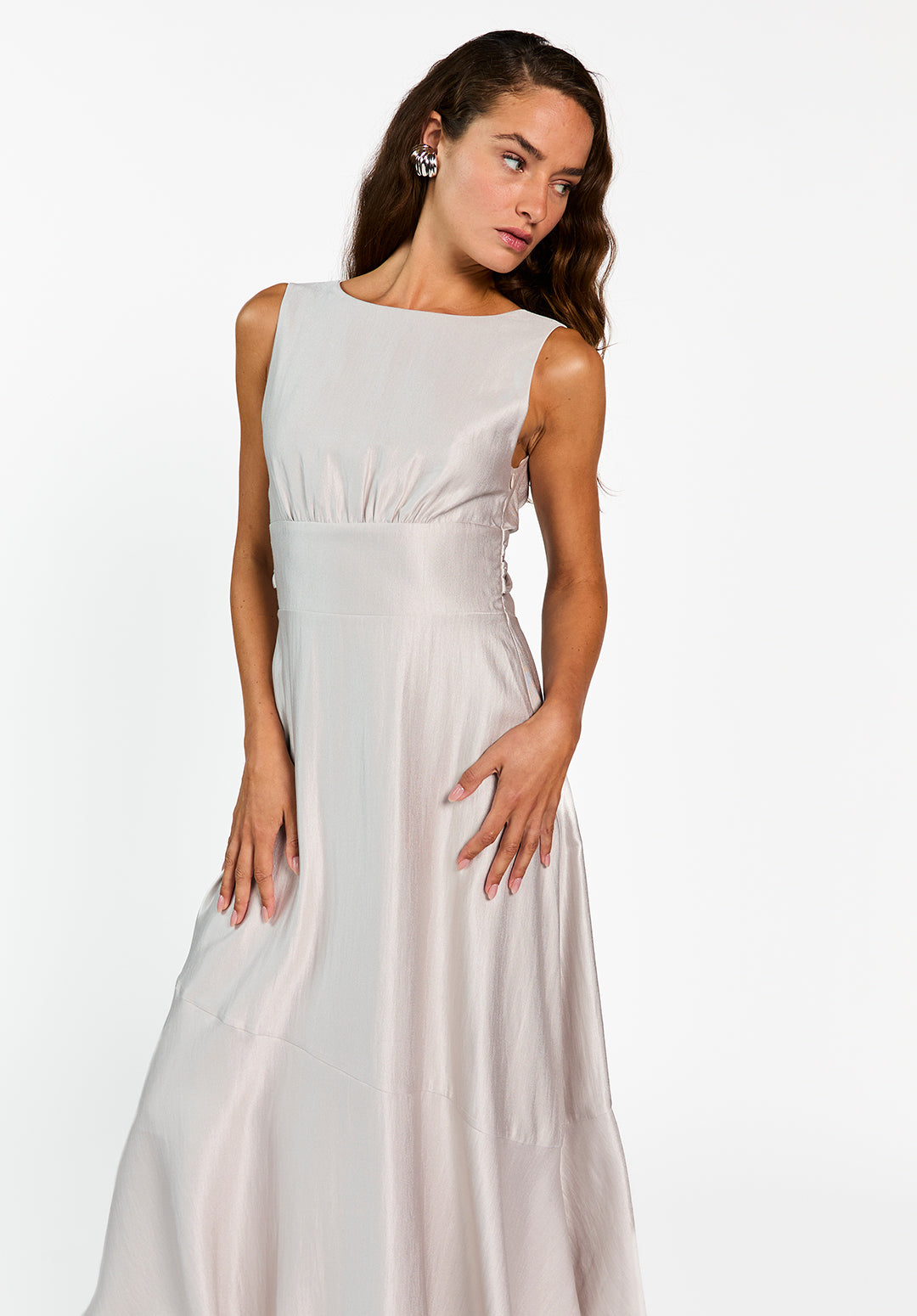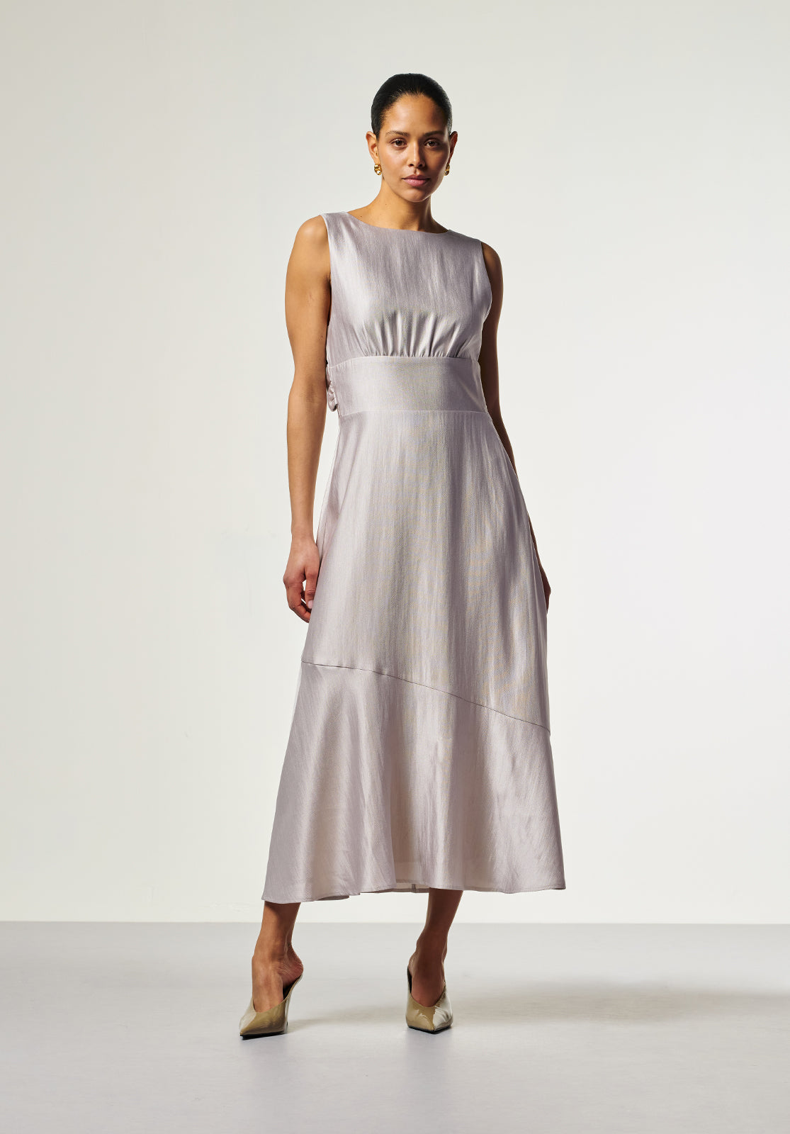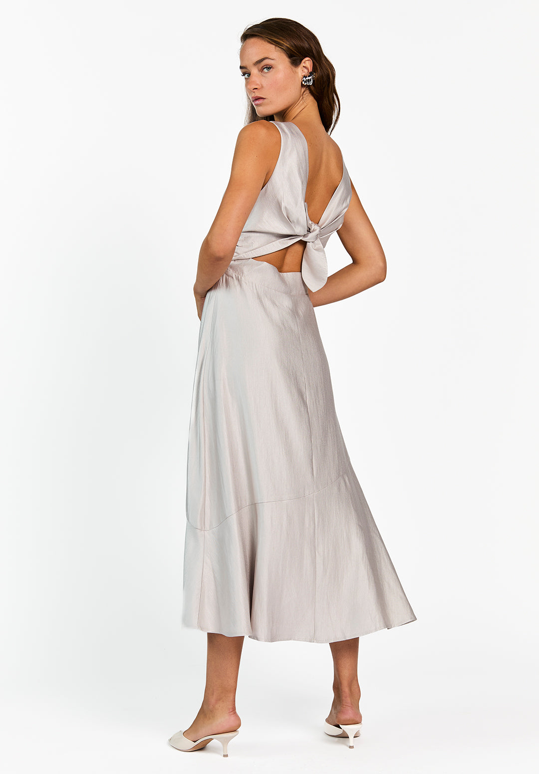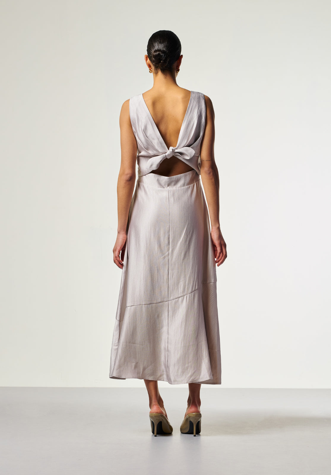The Michelle Dress is a feminine midi dress with a playful twist at the back. The shimmering fabric drapes smoothly and subtly accentuates the waist thanks to its fitted silhouette. The open back with a button detail makes this piece both surprising and refined. Perfect for a dinner party or a summer occasion.