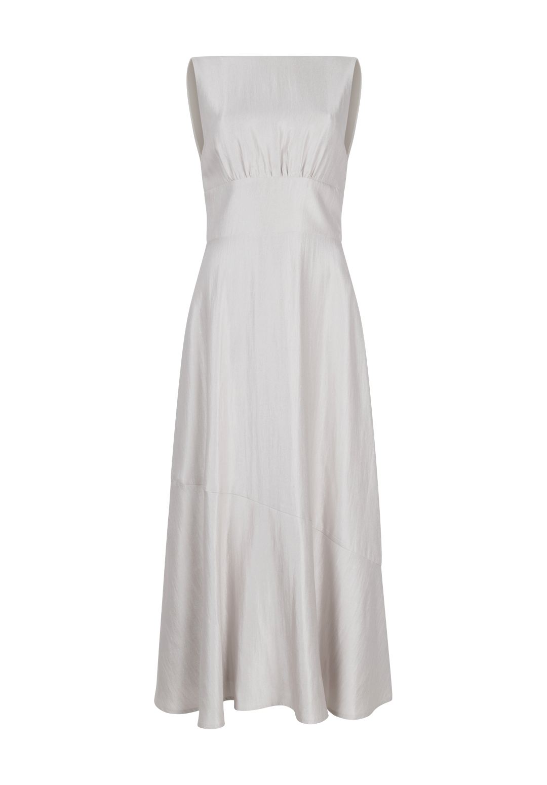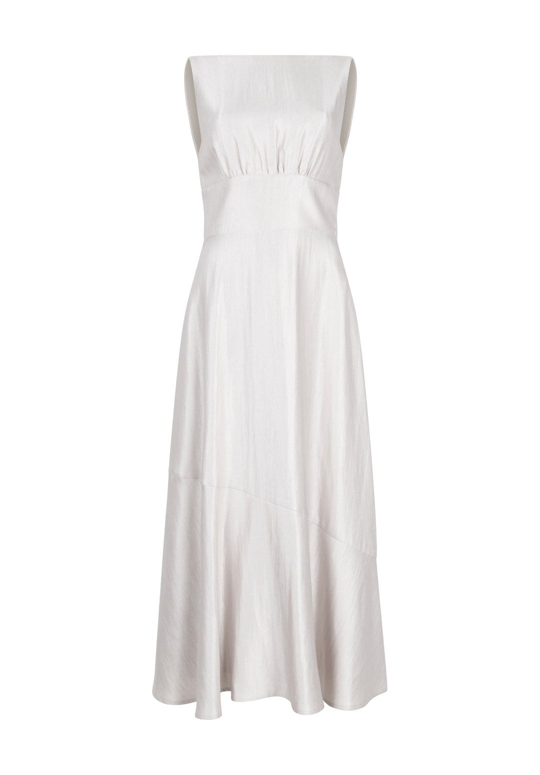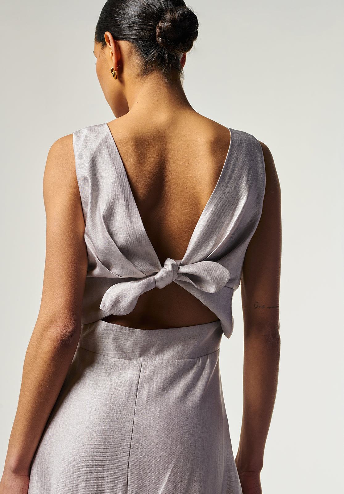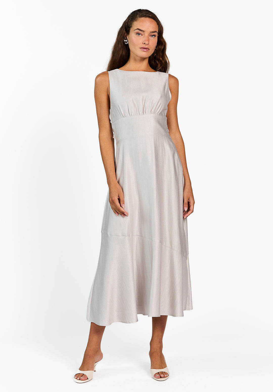The Michelle Dress is a feminine midi dress with a playful twist at the back. The shimmering fabric drapes smoothly and subtly accentuates the waist thanks to its fitted silhouette. The open back with a button detail makes this piece both surprising and refined. Perfect for a dinner party or a summer occasion.