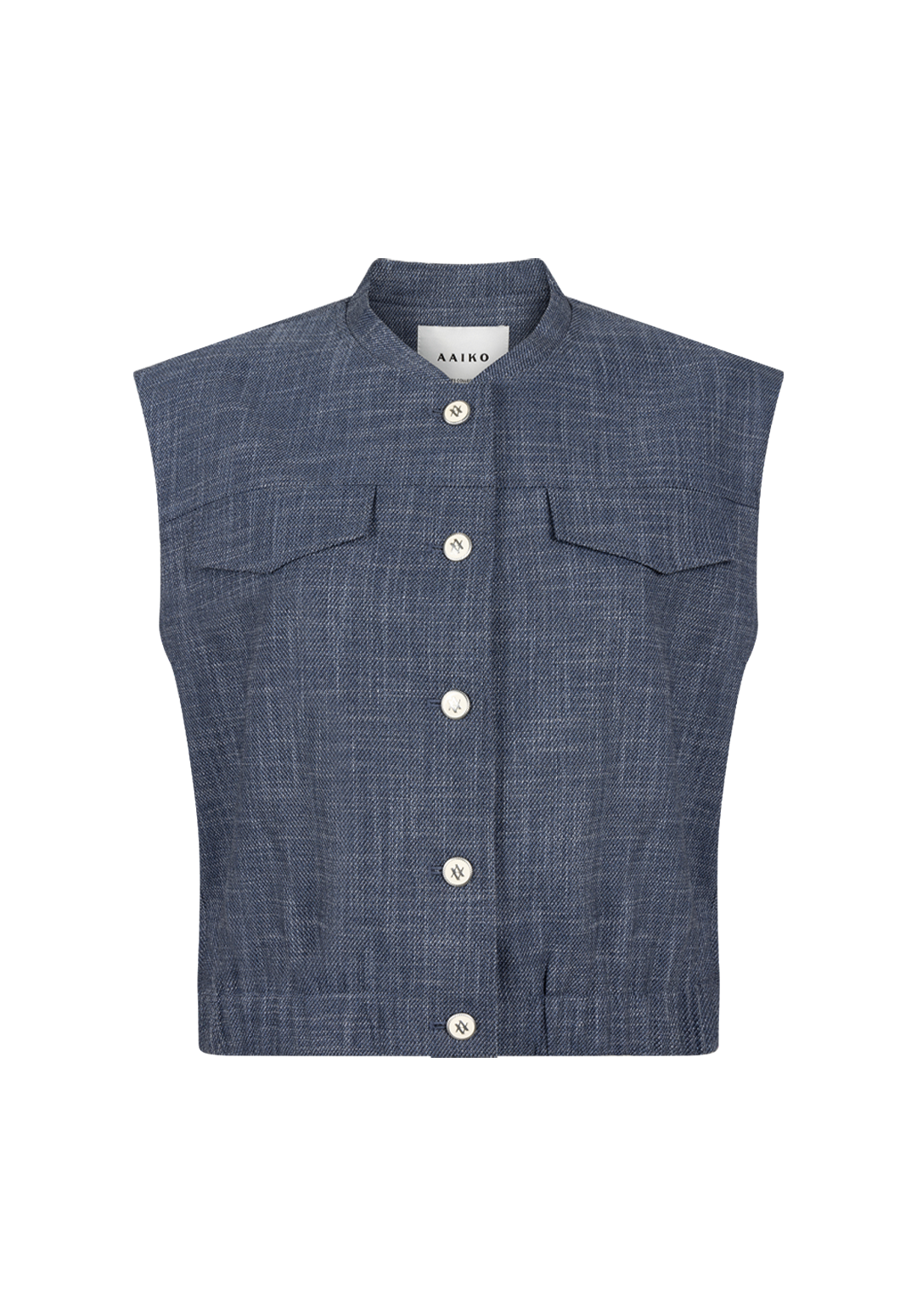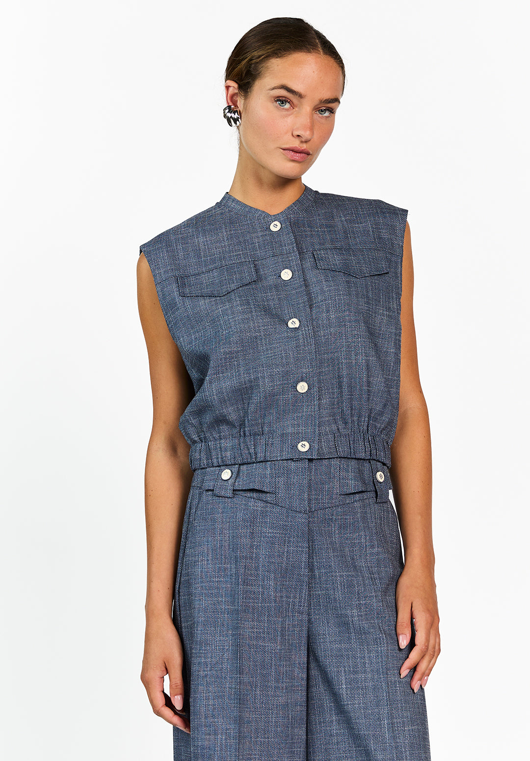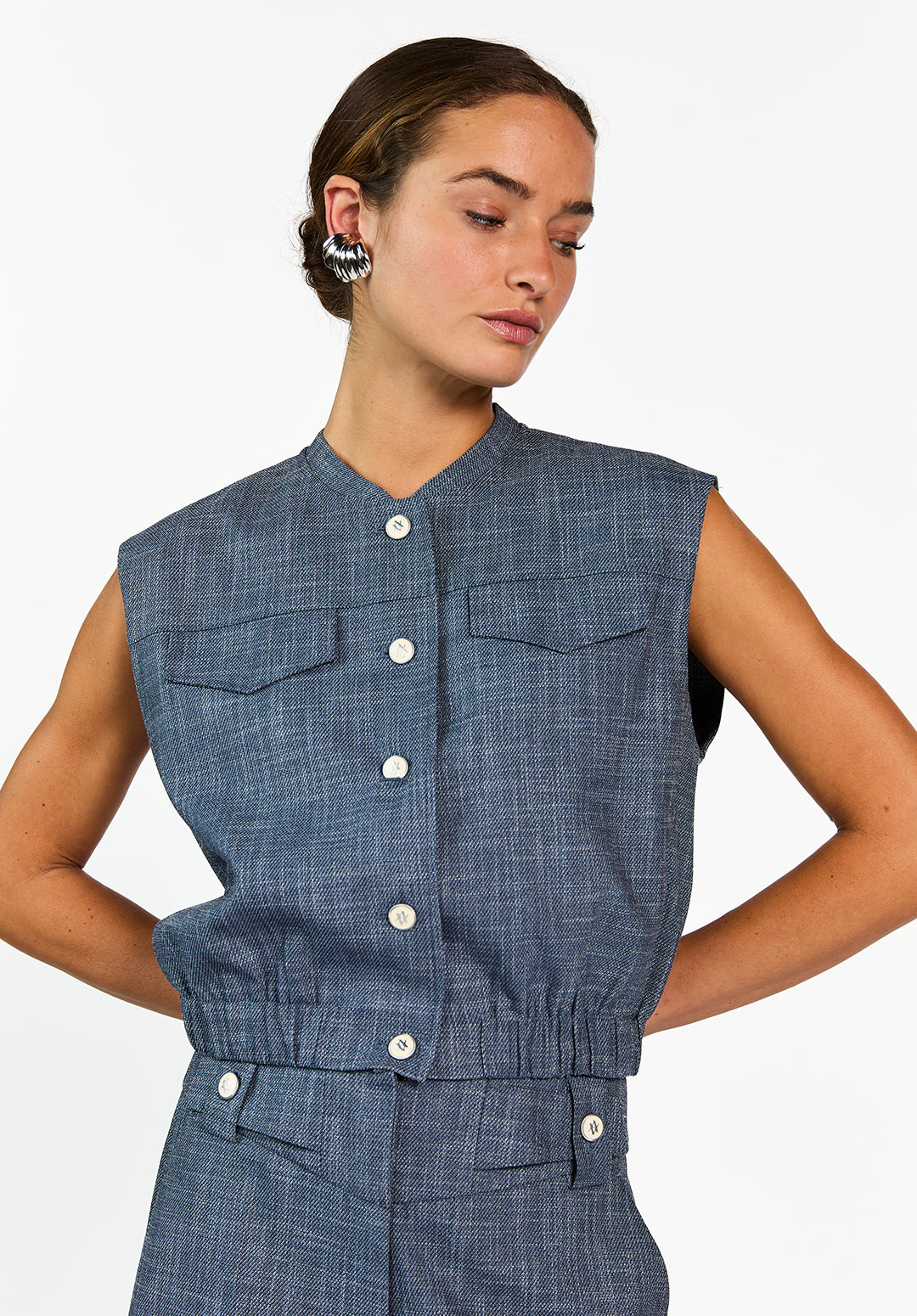 The Olivia gilet is a sleeveless jacket with a utility feel. It features a button closure, patch chest pockets, and an elasticated waistband for a close fit. Made from a sturdy yet soft fabric with a subtle texture. Pair the gilet with the Nore trousers for a modern coordinated outfit.