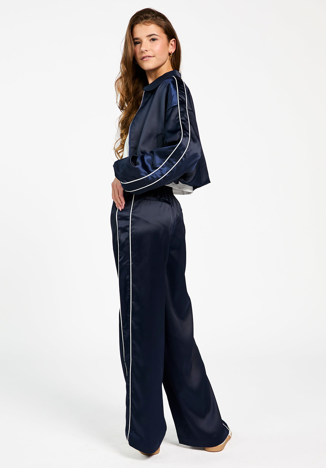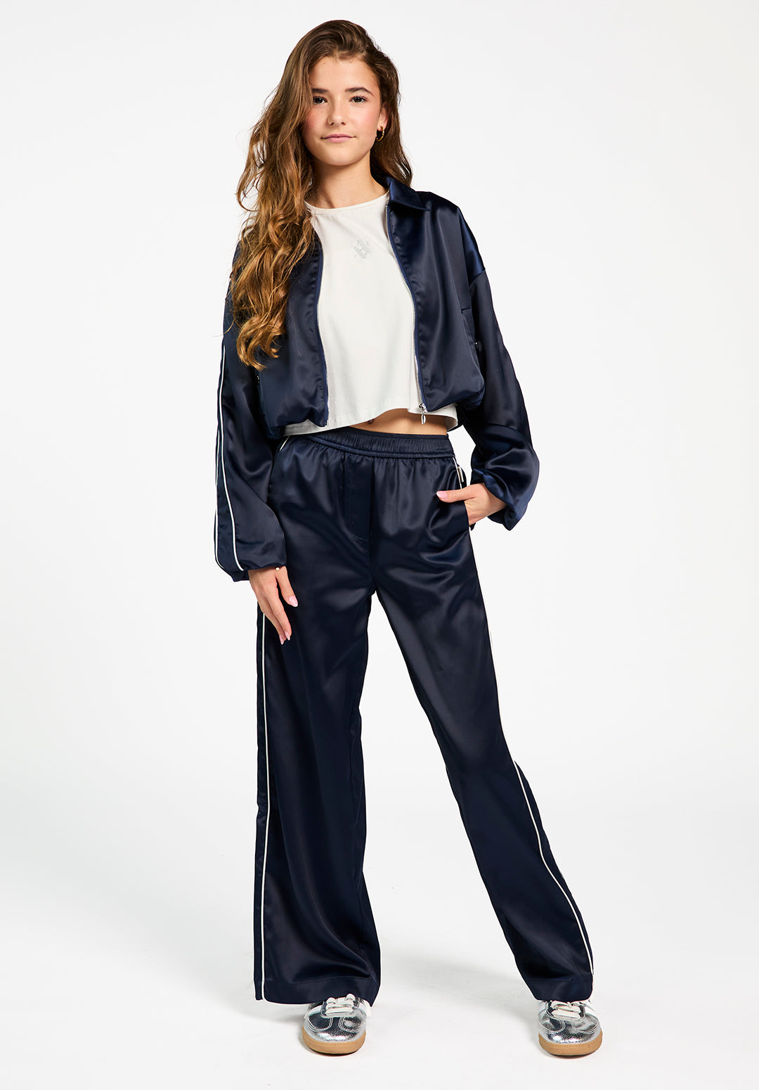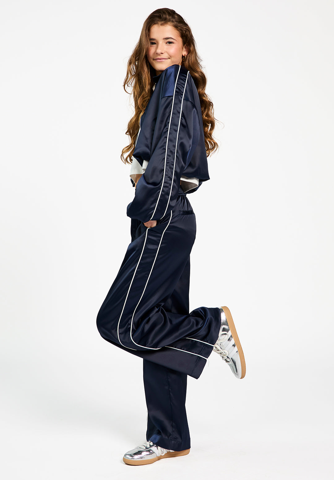 The Aurora pants are designed for girls who like both comfort and style. Made from a soft satin-look fabric, these navy pants have a relaxed fit with straight legs and a subtle sheen. White piping along the sides adds a sporty touch, while the elastic waistband makes them easy to wear all day. For a complete co-ord look, pair these pants with the matching Ilka jacket.