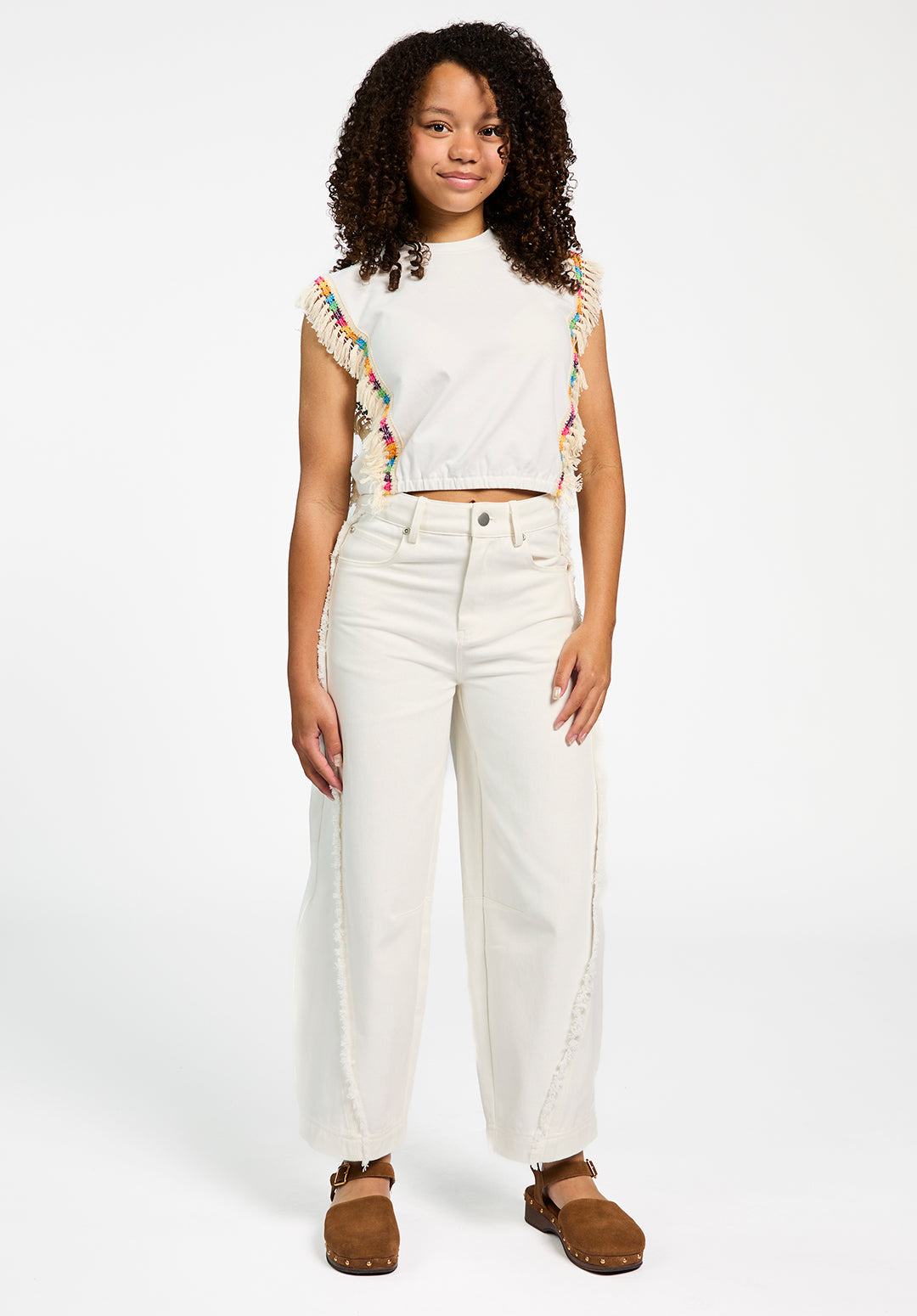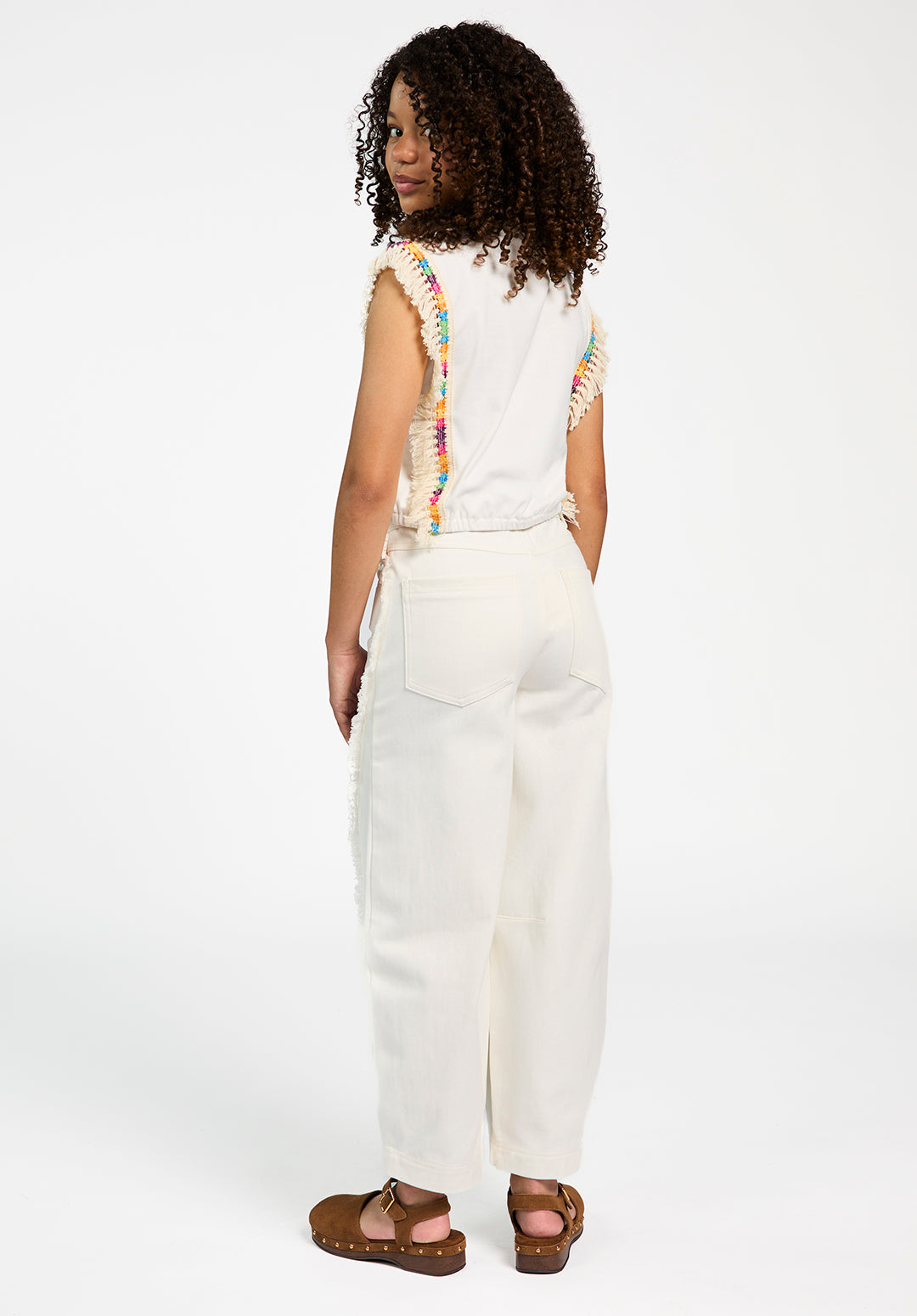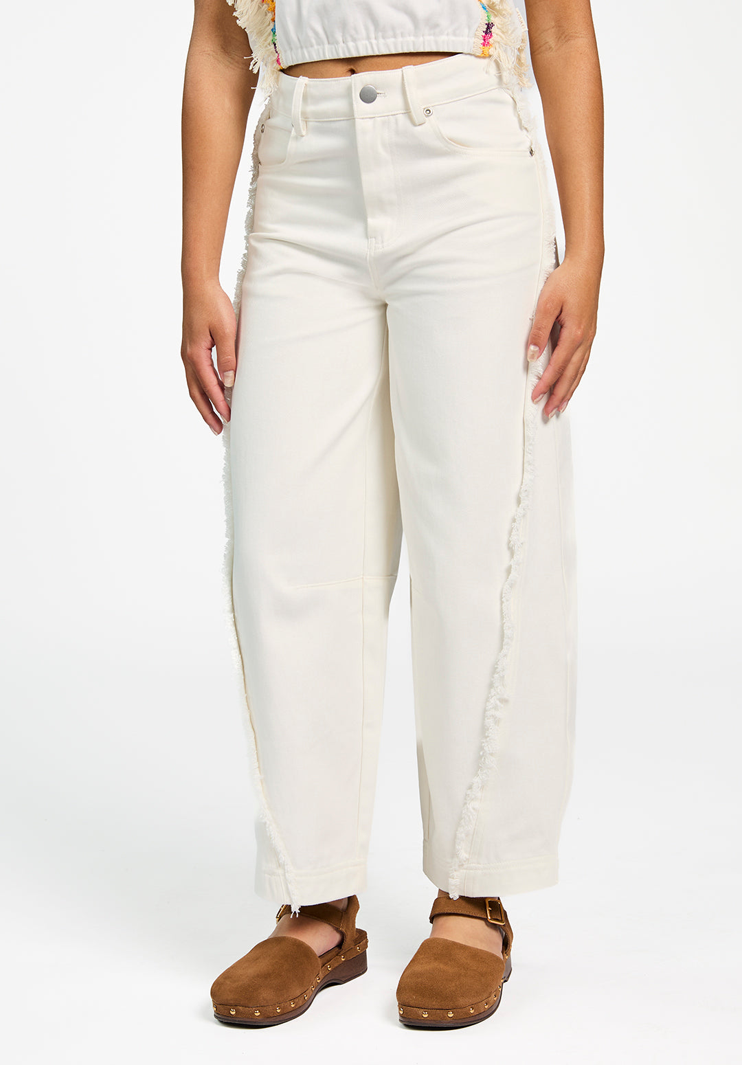 The Quinn barrel jeans are crafted from off-white denim with a relaxed fit and high waist. The rounded, slightly tapered leg creates a modern barrel silhouette, while playful fringed detailing along the side seams adds character. The jeans are crafted from sturdy 100% cotton denim, providing an authentic, non-stretch feel. Pair them with the Rhode fringed top for a striking yet effortless look.