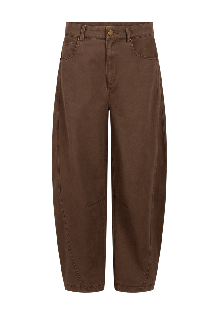 The Quinn Trousers bring together comfort and contemporary style. Designed in a warm green hue, they feature a modern barrel leg fit—loose through the thigh and gently tapered at the ankle. The dropped crotch seam and rounded side seams create a relaxed silhouette with a rugged edge. Crafted from sturdy cotton, this pair holds its shape beautifully wear after wear.