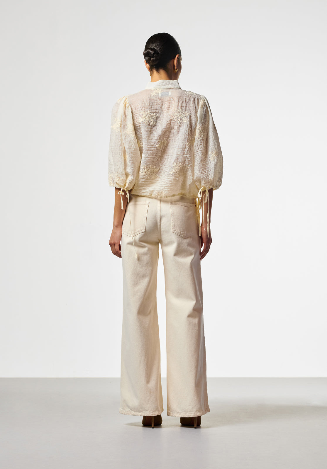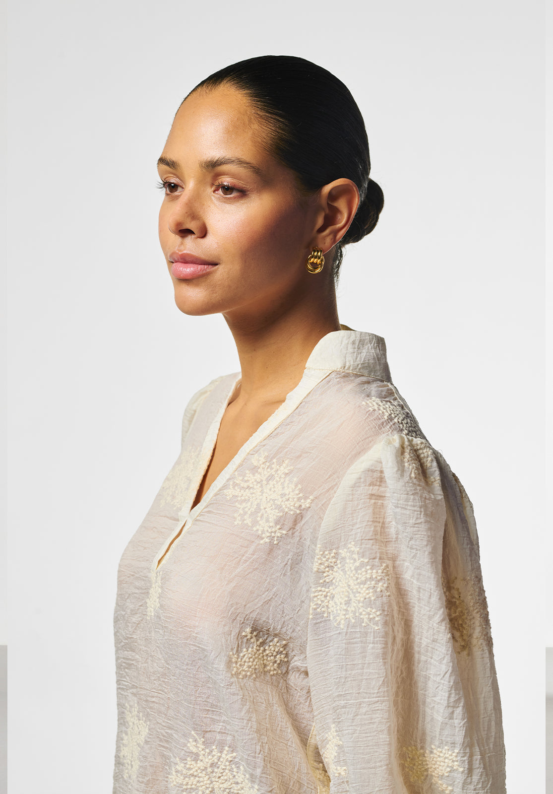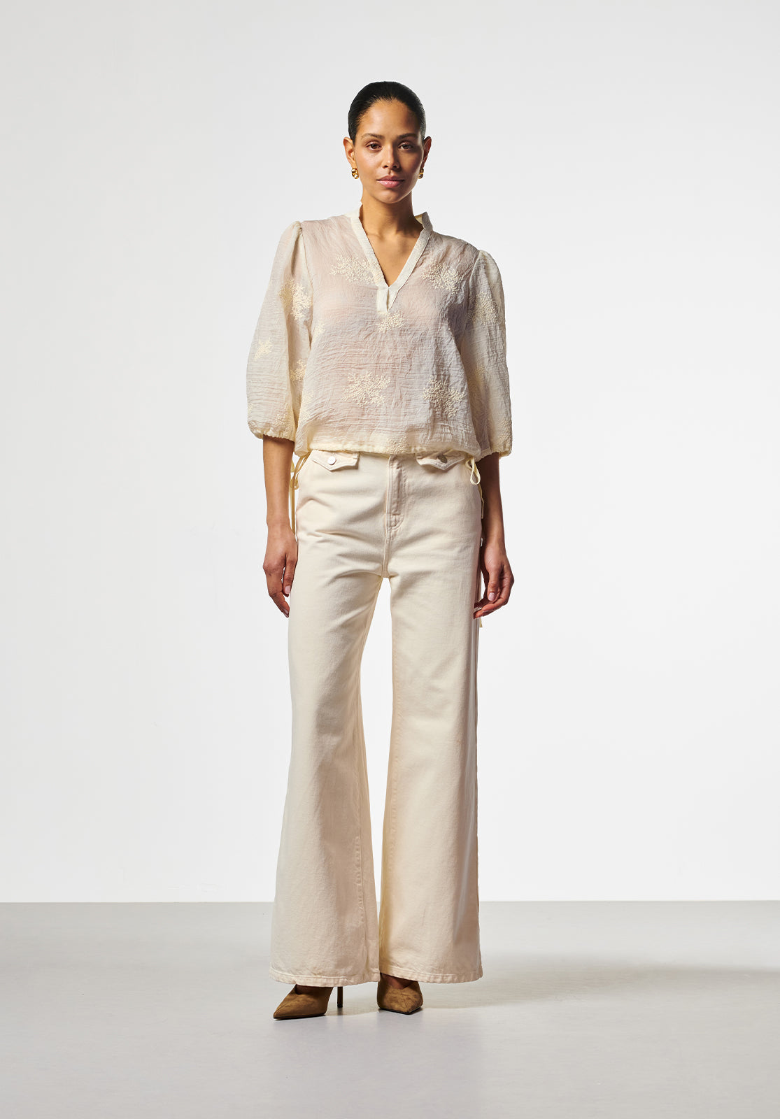 This blouse is crafted from an airy fabric with subtle embroidered details for a refined look. It features a stand-up collar with a V-neck and wide sleeves that reach just below the elbow. The tie details on the sides add a playful and feminine touch. Perfect for an elegant, summery look.