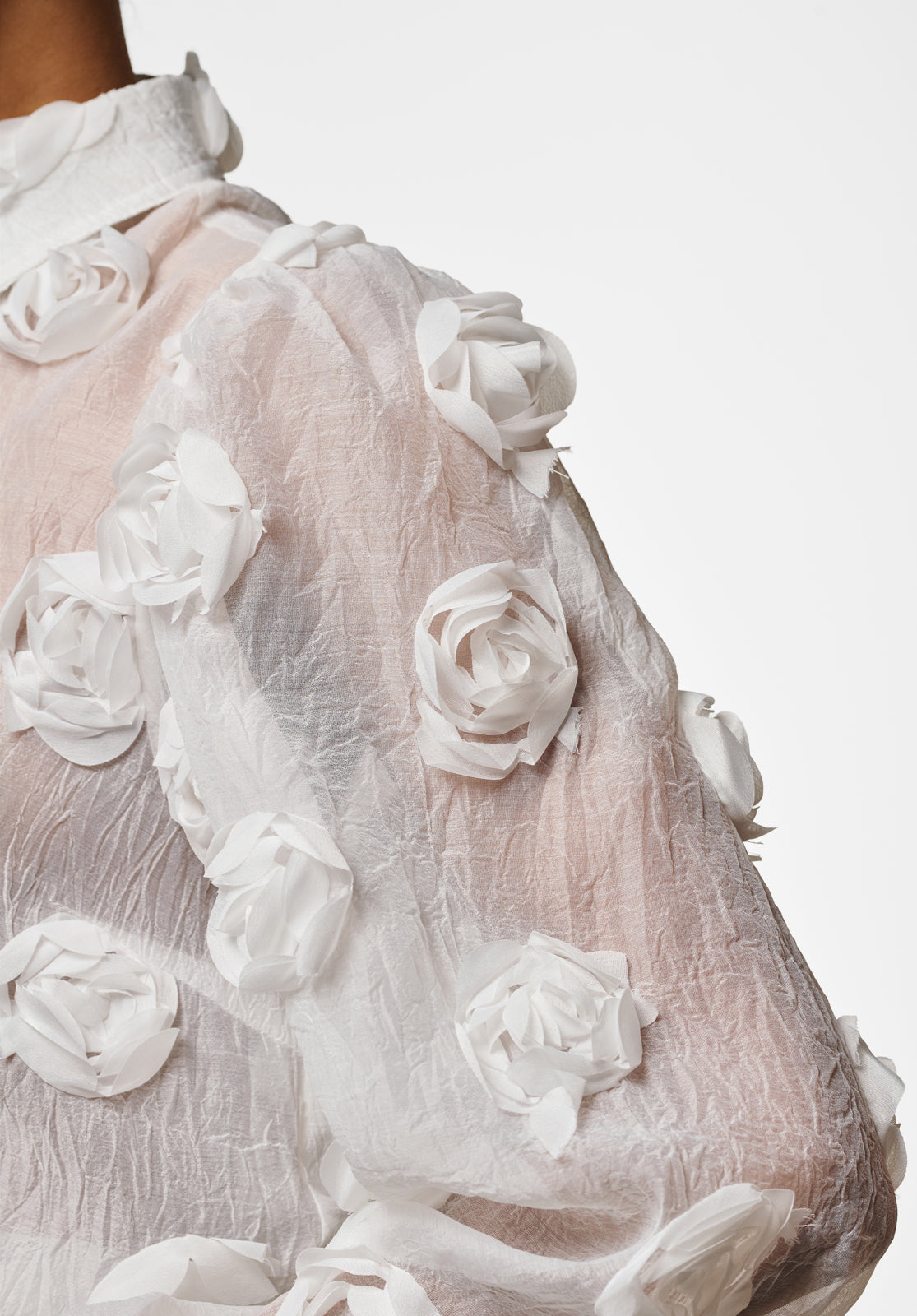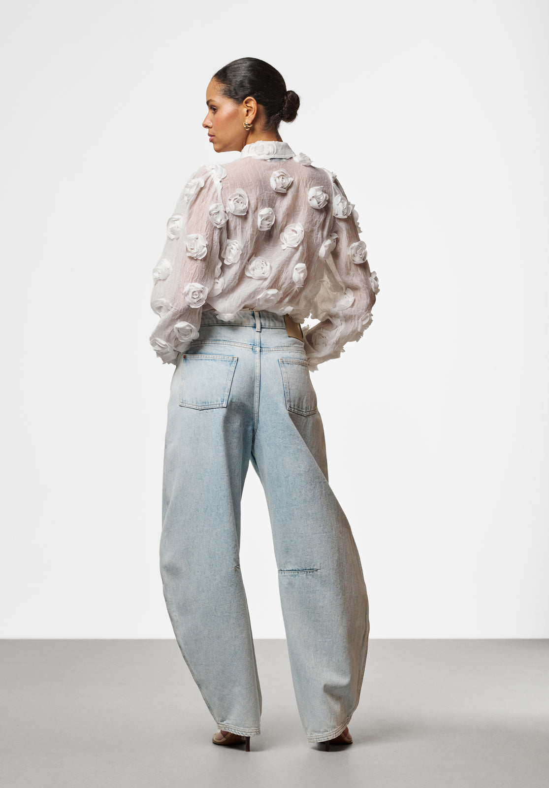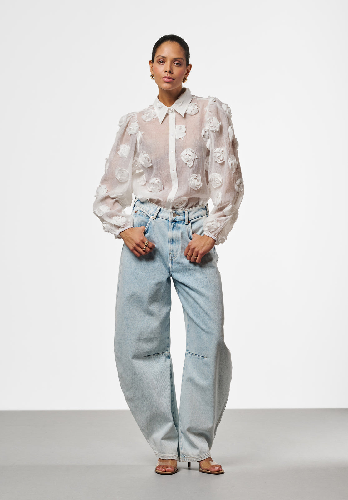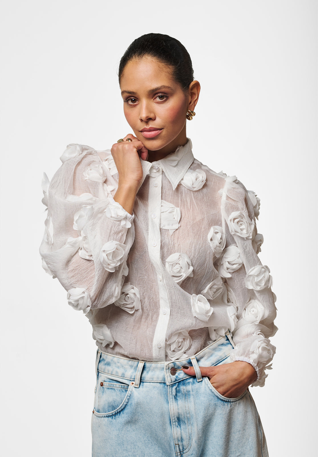 The Lien blouse is a true statement piece with its bold structure and semi-sheer finish. Light and airy, it features 3D floral appliqués that add unexpected texture and depth. The classic collar and button-down front keep the look refined, while voluminous balloon sleeves bring a playful edge. Layer it over a bralette or a simple top to achieve a sophisticated yet modern vibe. Style it with the Chantalle trousers.