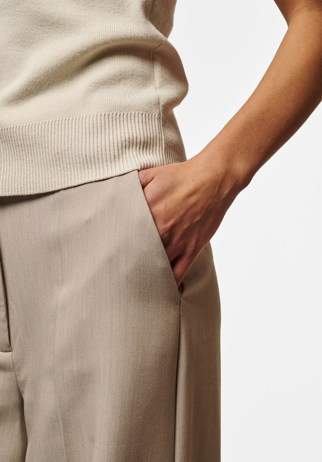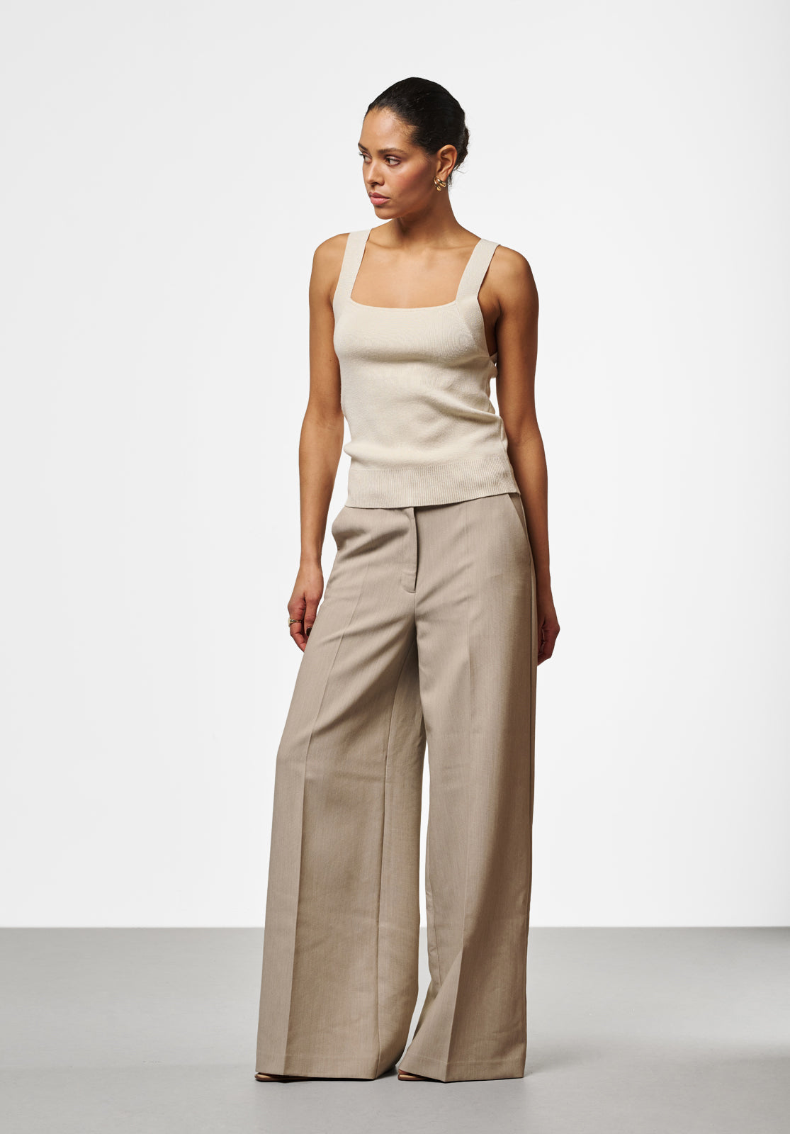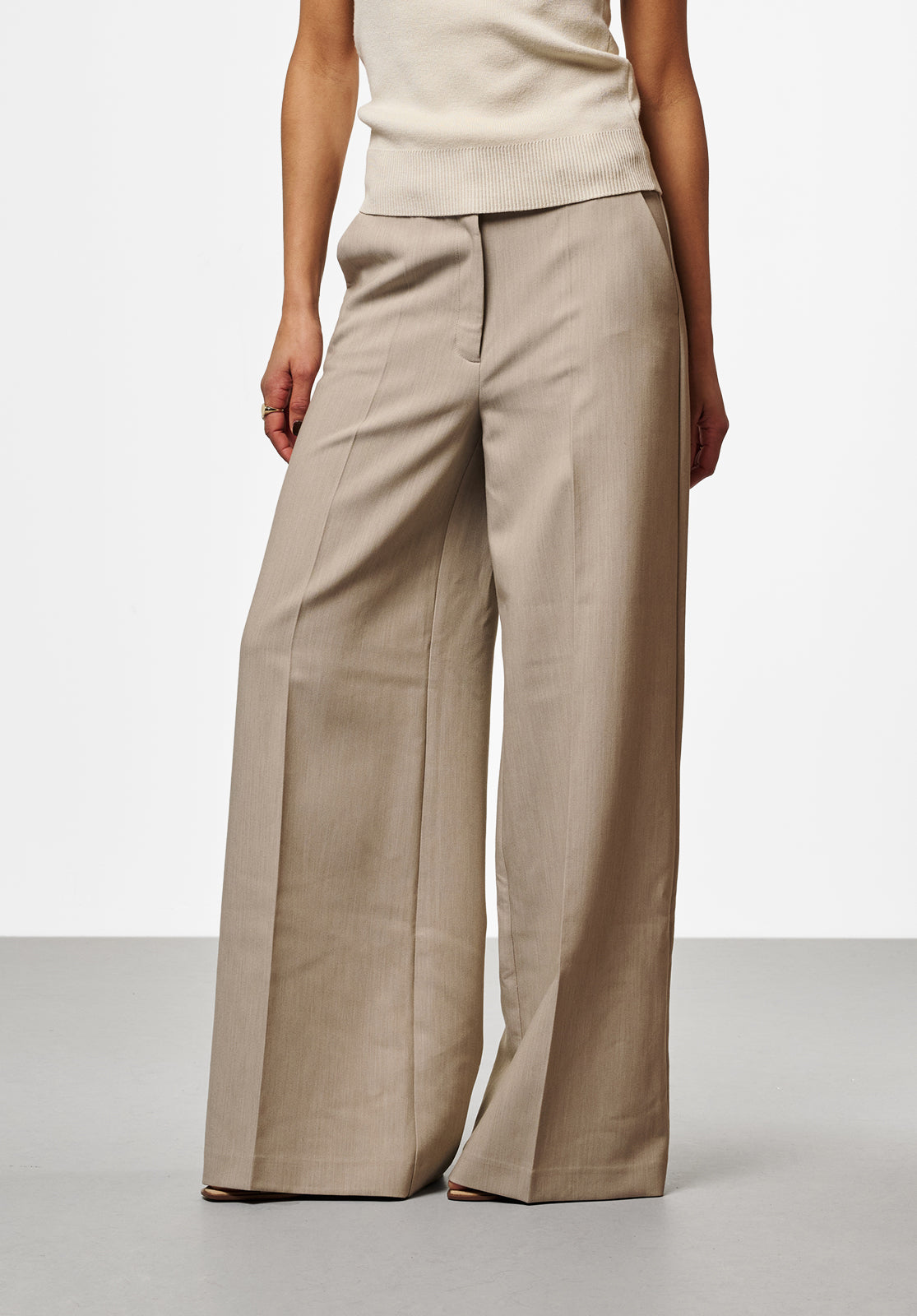 These trousers have a modern, feminine look and are designed with both fit and style in mind. The mid-rise waist ensures a comfortable fit, while the wide legs add depth to the silhouette. A versatile piece that works effortlessly with both formal and more casual outfits.