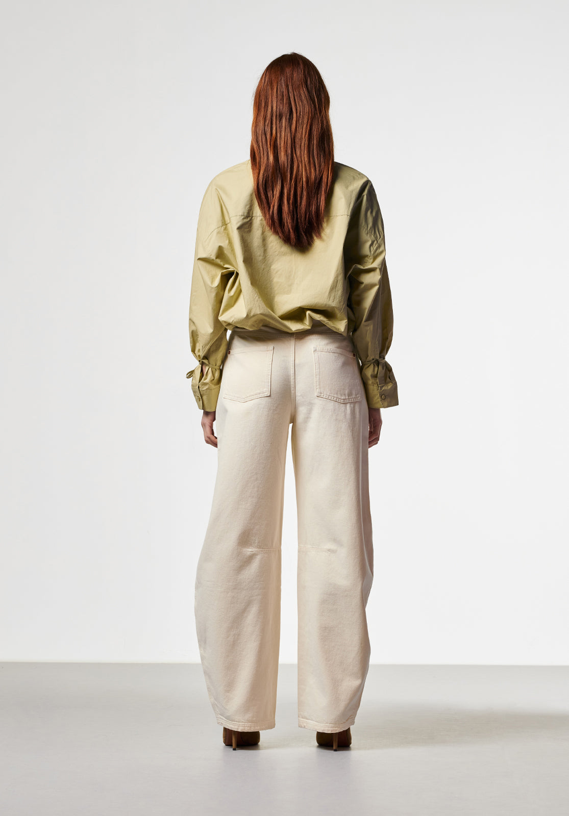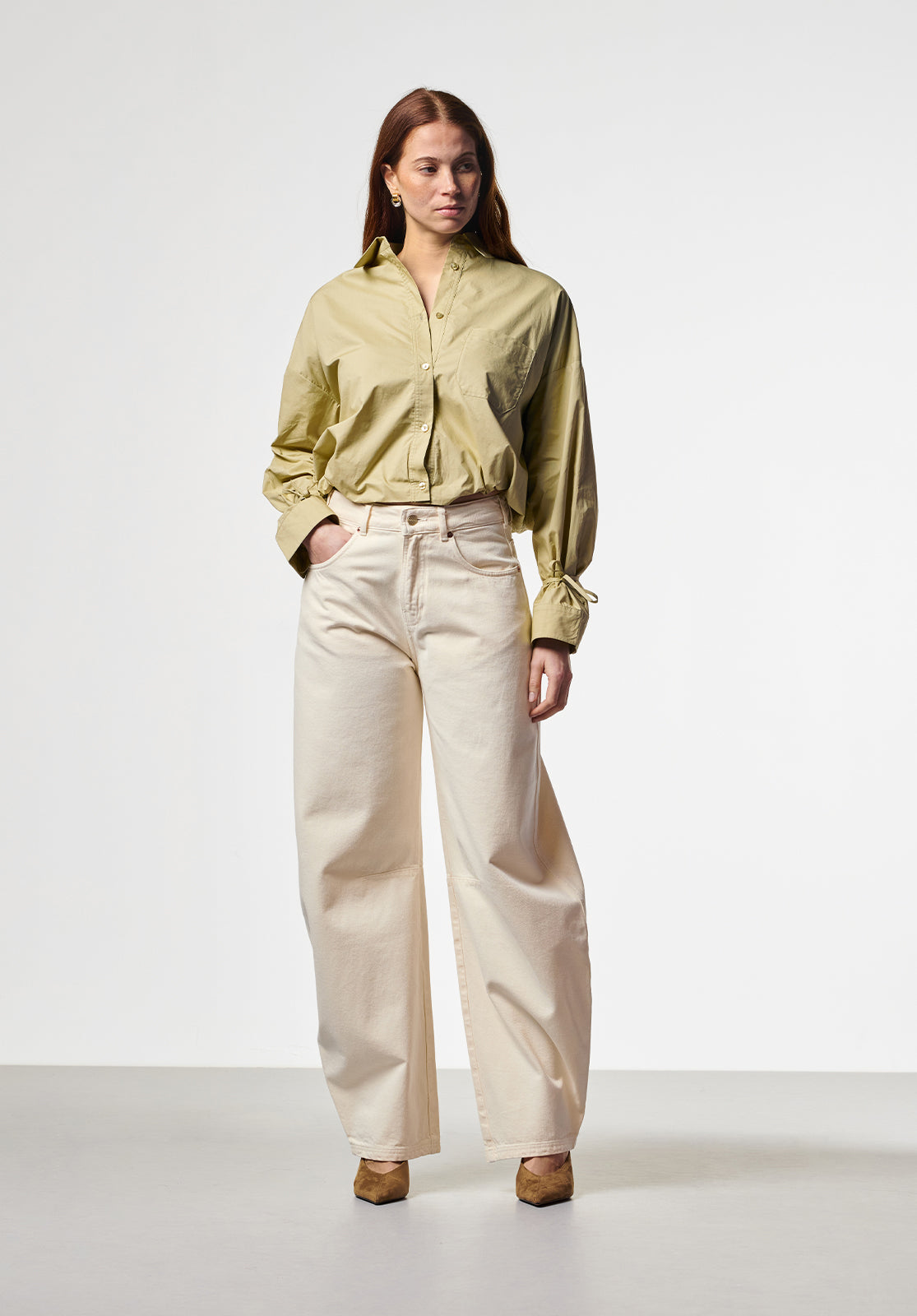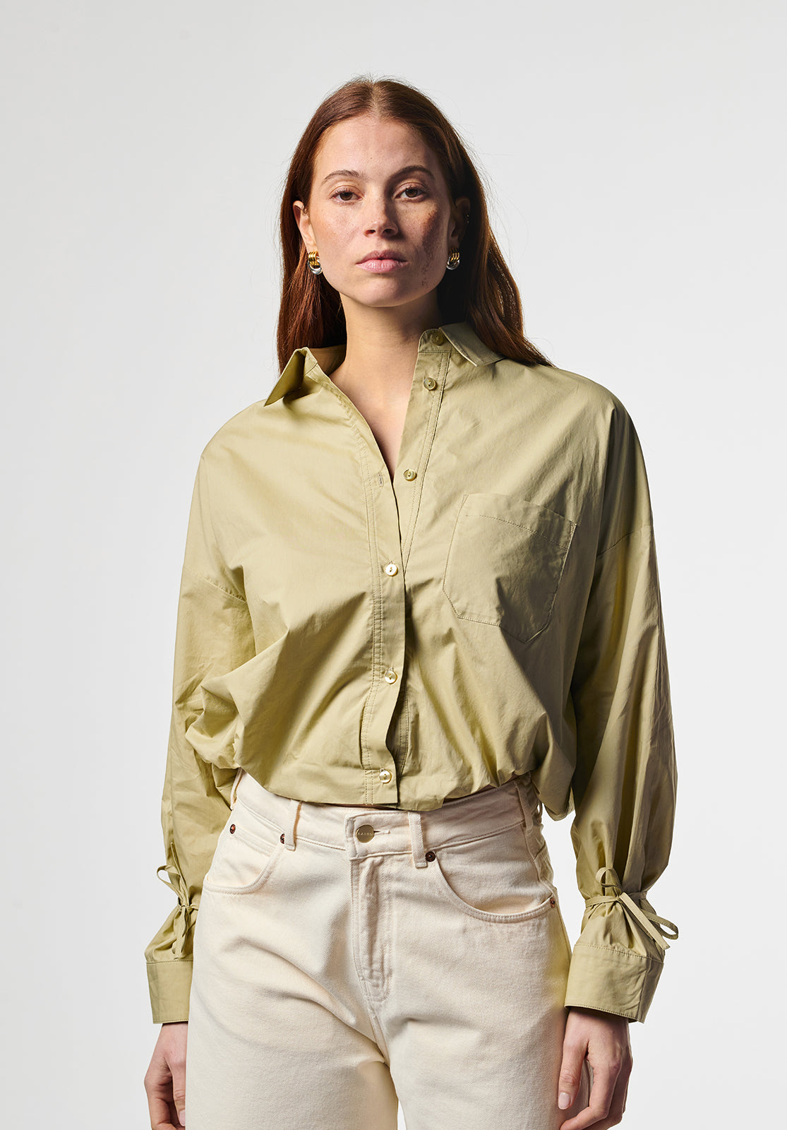 The Mikkie Blouse is a modern classic with a rugged edge. The oversized fit and chest pocket give it a casual look, while the tie-detail sleeves add a refined touch. Made from durable cotton that retains its shape beautifully. Pair with the River trousers for a bold, everyday look.