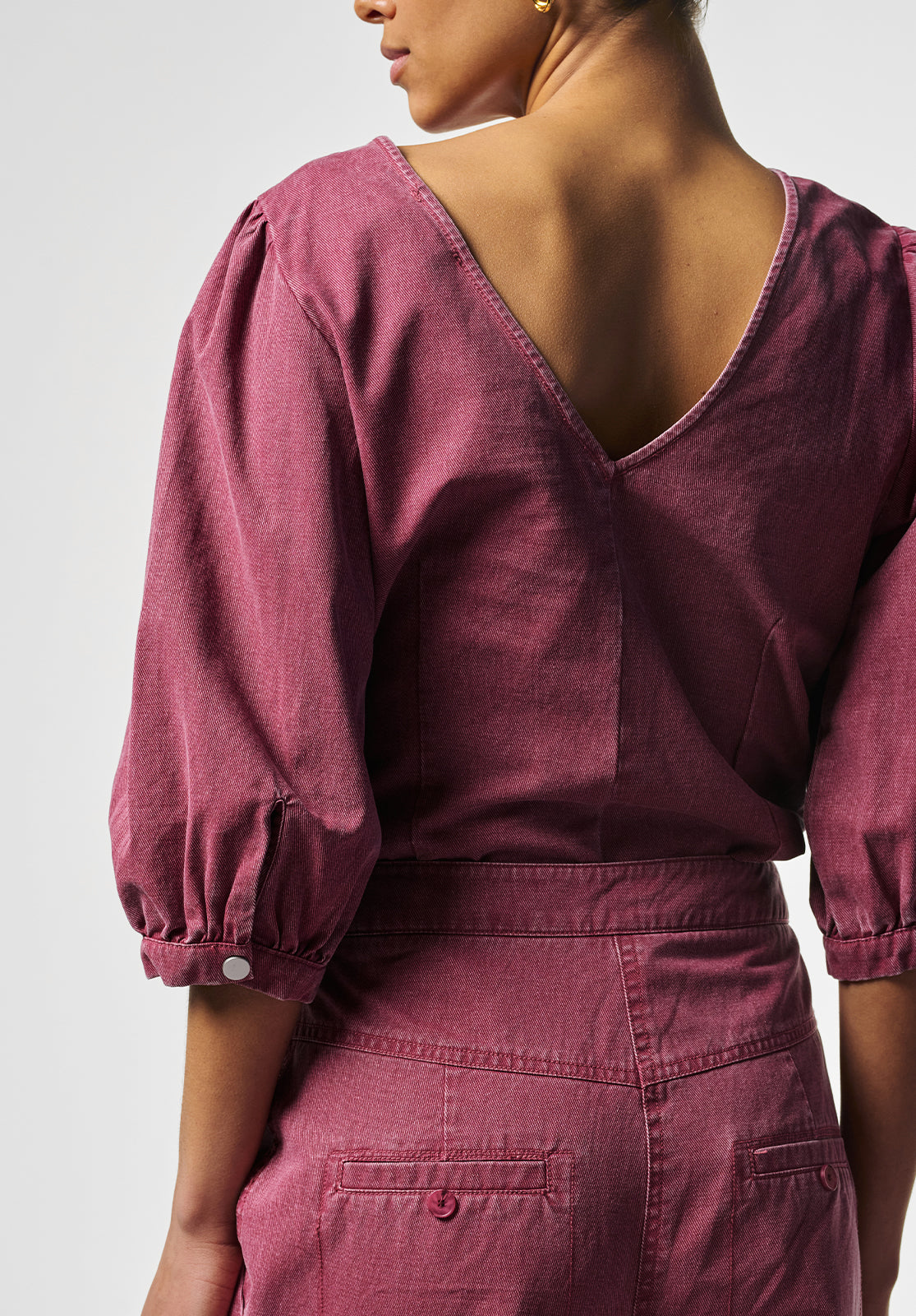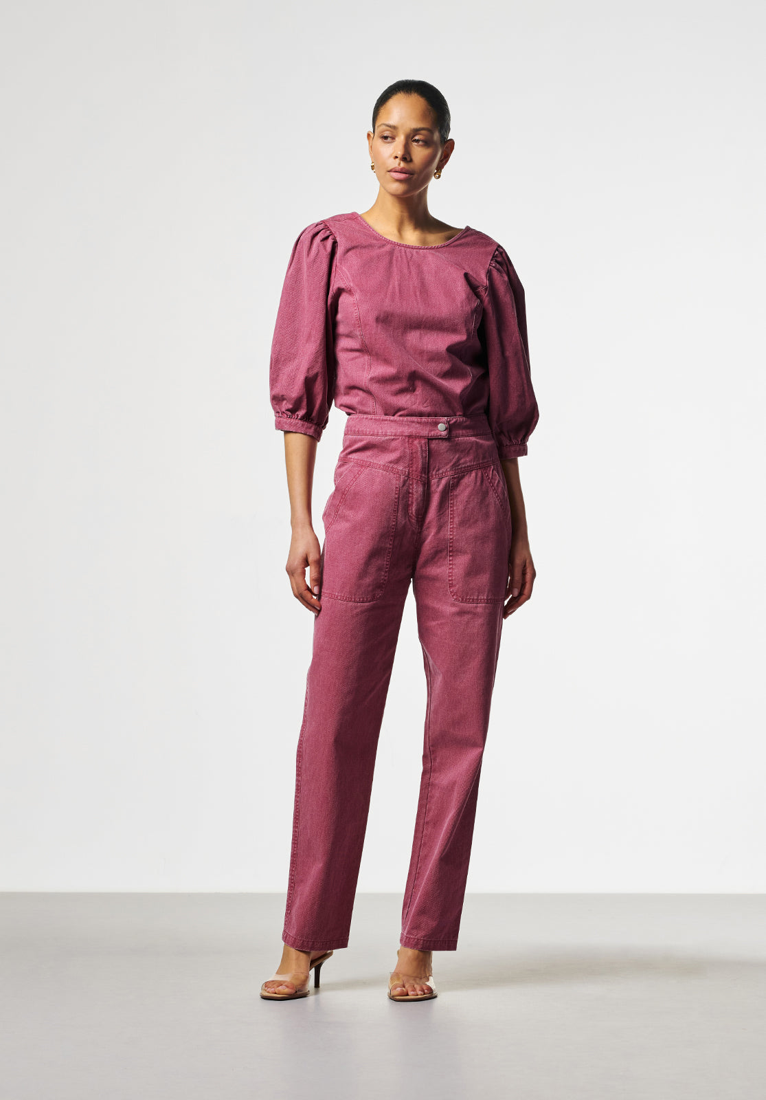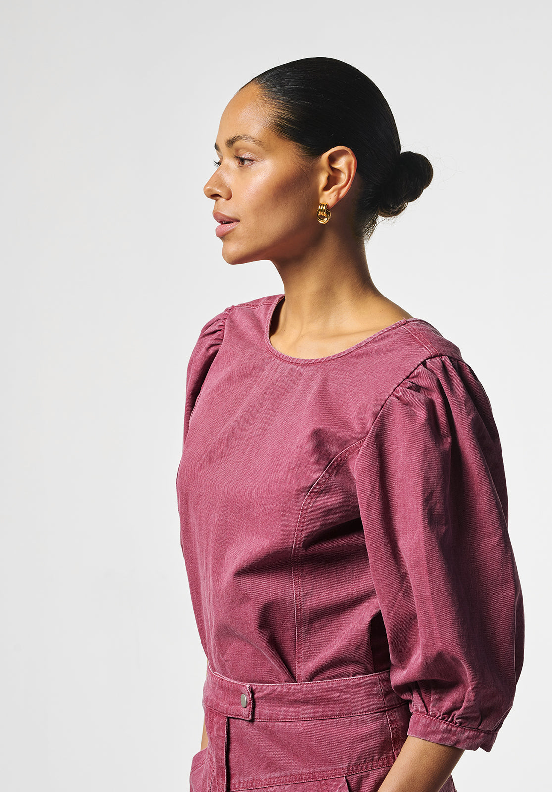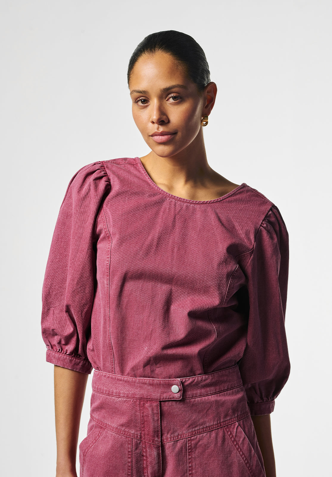 This stylish top has a modern, feminine look thanks to its fitted silhouette and subtle puff sleeves. The soft, sturdy fabric provides structure and comfort, while the round neckline creates a timeless look. Pair it perfectly with the matching Alexa trousers for a contemporary outfit.