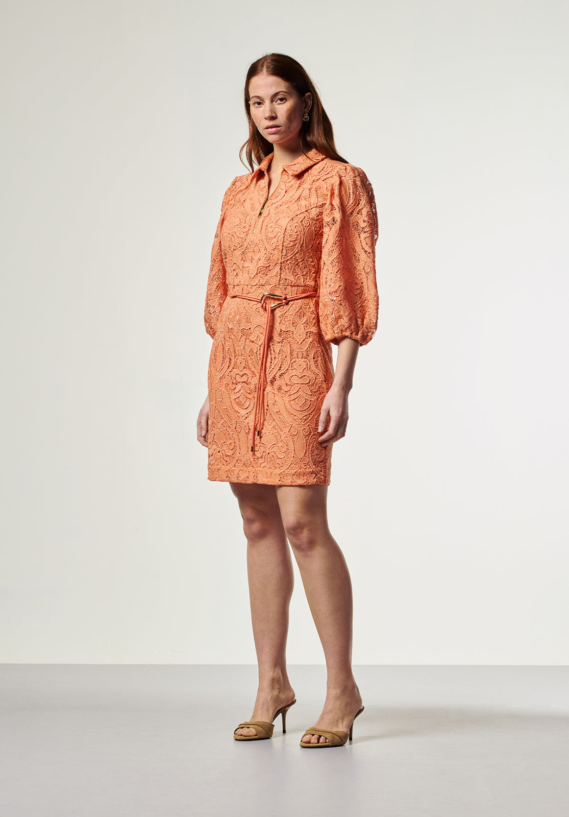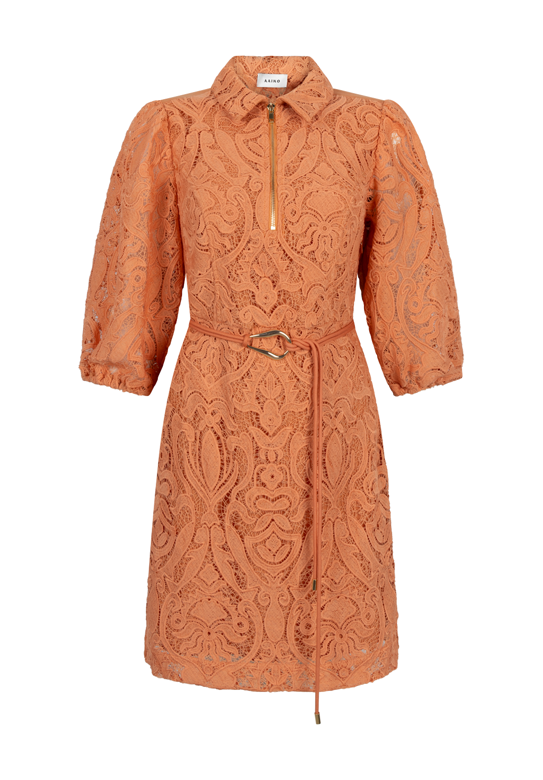 This dress is crafted from delicate lace with a rich, detailed pattern. It features a classic collar and a front zipper for a modern touch. The mid-length sleeves and tie belt at the waist create a feminine silhouette. An elegant choice for a special occasion.
