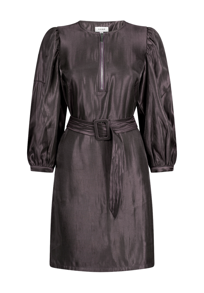 The Semira Dress features long puff sleeves and a round neckline that add an elegant touch. A front zipper at the neckline introduces a modern edge, while the matching belt cinches the waist for a flattering silhouette. Both stylish and comfortable, this versatile dress is perfect for any occasion—from casual outings to more formal events.