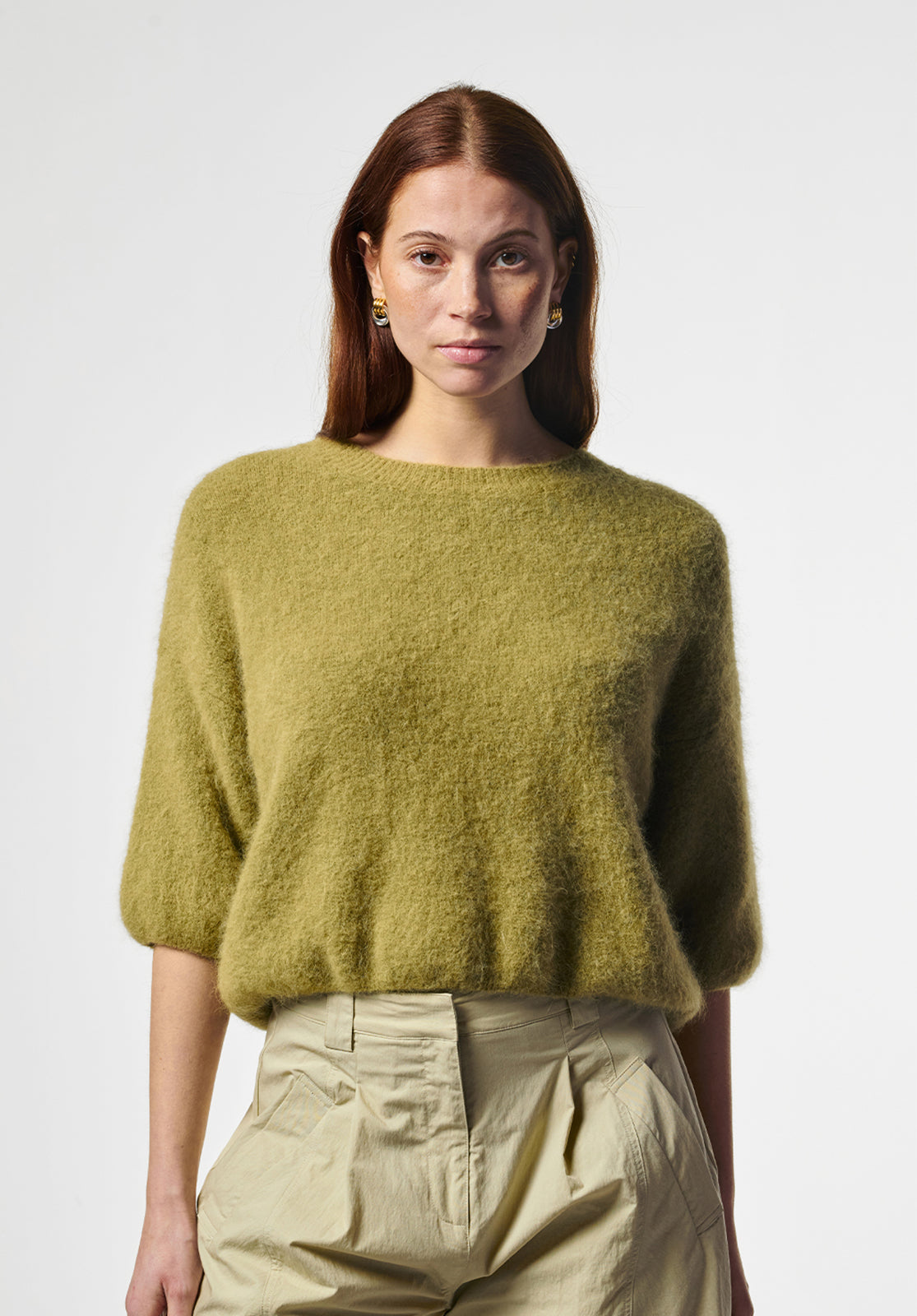 The Lani Knit is a soft sweater with a relaxed fit and half-length sleeves, perfect for in-between seasons. The slightly fluffy knit adds a cozy texture while keeping the look refined. Designed with a round neckline and dropped shoulders for an effortless silhouette. Pair it with the Sacha barrel jeans for an easygoing, casual look.