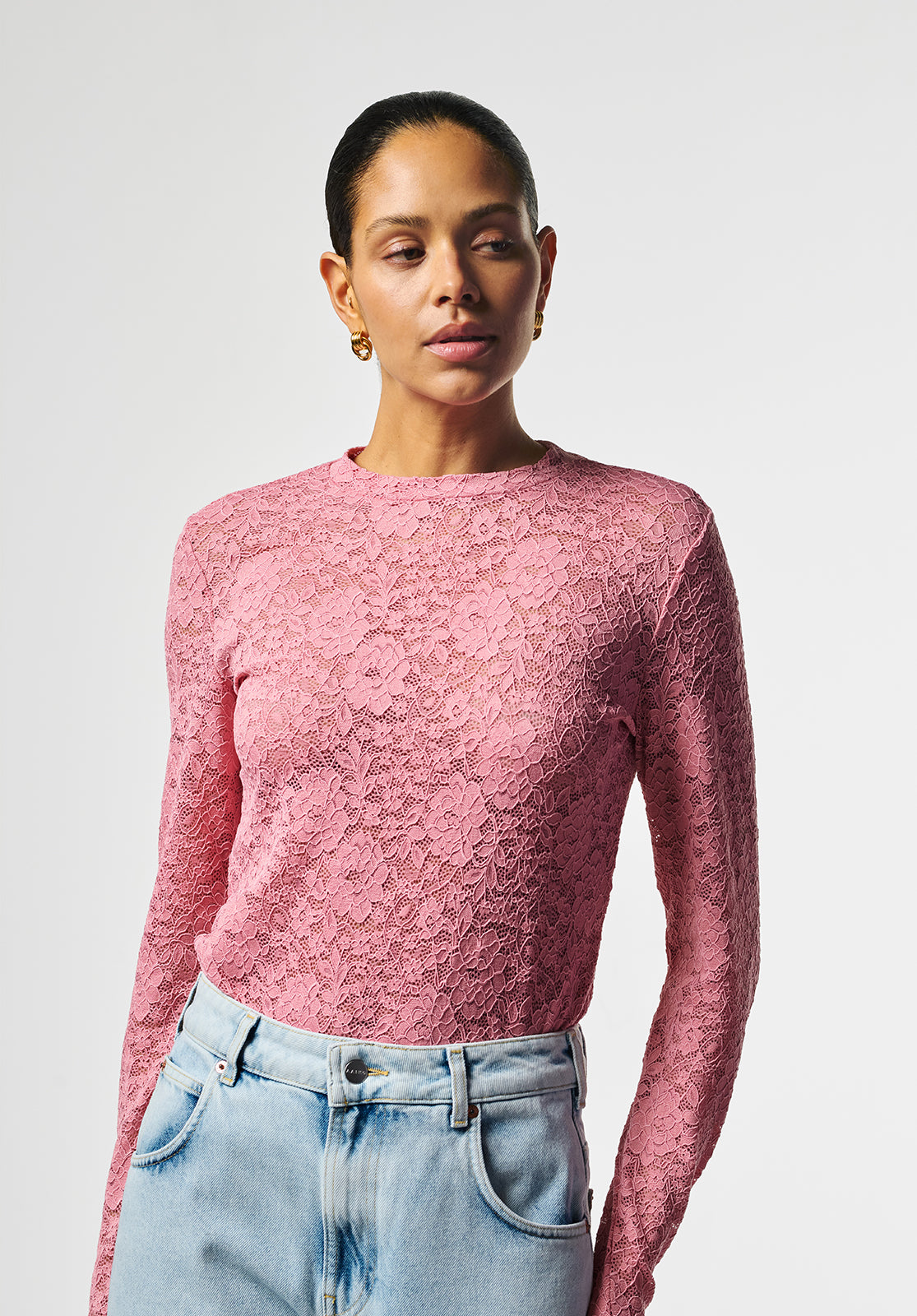 The Mason Top is a fitted piece made from soft, semi-sheer lace with a delicate floral pattern. It features a subtle stand-up collar and long sleeves, adding a modern touch to its romantic texture. Perfect for layering over a bralette or under a blazer to play with contrast and depth. Style it with the Chantalle trousers for a refined look.