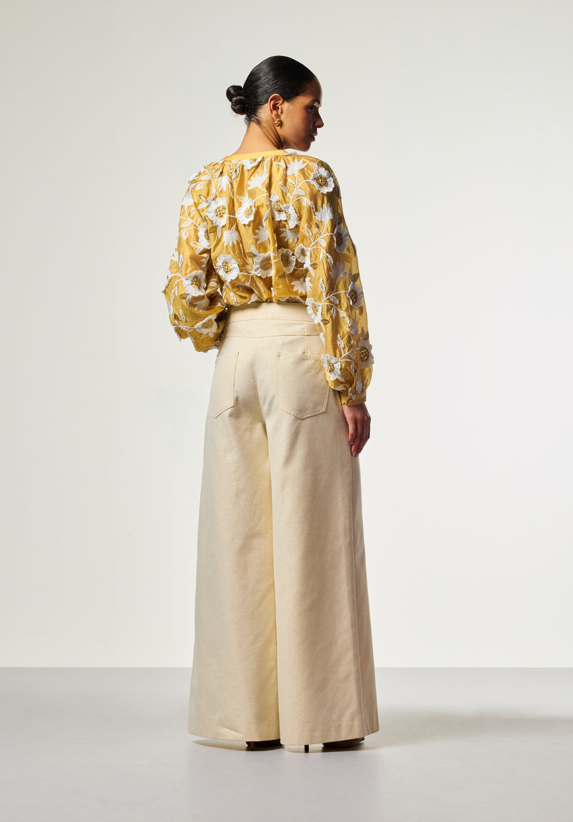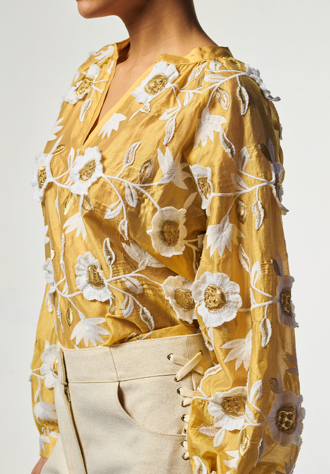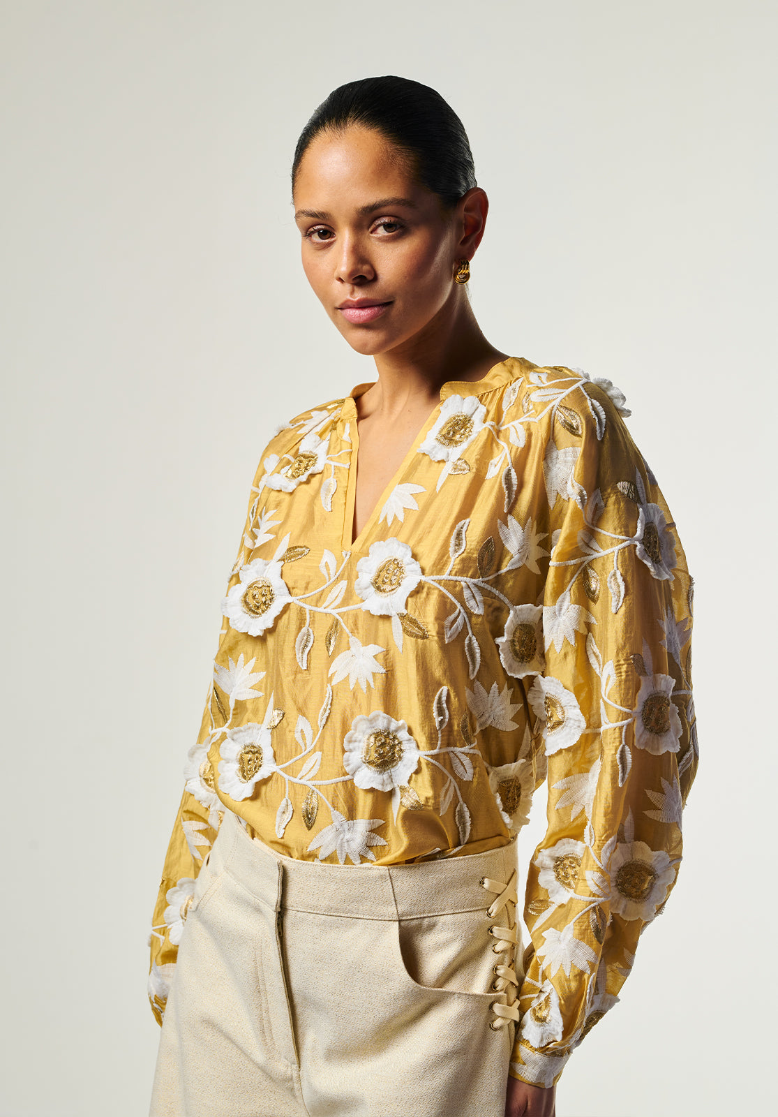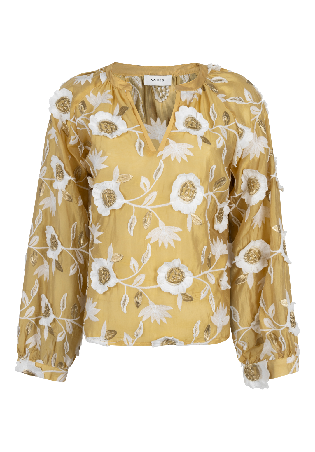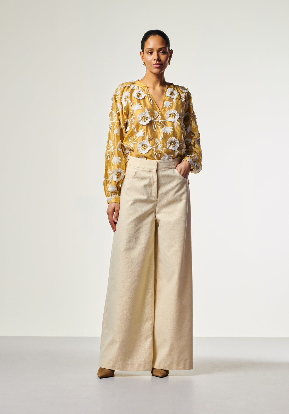The Alanza Blouse in gold is an effortless statement piece, featuring delicate floral embroidery in white and gold. Crafted from a sheer fabric and lined through the body, it offers a refined balance of elegance and subtle shine. The straight fit and V-neckline create a clean, flattering silhouette, while the softly puffed sleeves and narrow cuffs add a touch of feminine structure. Finished with a subtle button closure at the back. Style it with the Sacha barrel jeans for a modern, effortless look.