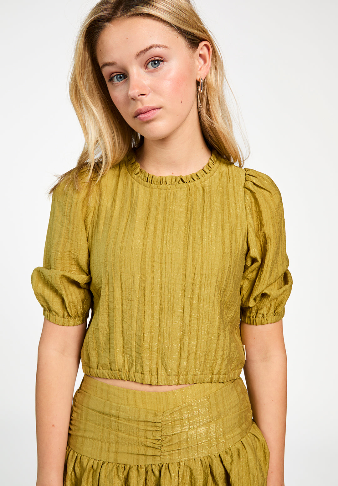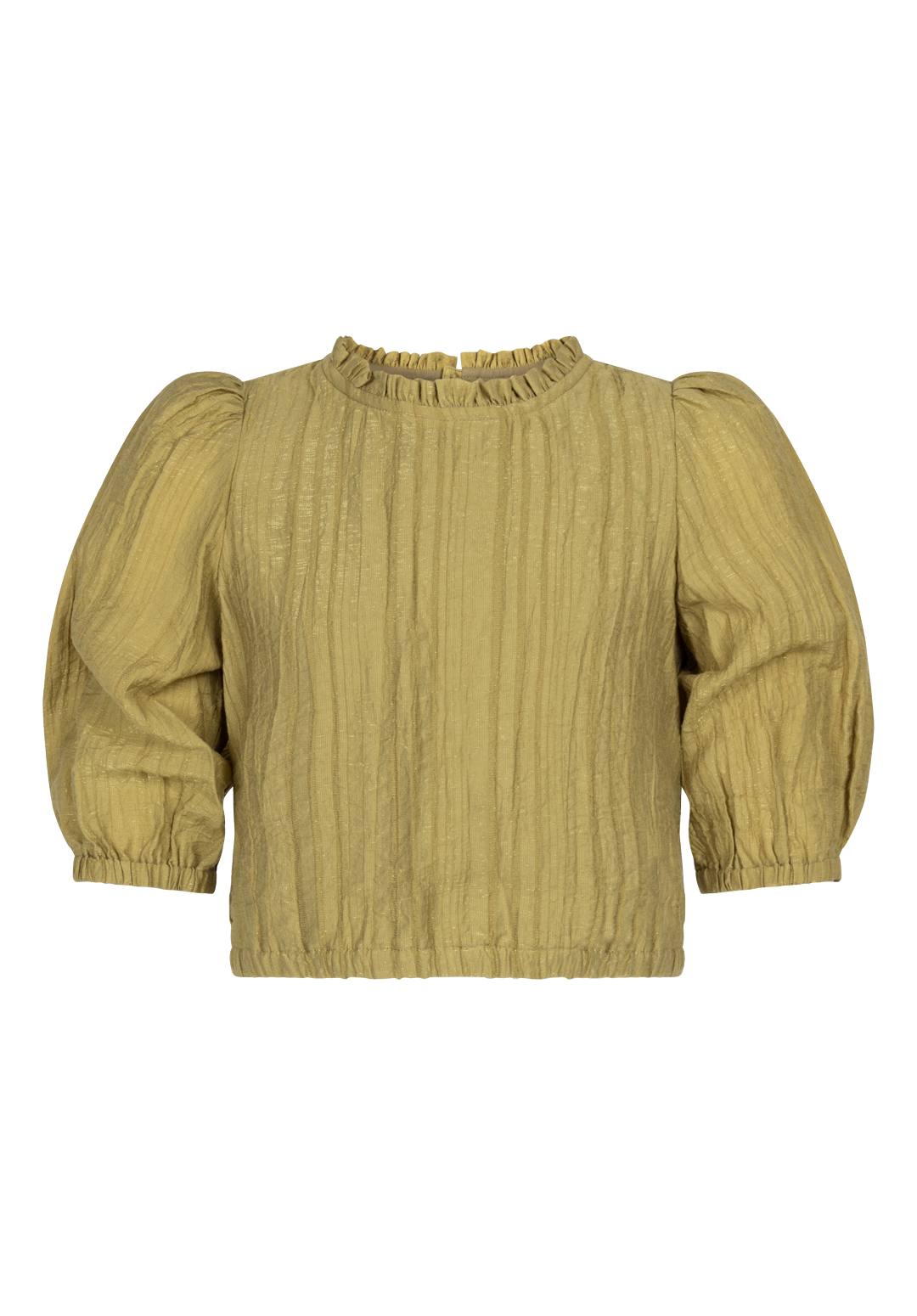 The Alika top is a fun and easy piece to brighten up your wardrobe. Its light, pleated fabric and fresh yellow-green shade give it a playful, summery feel. The top features short puff sleeves, a round neckline with a subtle ruffled edge, and an elastic hem for a comfortable fit. The garment is finished with a small button closure at the back. Pair it with the matching Izzy Skirt for a full look.