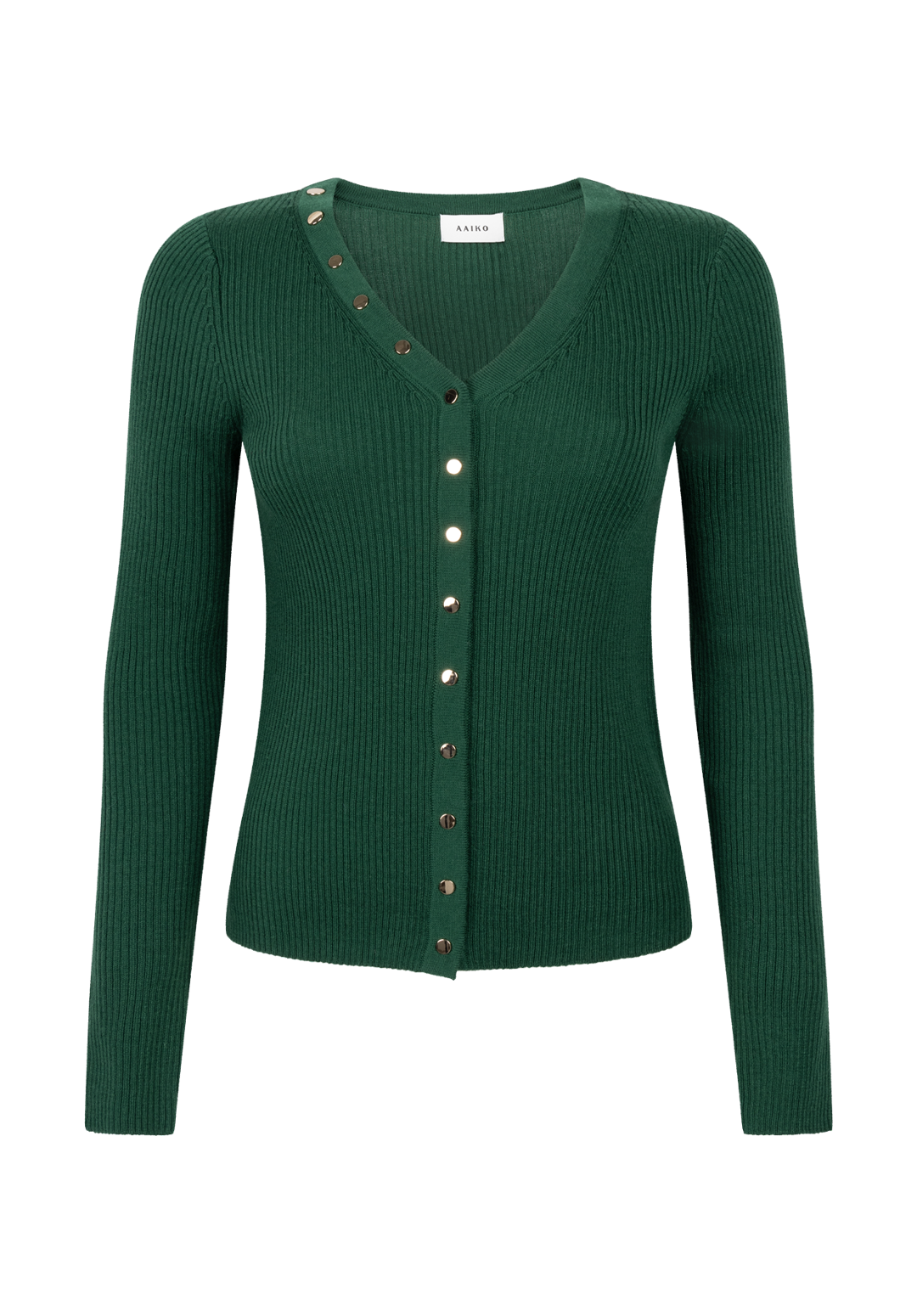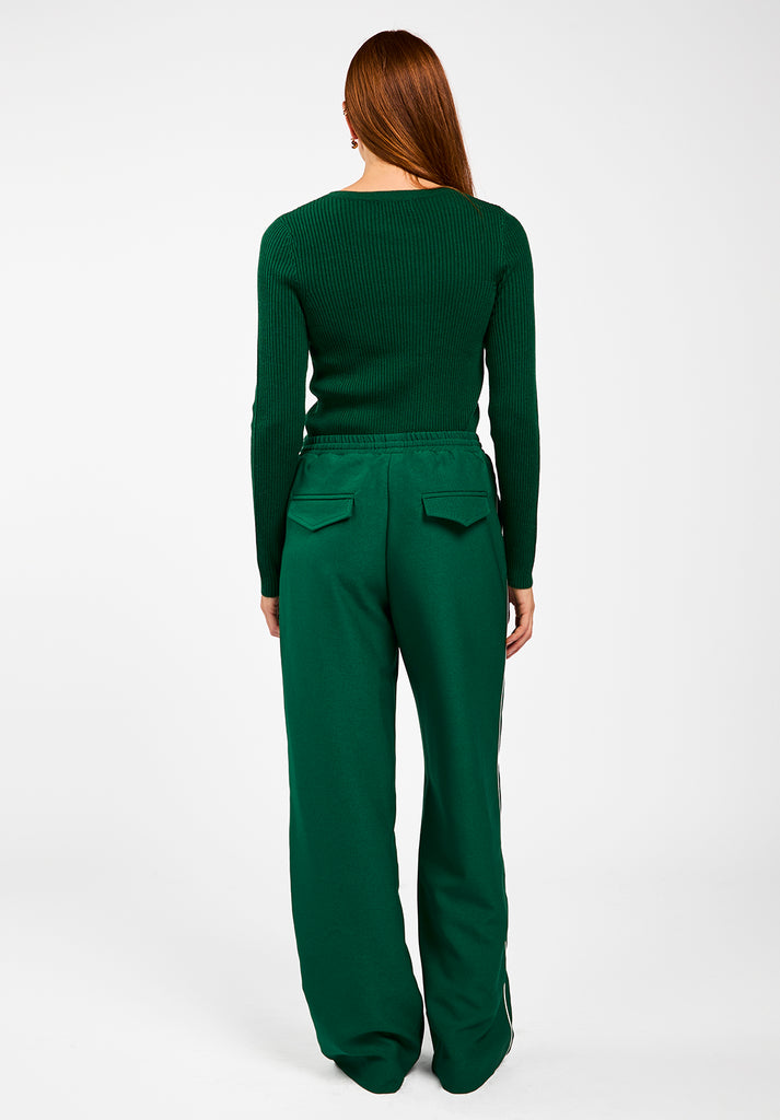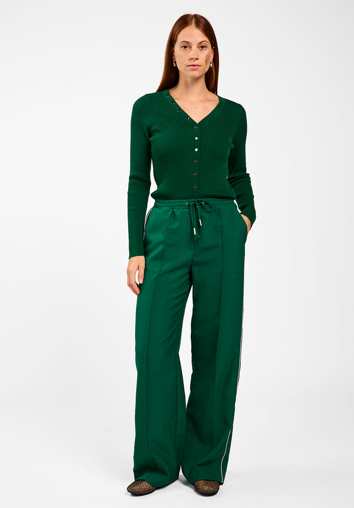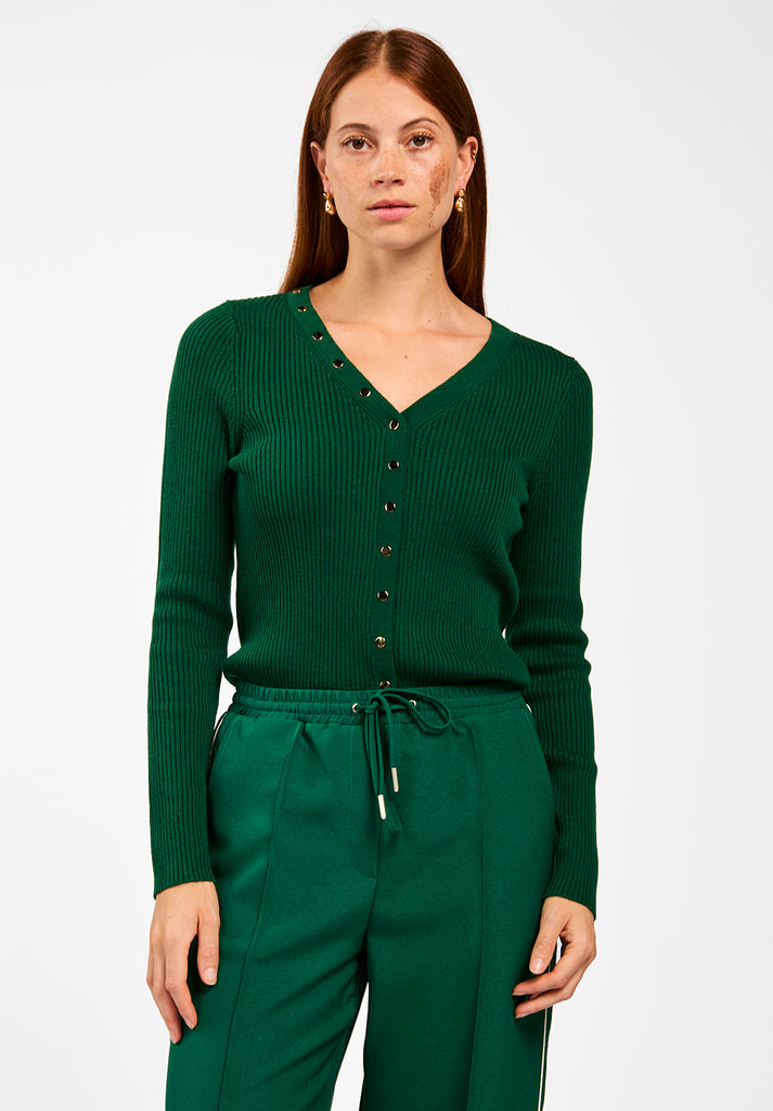 The Amalia cardigan is your go-to knit for those days when comfort and style need to work together. Made from a soft, stretchy ribbed fabric, this fitted cardigan hugs the body just right. The V-neckline features bold buttons placed in a striking diagonal line, adding a unique accent. Combine with green trousers Elda.