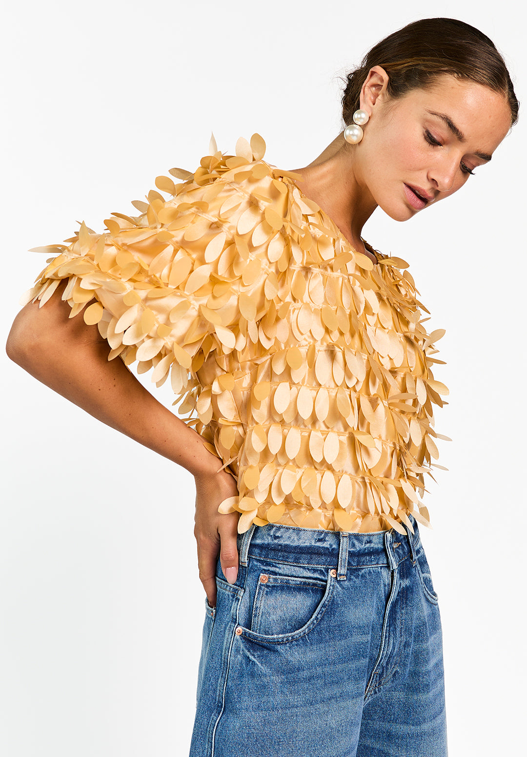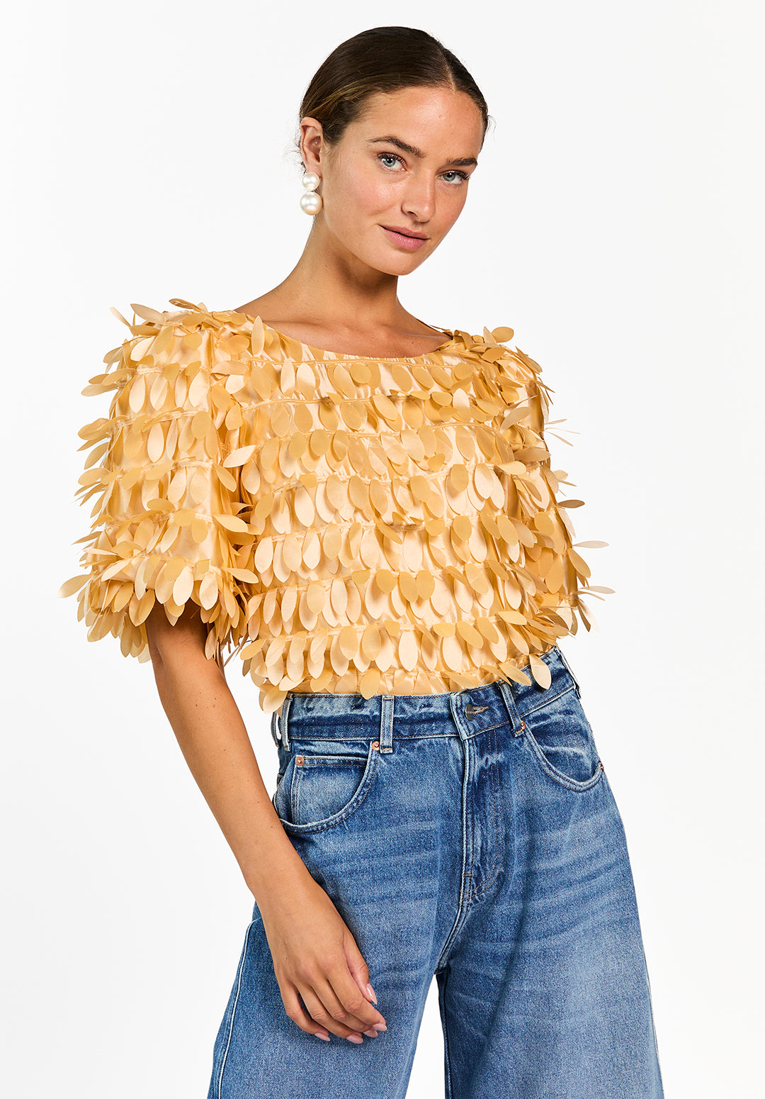 The Angelina Top is a real eye-catcher with a playful yet refined look. It's completely covered in pleated leaf appliqués, creating a striking texture and texture. Made of a sturdy, satiny fabric with a subtle sheen, the straight fit and deep V-neck back add a feminine touch. Perfect for a dinner party or a special occasion. Pair it with Sacha barrel jeans for a bold, modern look.