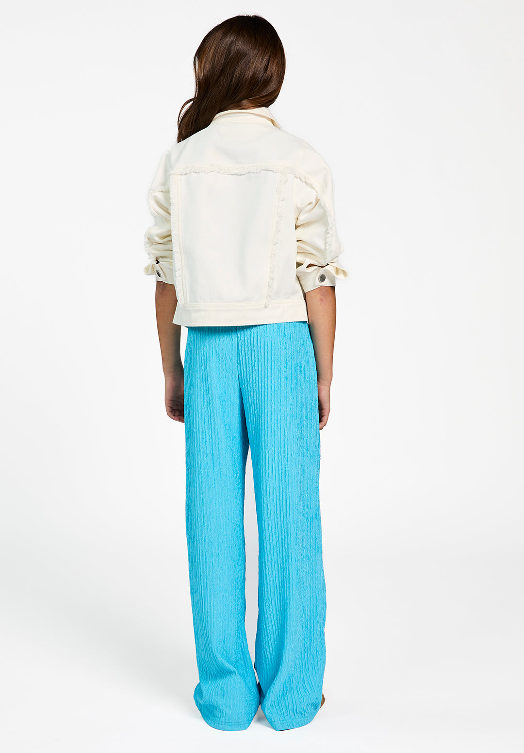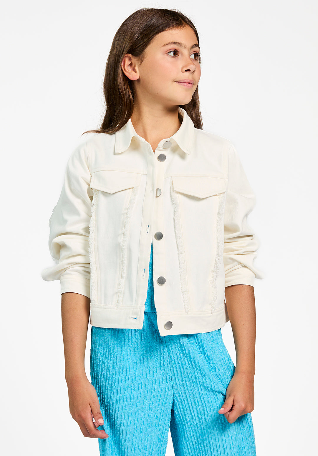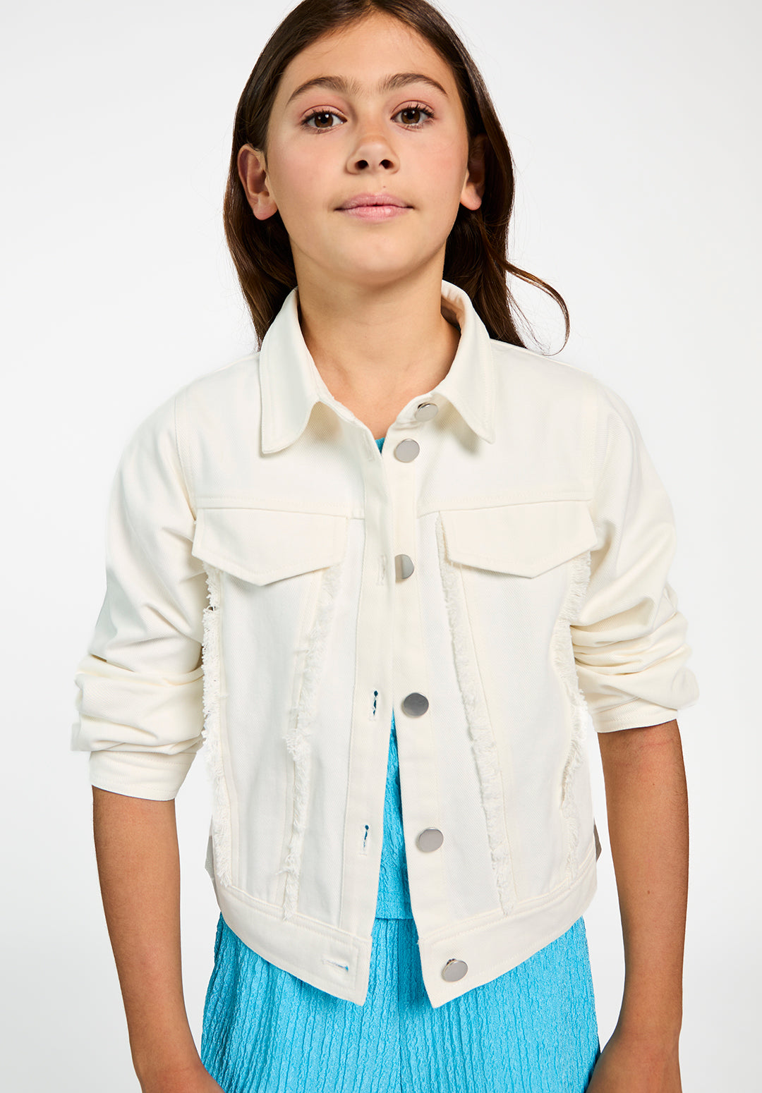 The Baukje jacket is a fresh take on the classic denim jacket. Made from soft off-white denim, it features frayed edges along the seams for a playful finish. The boxy fit and silver snap buttons make it easy to style—whether over a dress, jumpsuit, or your favorite tee. It’s a go-to layer for everyday wear. Pair with the Carly pants for a matching look.