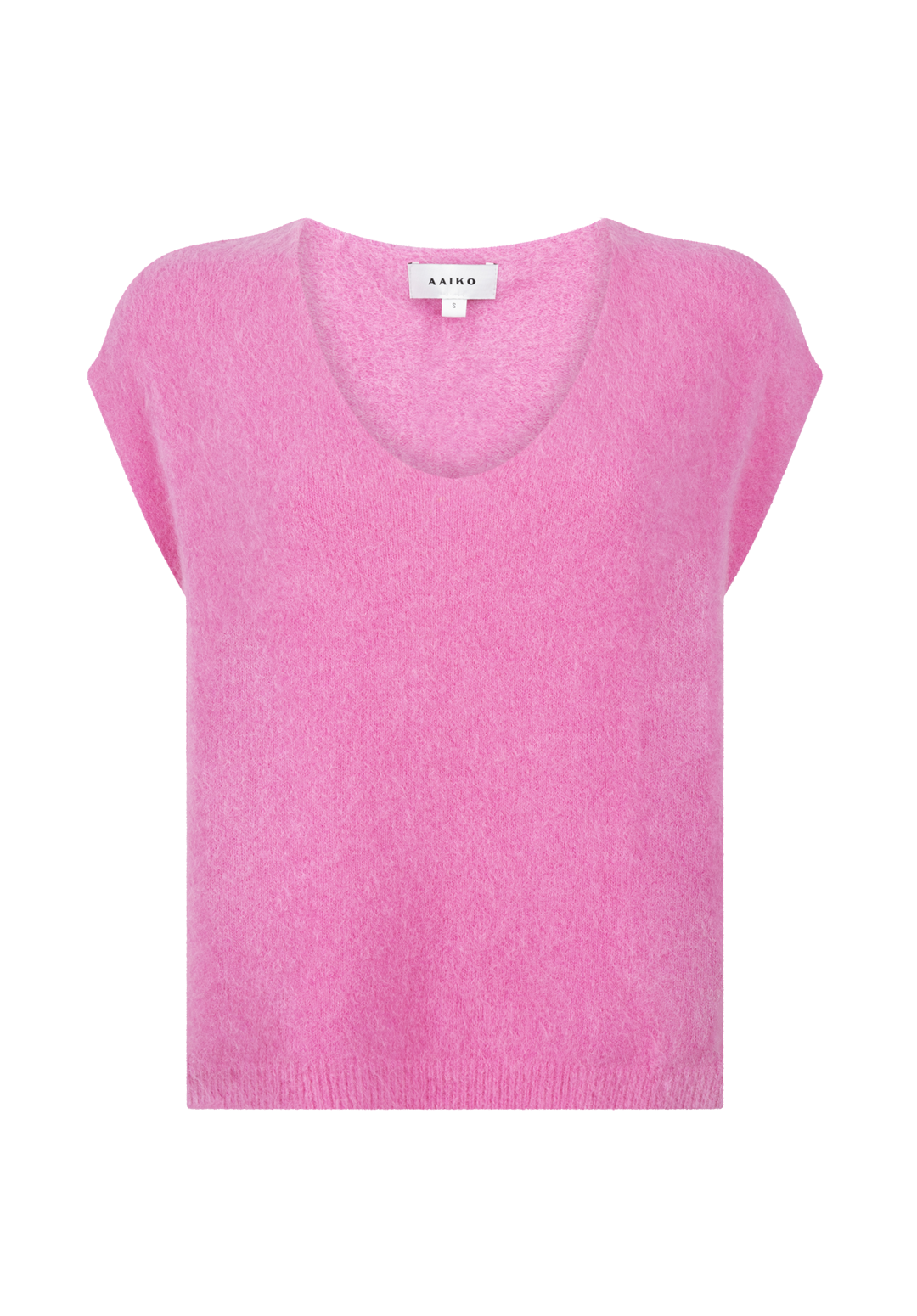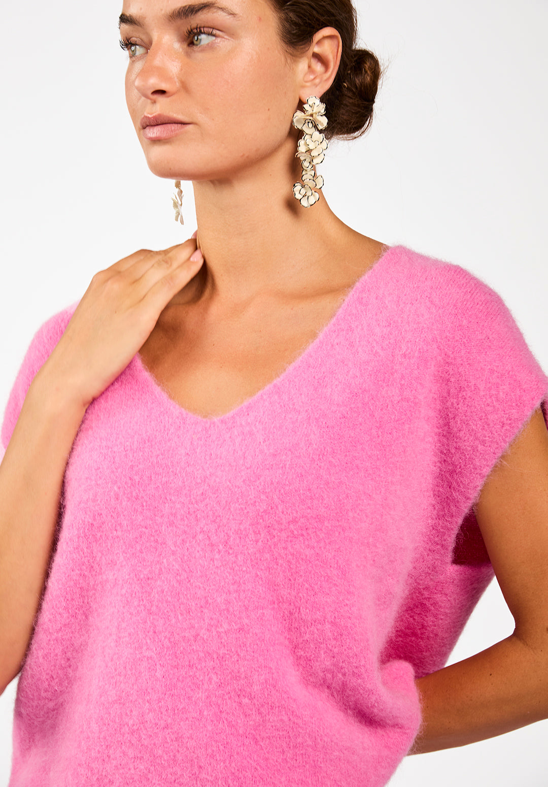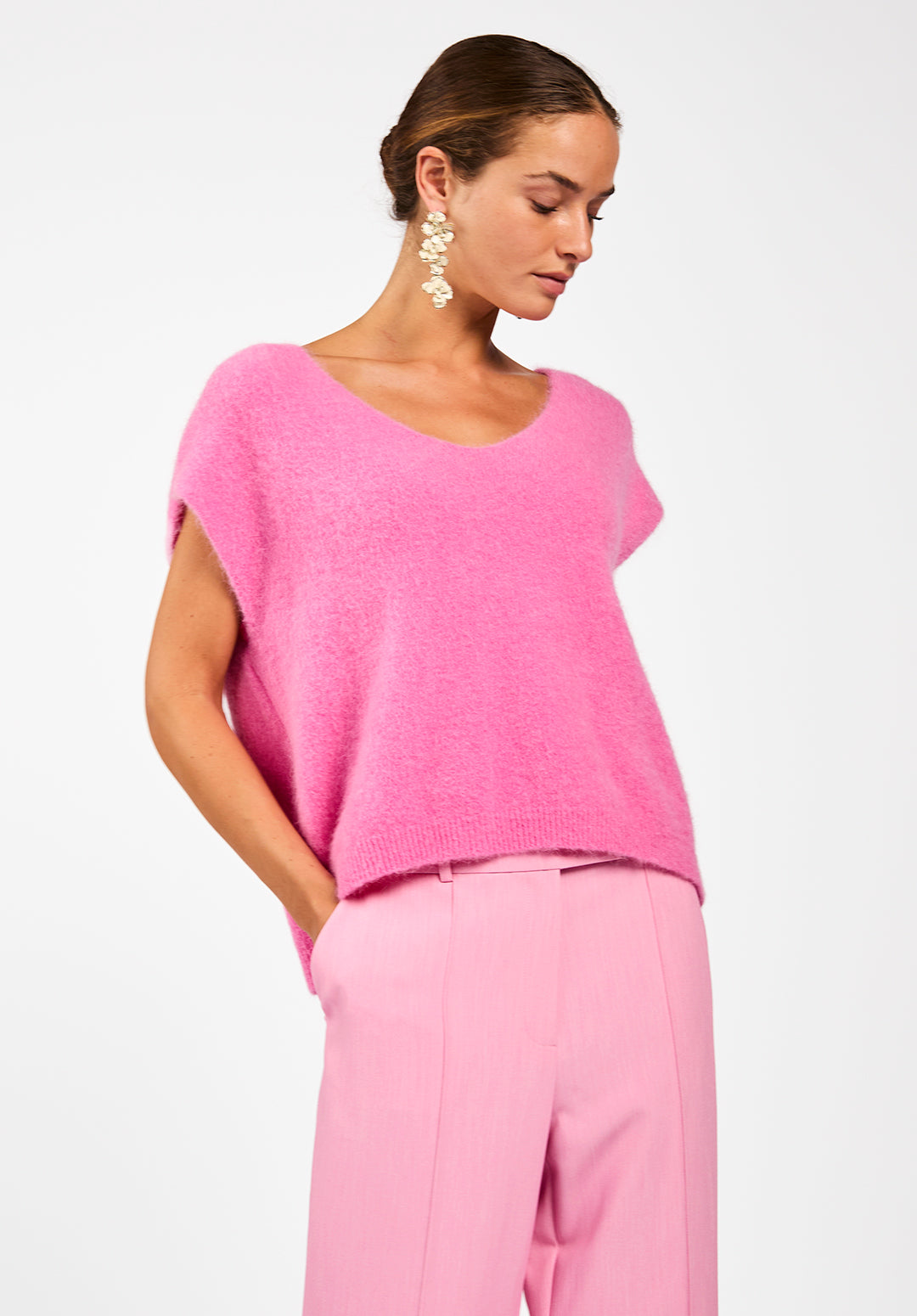 The Emmy sweater is a soft, airy knit made from an alpaca-blend yarn, ideal for effortless layering. This sleeveless style features a deep V-neck and a relaxed fit, making it perfect over a blouse or long-sleeved top. The textured knit feels smooth on the skin with a slight stretch for extra comfort. Finished with a wide hem for a flattering silhouette. Pair with the Chantalle trousers.