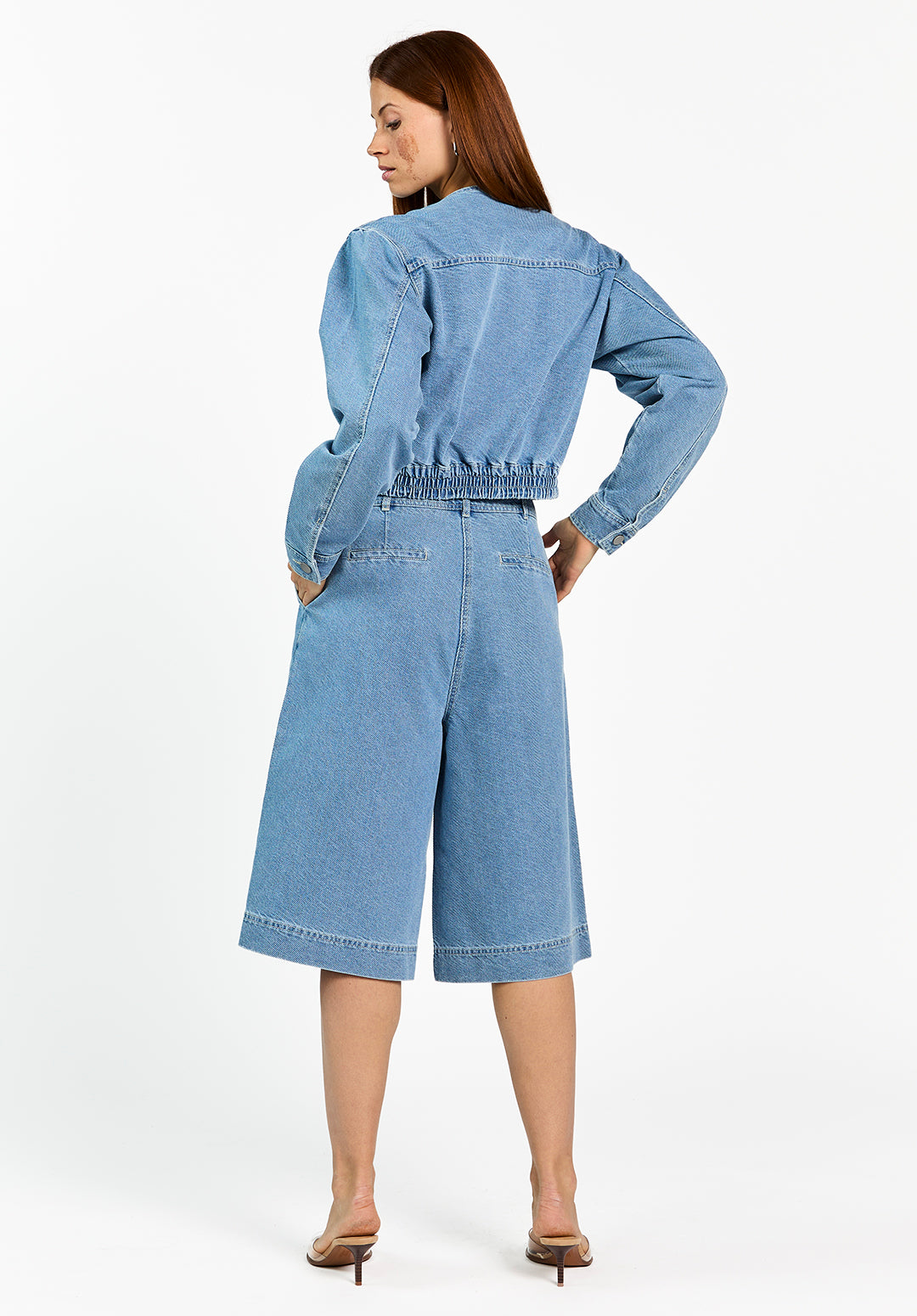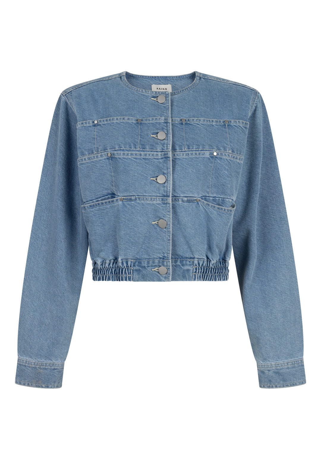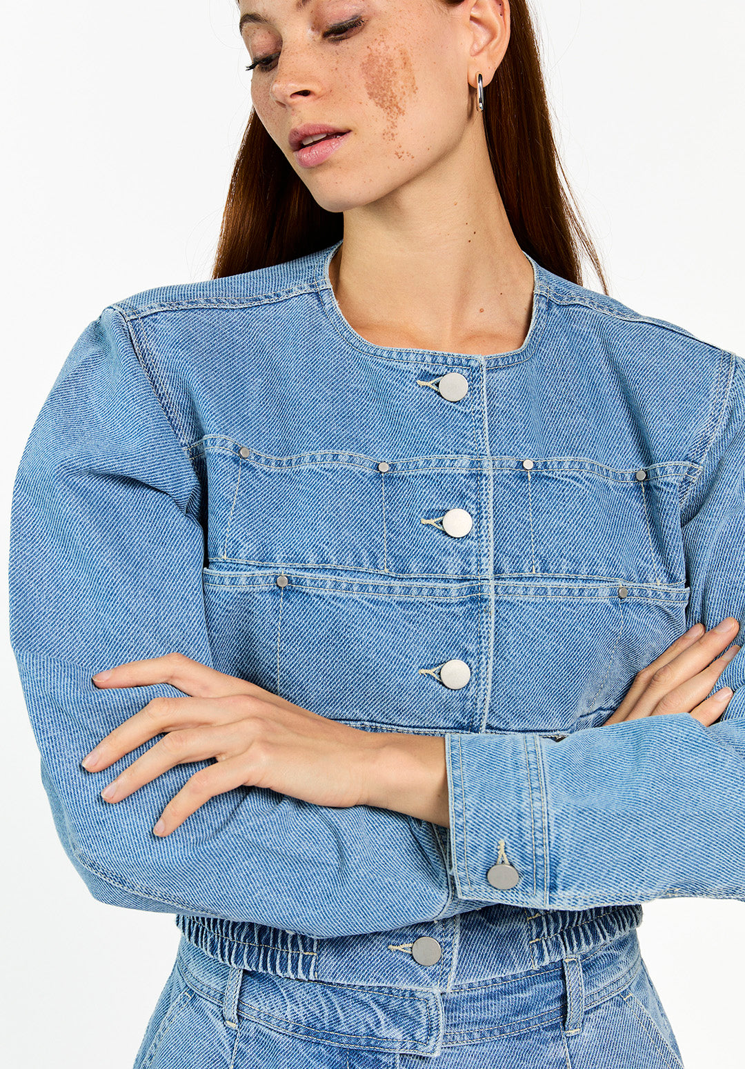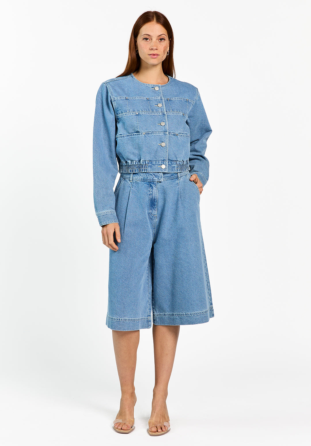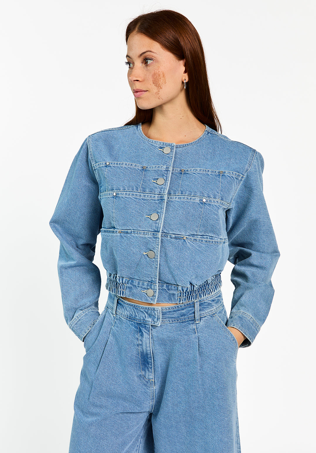 This cropped denim jacket is a contemporary addition to your wardrobe. It features a round neck, a striking button closure, and an elasticated hem for a modern fit. The large front pockets give the jacket a rugged look. Pair it beautifully with the Inaya trousers for a complete denim ensemble.