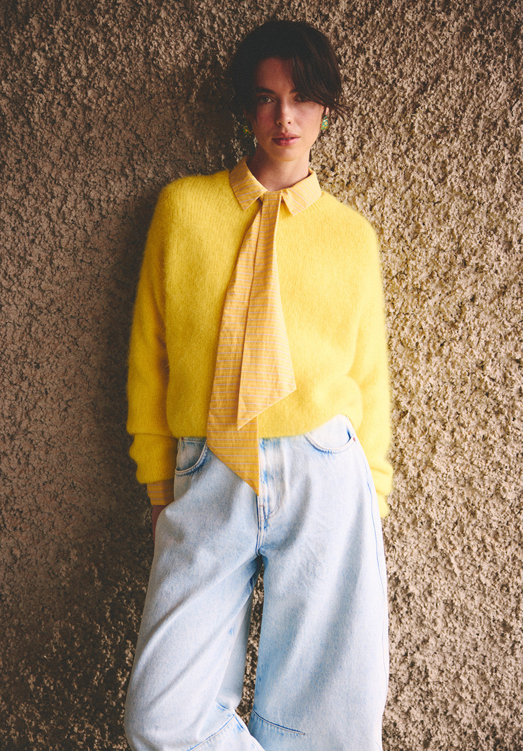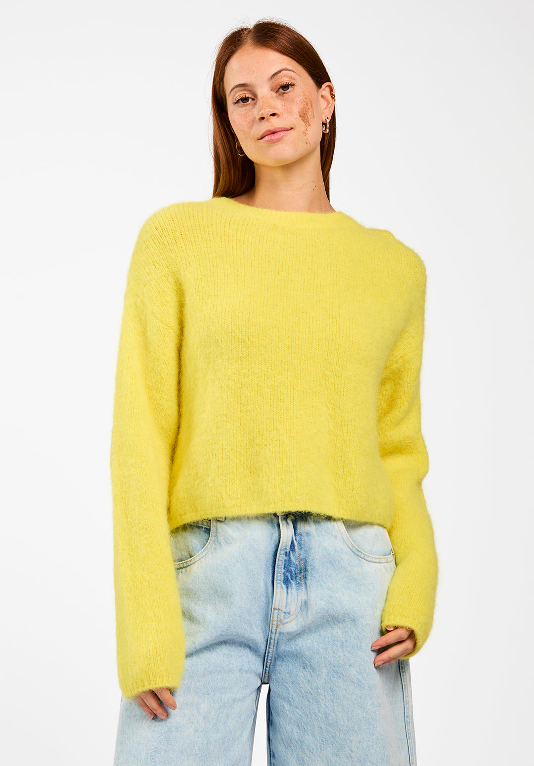 The Feline sweater is a soft, airy knit crafted from an alpaca wool blend. Designed with a straight, slightly cropped fit, it features dropped shoulders for a relaxed, modern look. The woolly texture feels warm and comfortable against the skin, making it perfect for cooler days. Style it with the Sacha trousers for an effortless outfit.