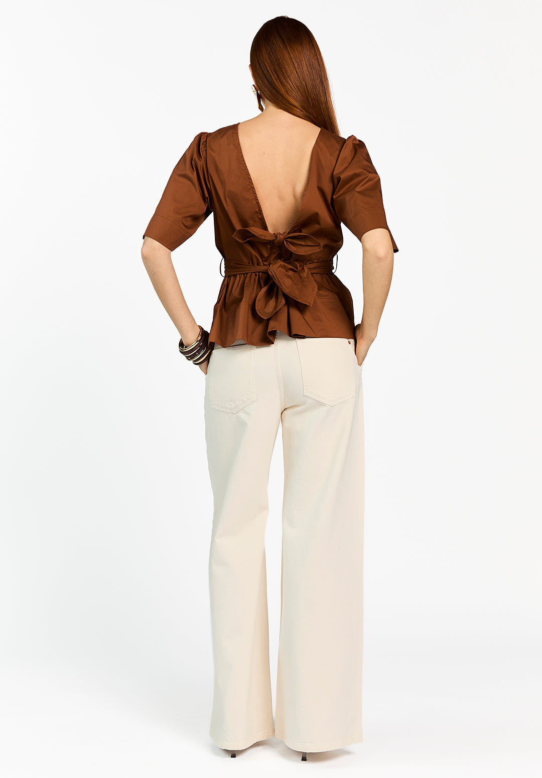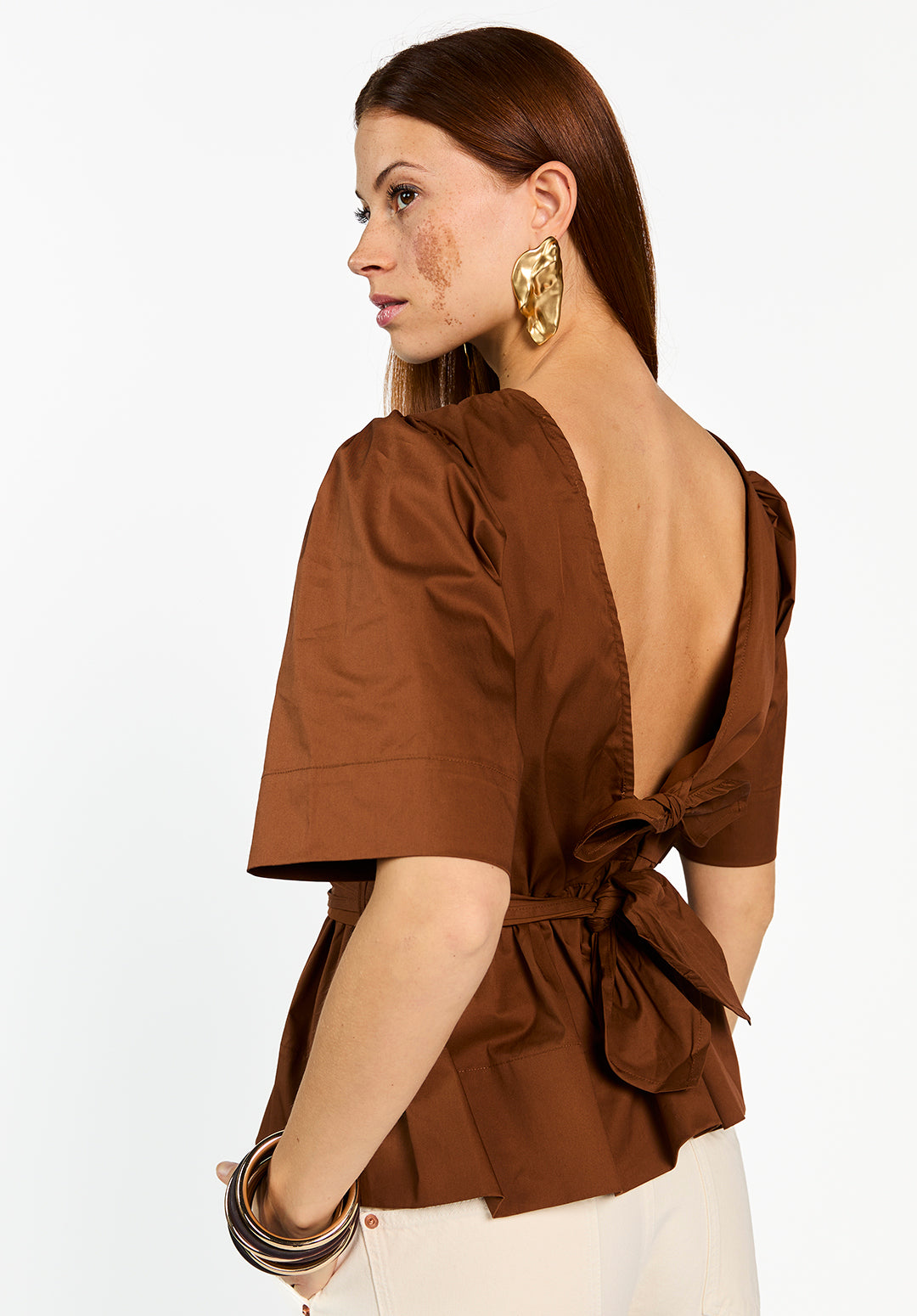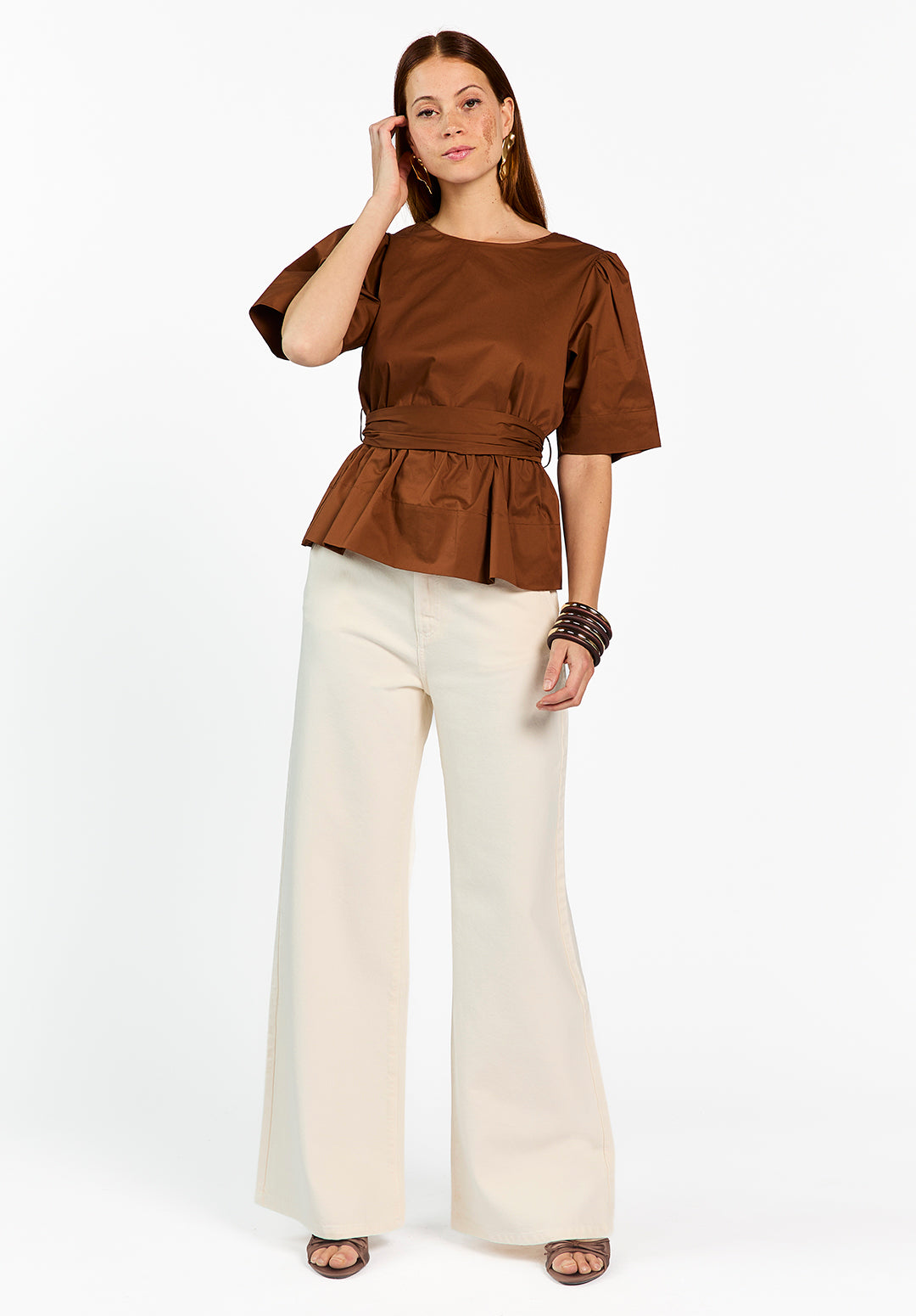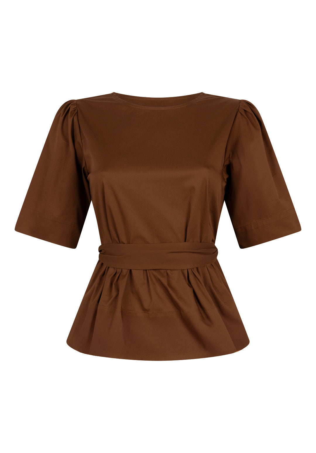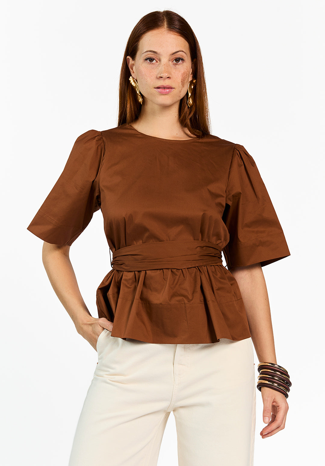 This blouse has an elegant, feminine look thanks to the flowing fabric and subtle puff sleeves. The style features a round neck and a tie belt at the waist, creating a beautiful silhouette. The slightly flared hem adds a playful touch. Perfect for both casual and formal looks.