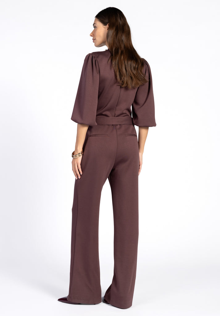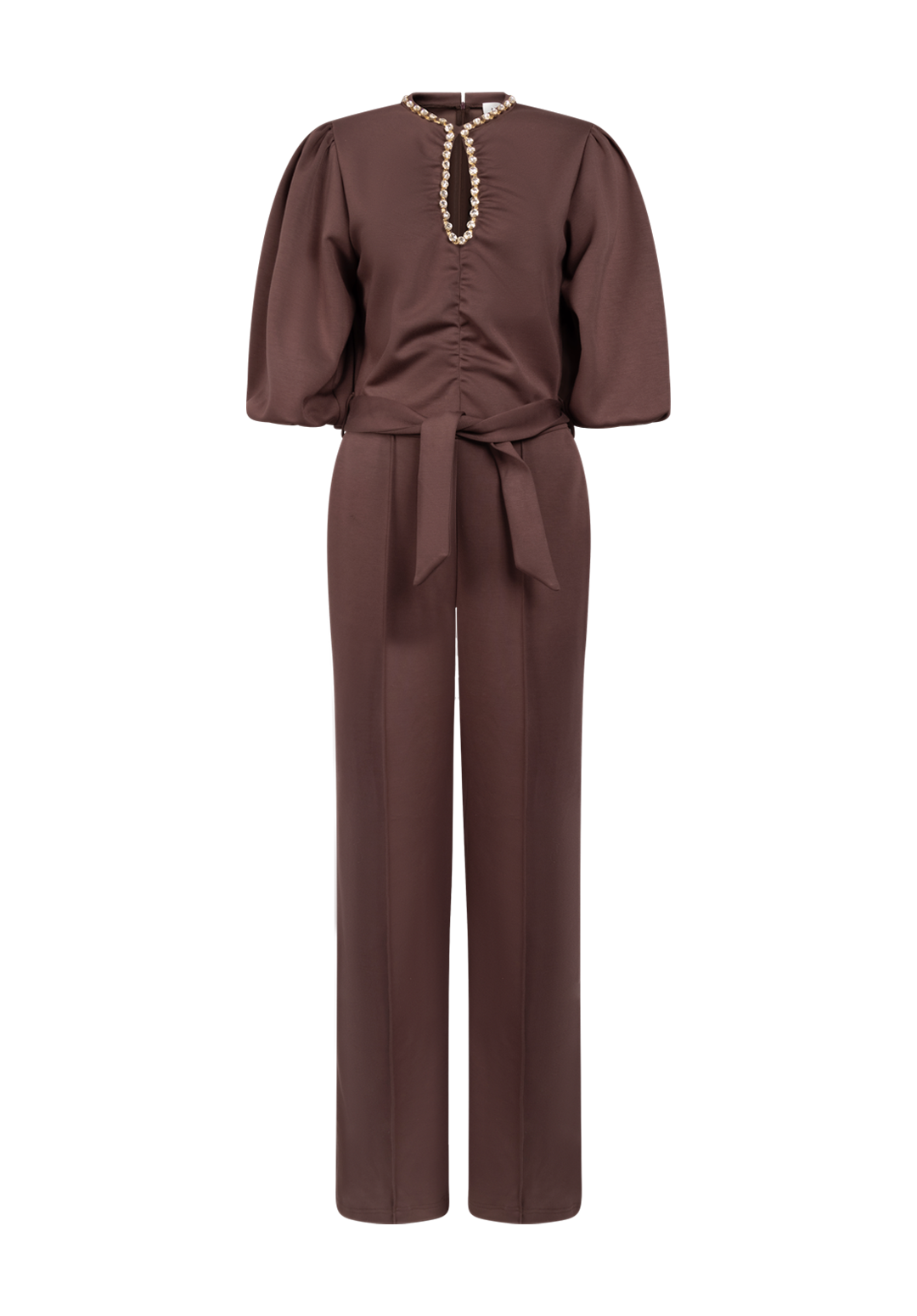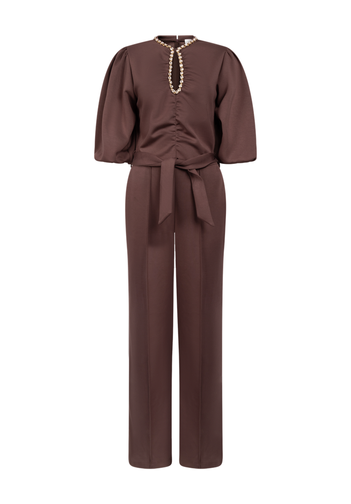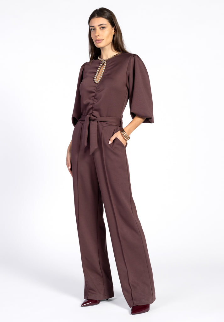 The Gina jumpsuit is a stylish choice for any occasion where elegance meets comfort. It features a flattering fitted waist with a tie belt, wide legs, and a feminine neckline with a plunging keyhole detail, beautifully accented with sparkling rhinestones. The voluminous, mid-length sleeves add a soft, romantic touch, while the flowing fabric moves gracefully with you. Perfect for festive evenings or a chic dinner date.