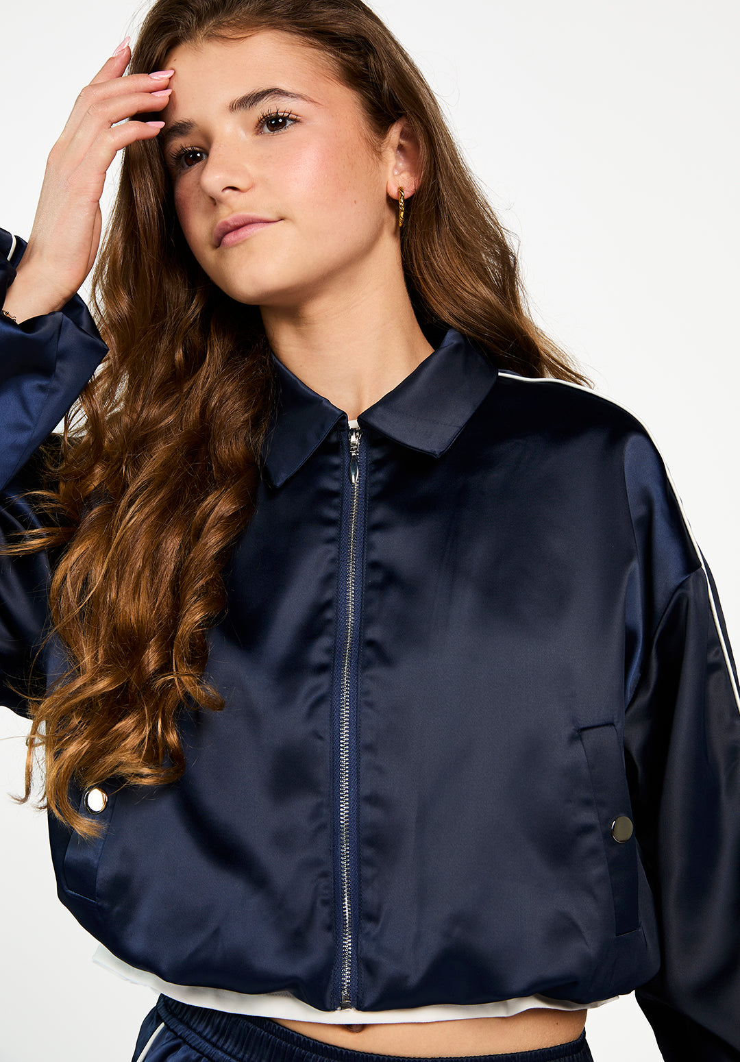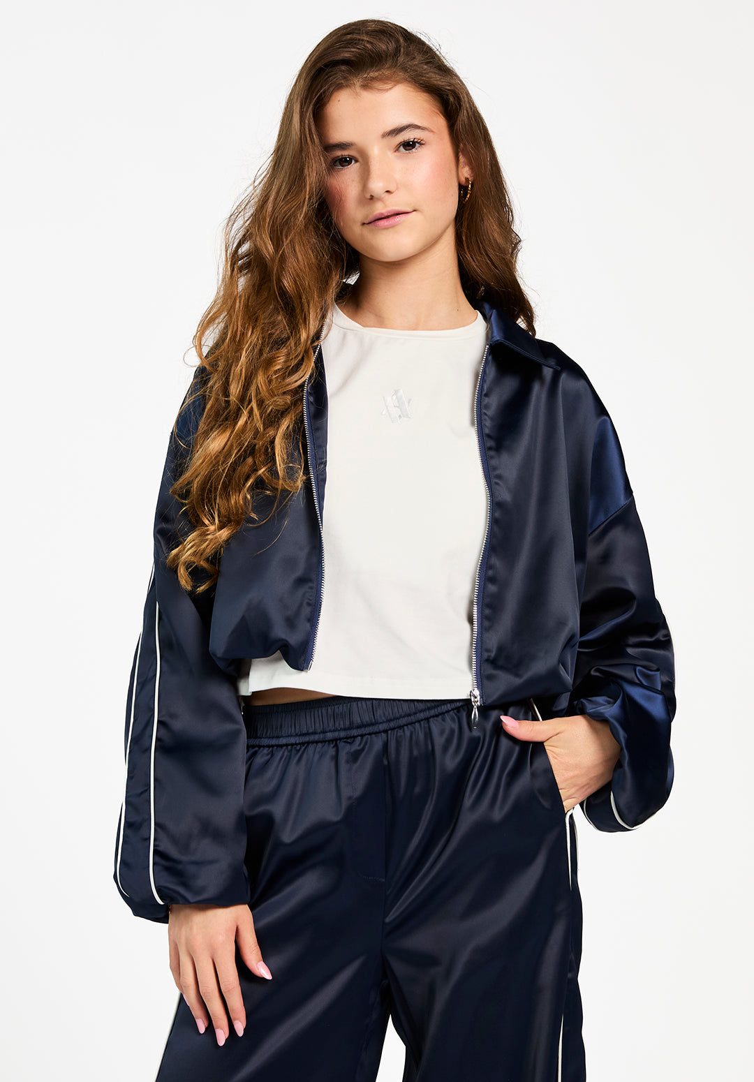 The Ilka jacket is a sporty design with a smooth, glossy finish and a relaxed fit. The white piping along the sleeves and collar adds a classic touch. It features a zip closure and snap-button pockets and is fully lined for extra comfort. Pair it with the Aurora trousers for a striking co-ord look.
