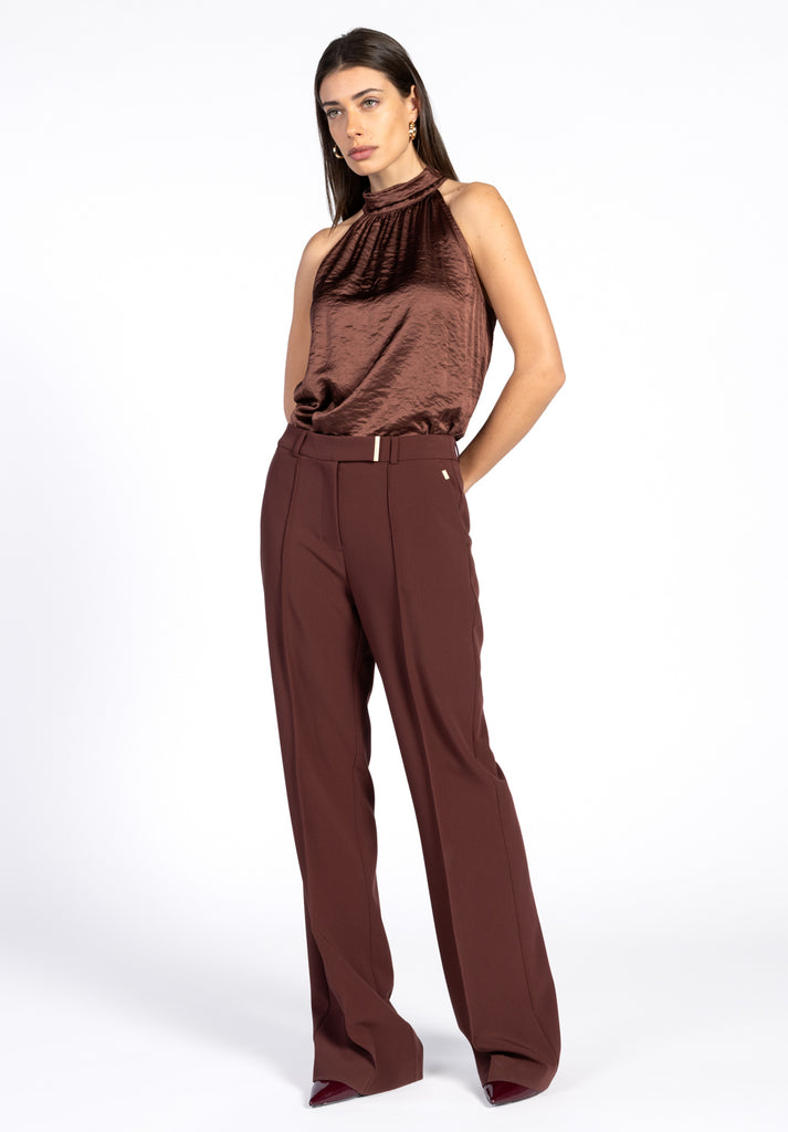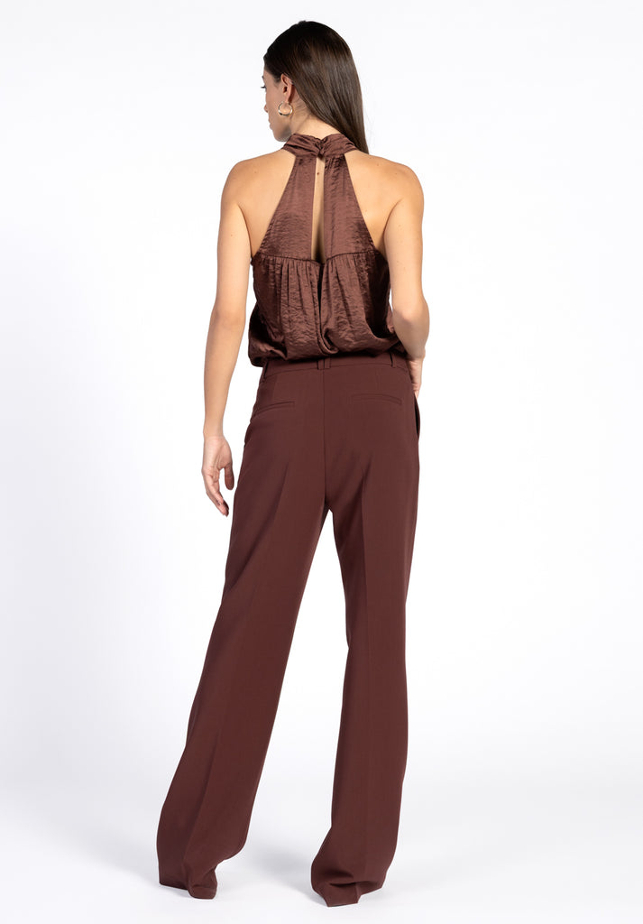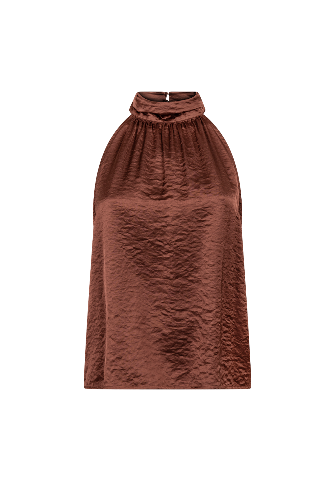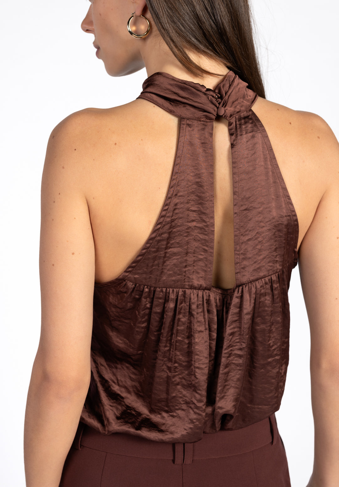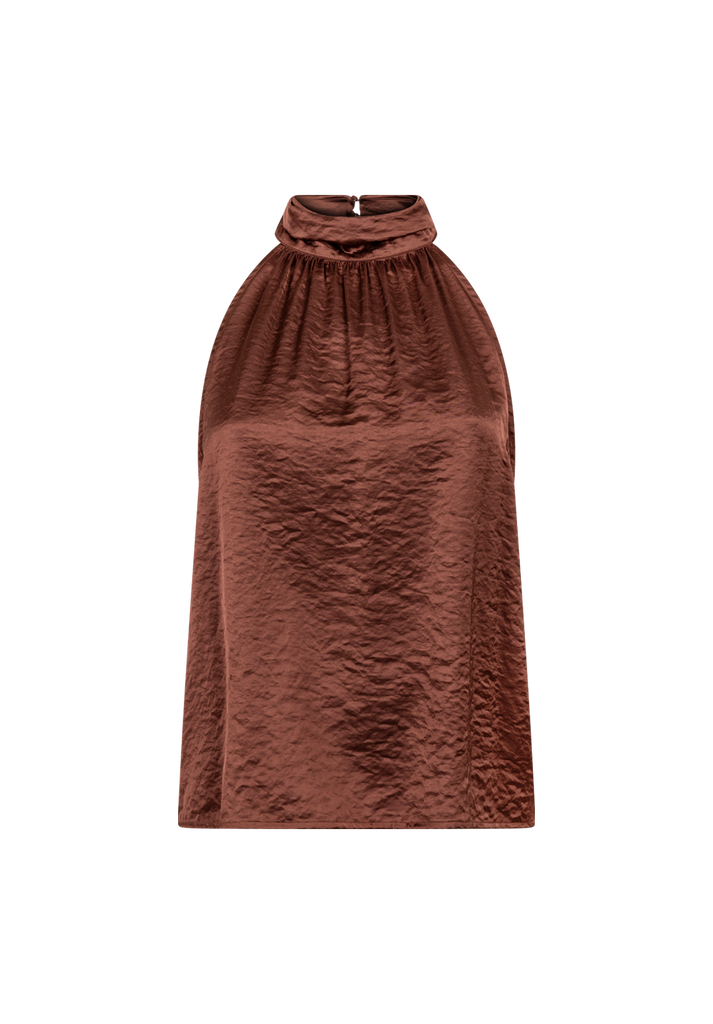 The Irisa Top is a chic halter design in soft green with a warm bronze sheen. Made from flowing fabric with a pleated neckline, it has a sophisticated, feminine look. The back features a delicate keyhole closure for an elegant finish. Wear it under a blazer for a polished outfit or style it solo as a standout piece for a dinner party.