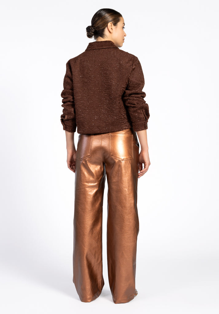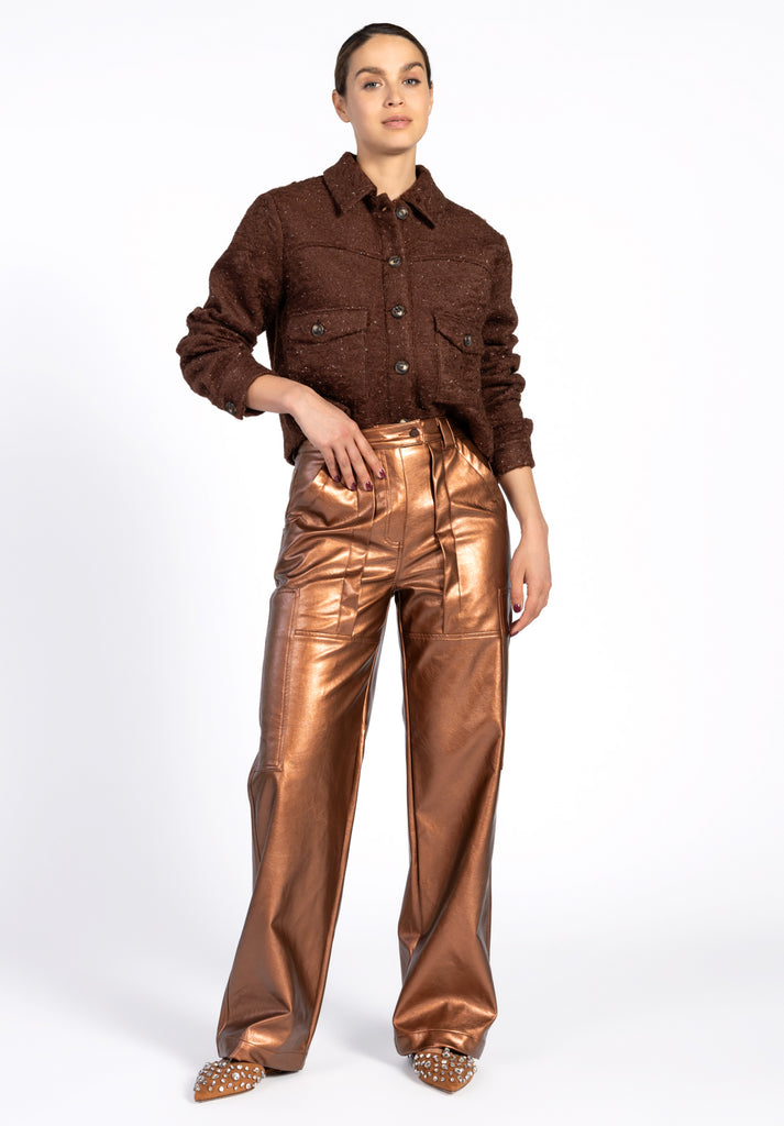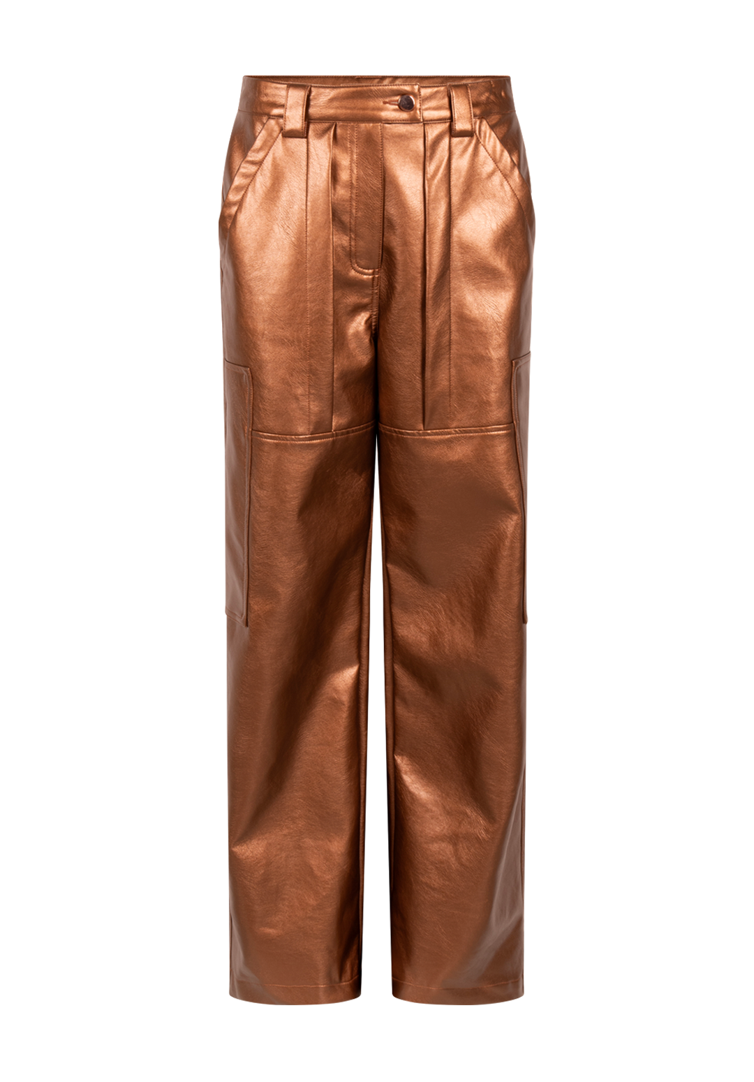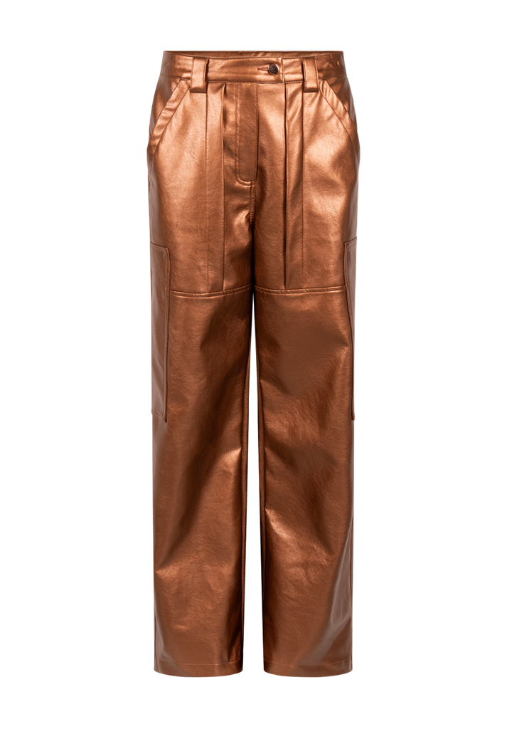 The Ivory Trousers are a striking statement piece for any wardrobe. These high-waisted, straight-leg trousers feature a metallic bronze, leather-look finish. The sturdy yet soft coated fabric offers a luxurious appearance while ensuring a comfortable fit. Rugged details, including patch pockets and visible seams, complete the look. Pair with a soft knit or a chic top for a versatile outfit.