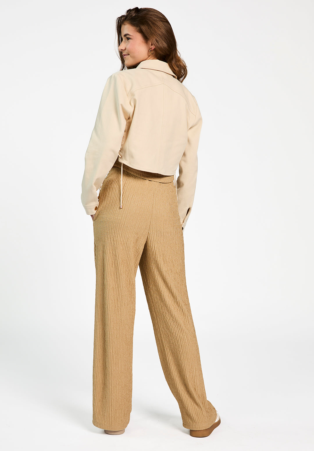 The Judith jacket is a short design crafted from a sturdy yet soft fabric with a clean finish. The front zip and side lace-up detail add a playful accent, while the straight collar gives it a classic feel. Pair it with the Daira top and Ramona trousers for a refined yet comfortable look.