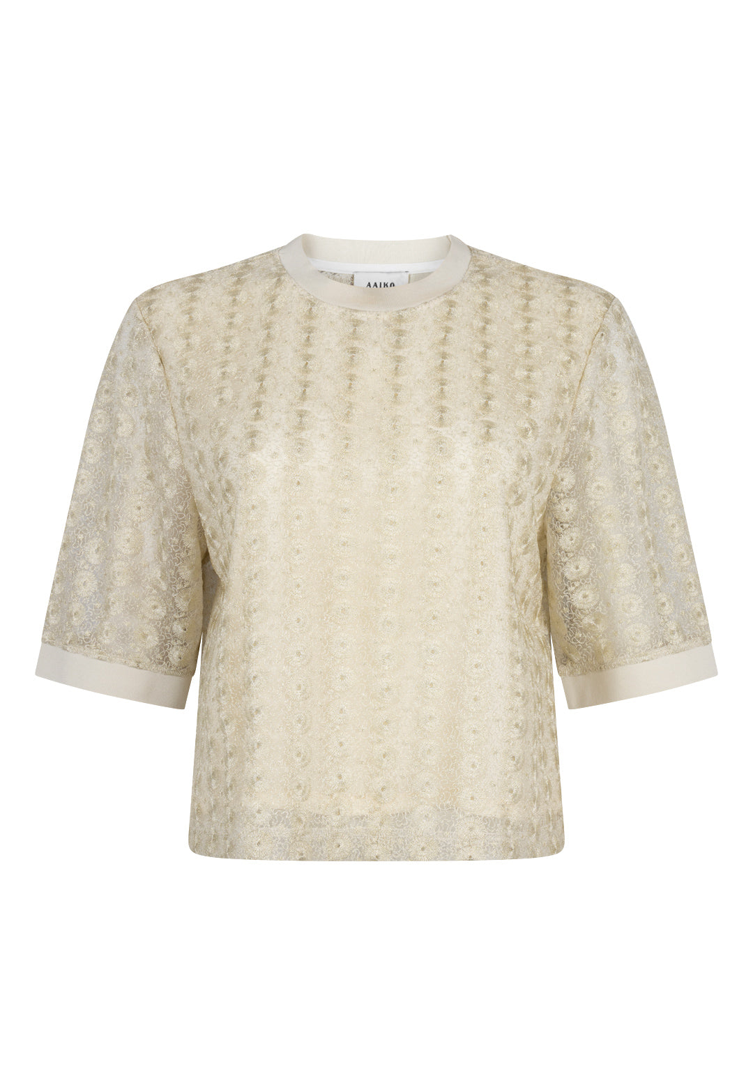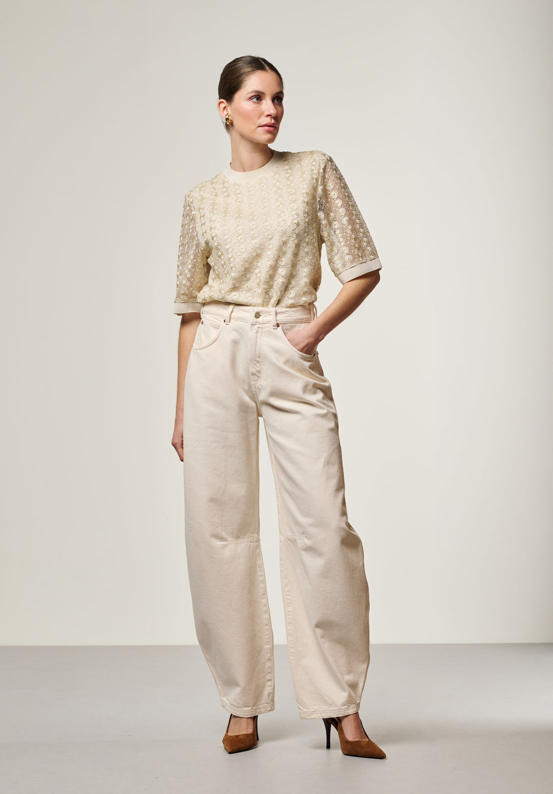 The Julice top is a feminine piece with a subtle look. The jacquard fabric has a subtle sheen and a delicate pattern. The fit is straight and comfortable, with short sleeves and a round neckline. The contrasting cuffs provide a neat finish. A stylish piece that's easy to style.