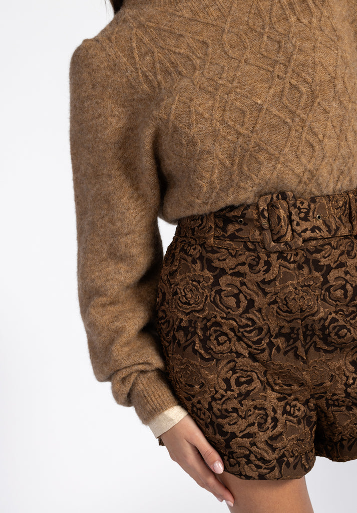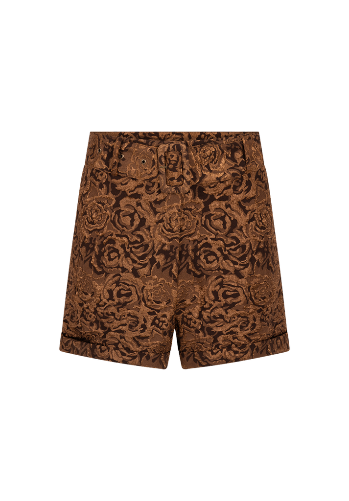 The Lano Jacquard Shorts stand out with their rich jacquard texture, making them a true statement piece. Designed with a high waist and a matching detachable belt, they feature a subtle sheen that adds a touch of luxury. Style them with knitwear and boots for a playful vibe, or dress them up with a blouse and heels for a chic finish.