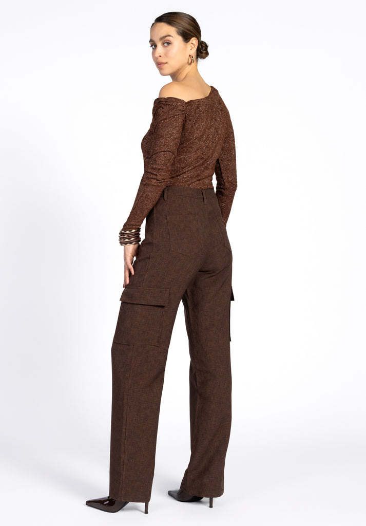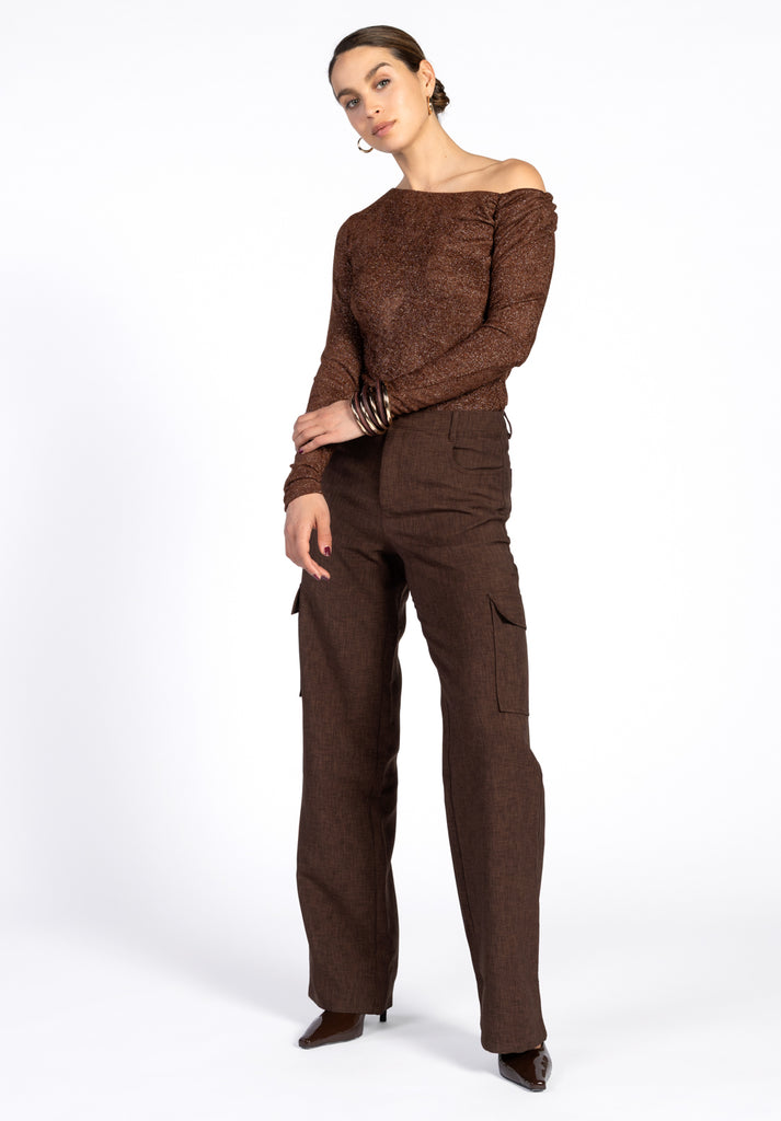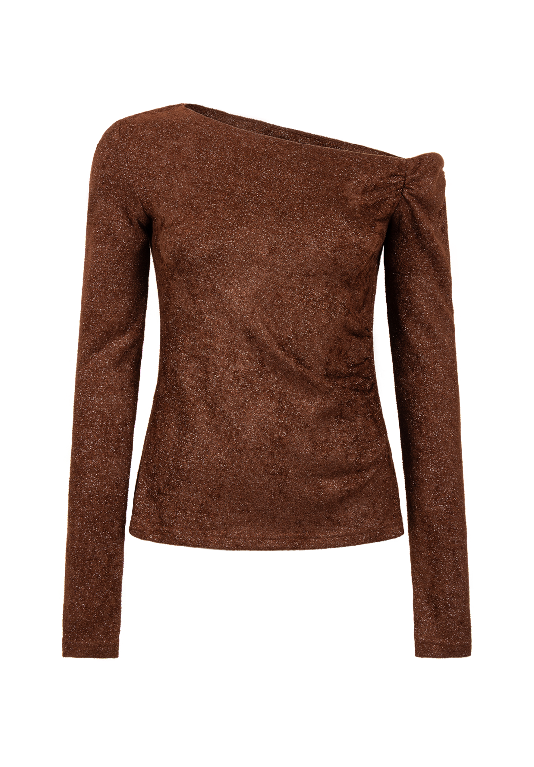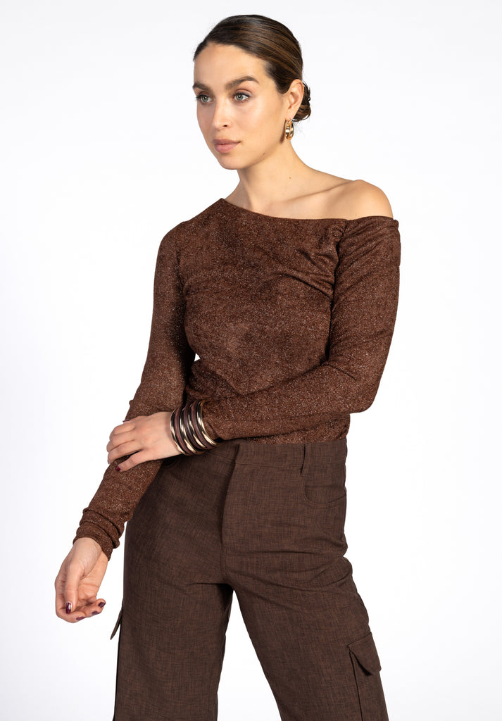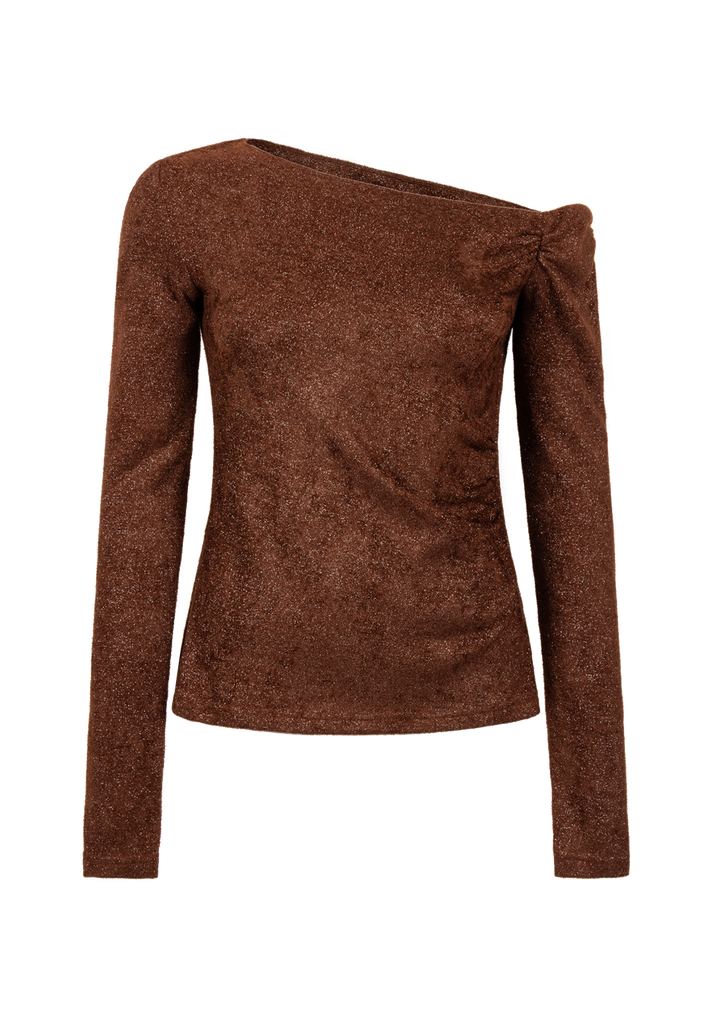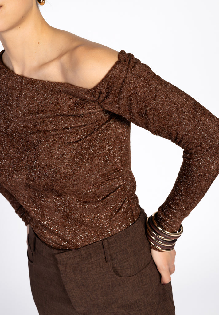 The Lumia Top is a sophisticated choice for those who love a subtle sparkle with a modern twist. Made from a shimmering lurex blend, it features an asymmetrical neckline that drapes elegantly over one shoulder. The fitted silhouette and delicate pleated details create a feminine shape. Pair with wide-leg trousers or jeans for an elegant, contemporary look.