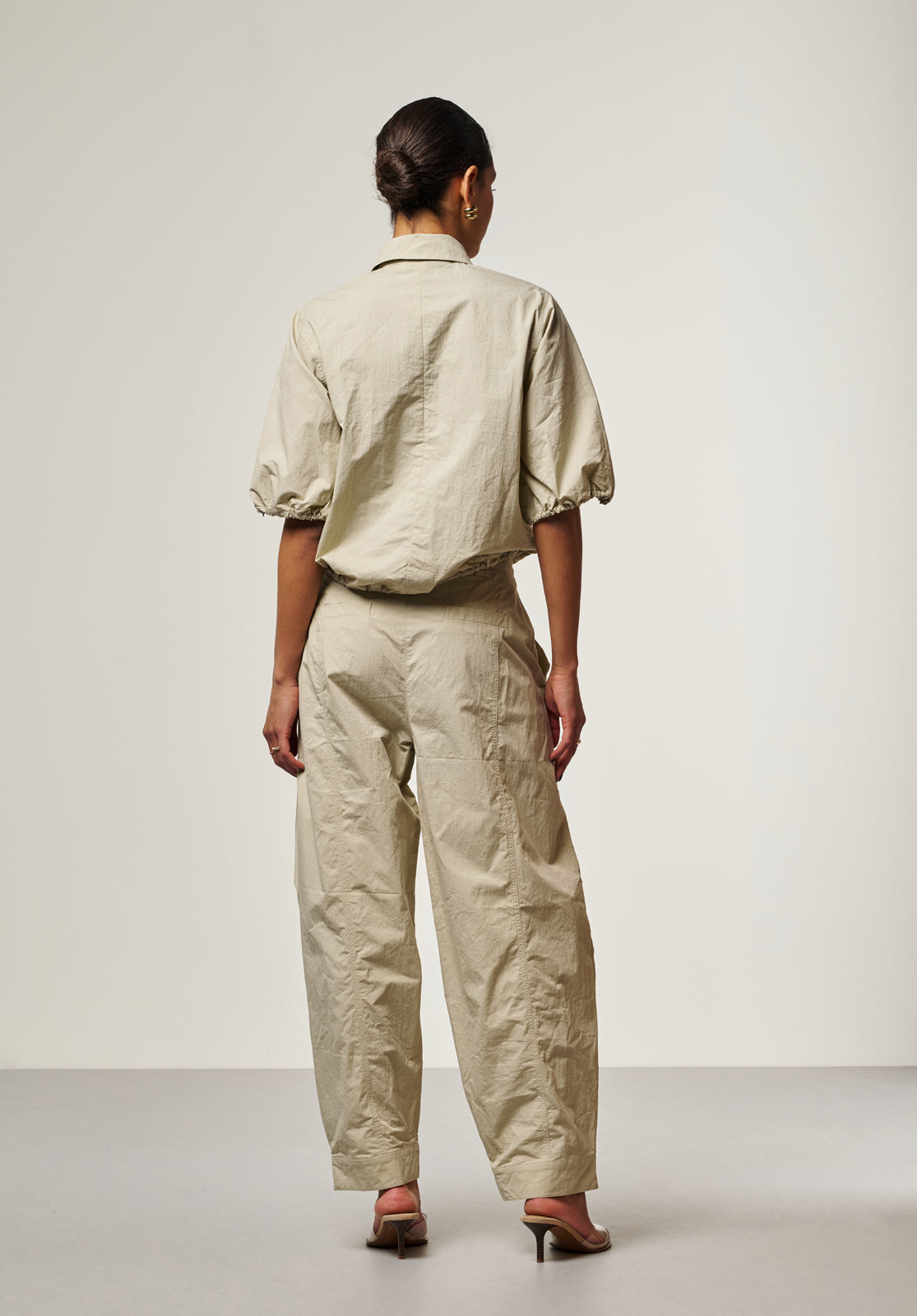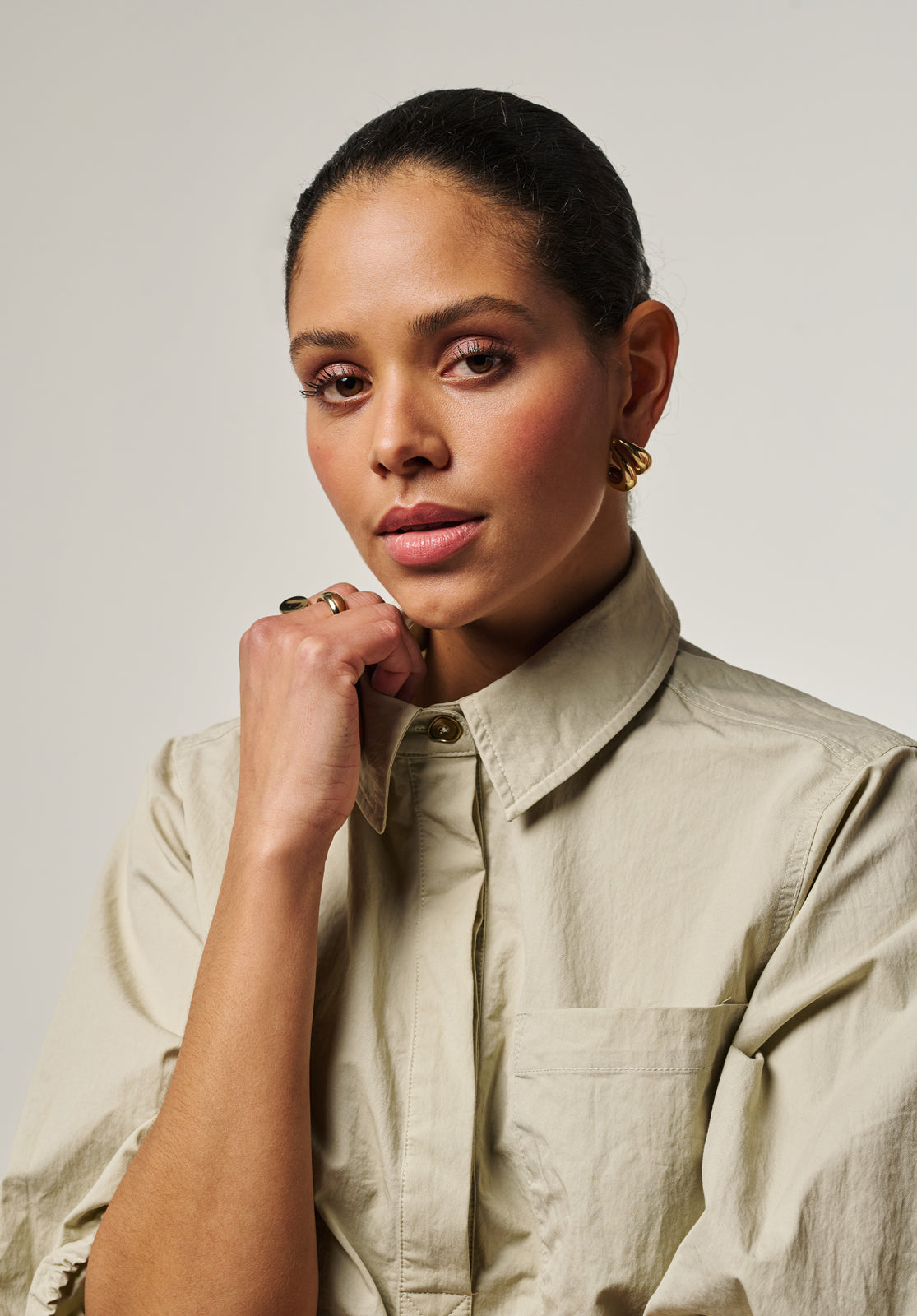 The Lydia Top is an airy blouse with a relaxed look. The cotton poplin fabric feels lightweight and comfortable. It has a straight fit, short puff sleeves, and a classic collar with a subtle button placket. Wear it as a set with the Steffi trousers for a modern look.