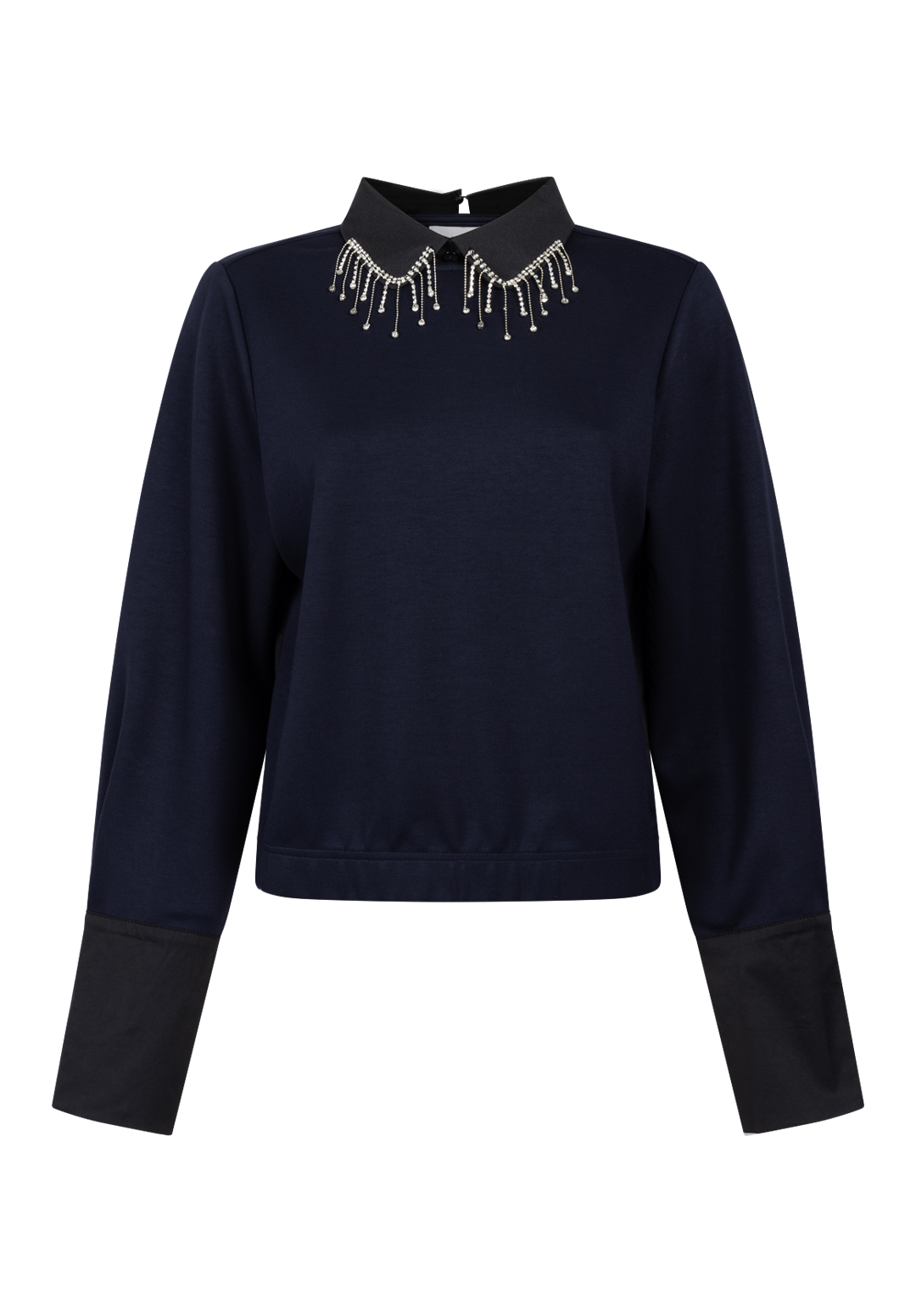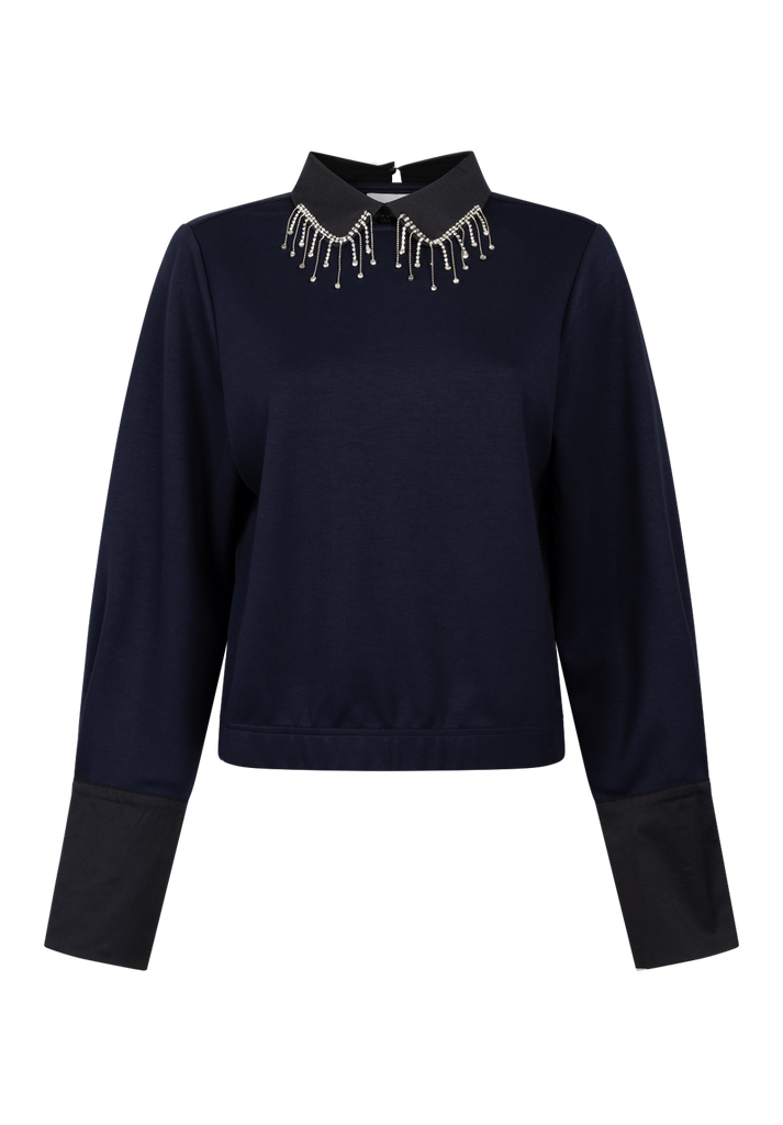 This dark blue top with contrasting cuffs has a black detachable collar adorned with silver beaded fringe. Wear it casually with jeans during the day, then swap in tailored Robin Trousers for an elevated evening look. A versatile piece that moves effortlessly from laid-back to refined.