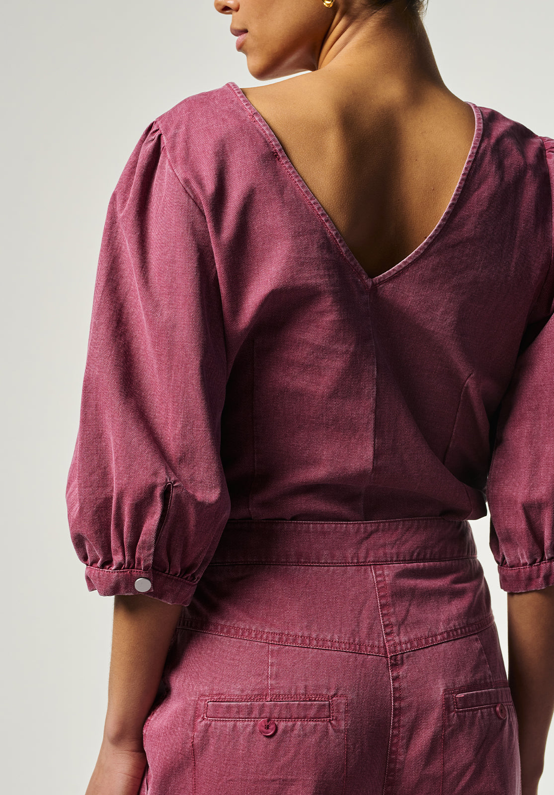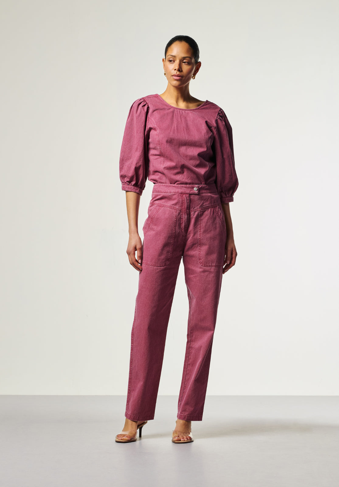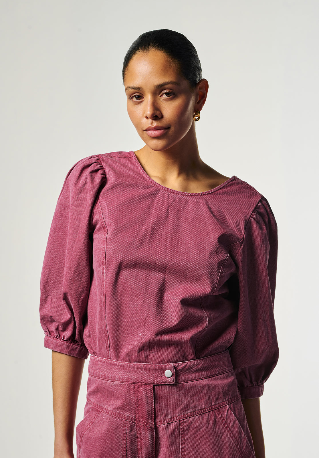 This stylish top has a modern, feminine look thanks to its fitted silhouette and subtle puff sleeves. The soft, sturdy fabric provides structure and comfort, while the round neckline creates a timeless look. Pair it perfectly with the matching Alexa trousers for a contemporary outfit.