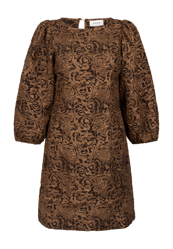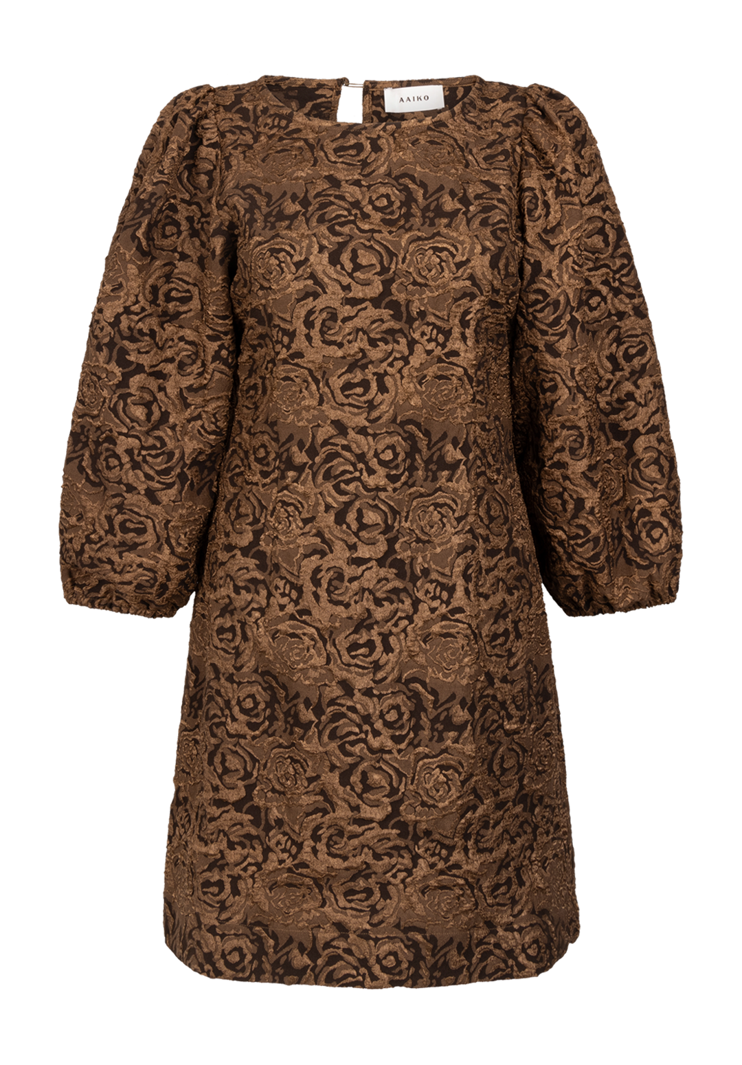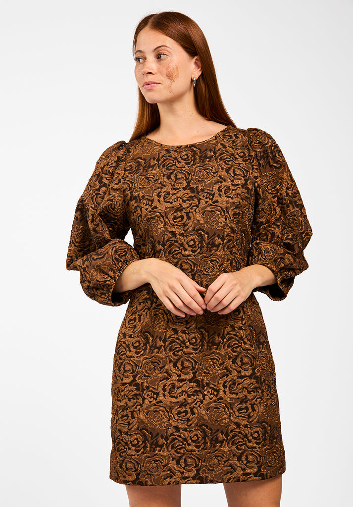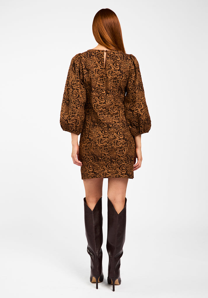 The Nicolette Dress is crafted from rich jacquard with an elegant floral relief, making it a true statement piece. Designed in a deep bronze hue with a refined rose motif, it strikes the perfect balance between classic and modern. The voluminous balloon sleeves with elastic cuffs add a touch of drama, while the short length and straight fit give it a contemporary edge. Style it with tall boots for a bold look, or with heels for a festive silhouette.