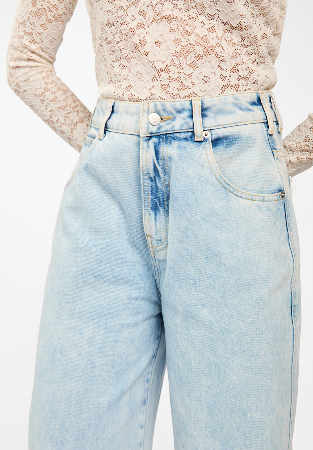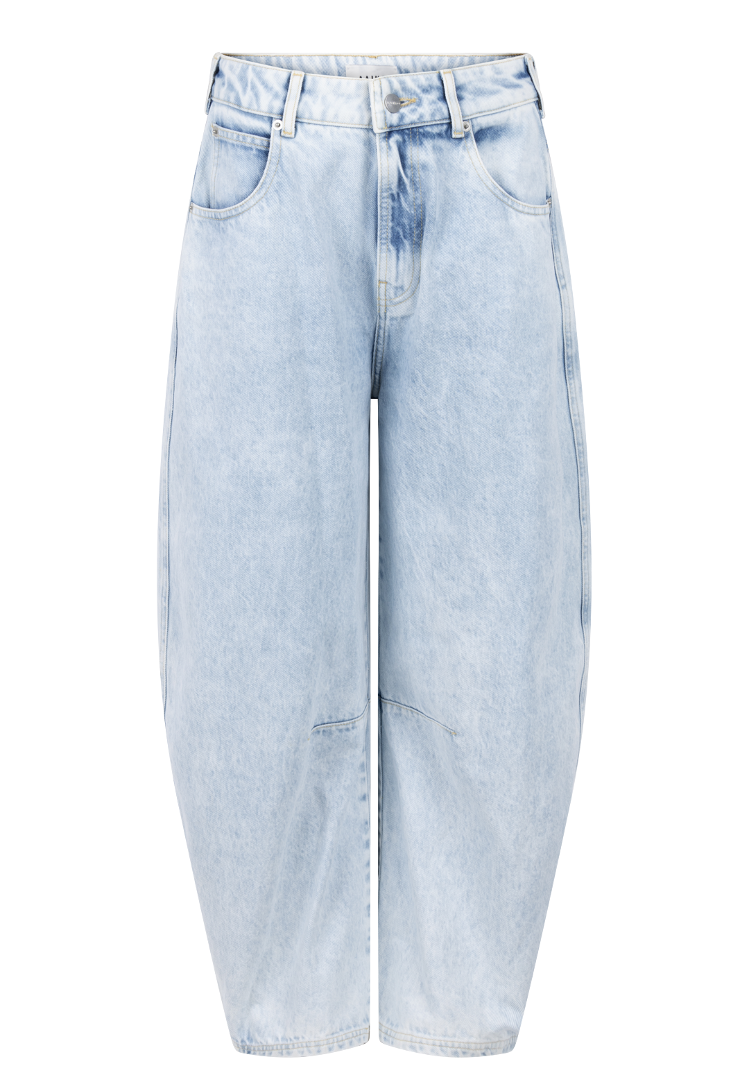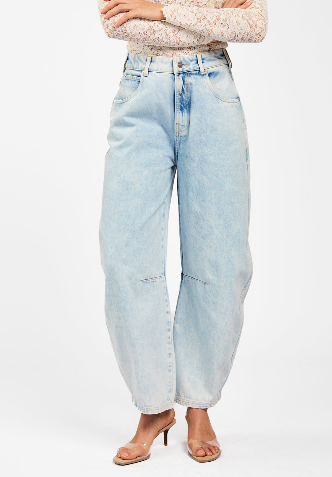 The Sacha is a modern barrel jean designed with a high waist and a relaxed, structured fit. It’s wide through the thigh and tapers gently at the ankle, creating a bold yet wearable silhouette. Made from lightly washed denim with a soft hand feel, it features classic side and back pockets and a leather logo patch on the waistband for a clean finish.