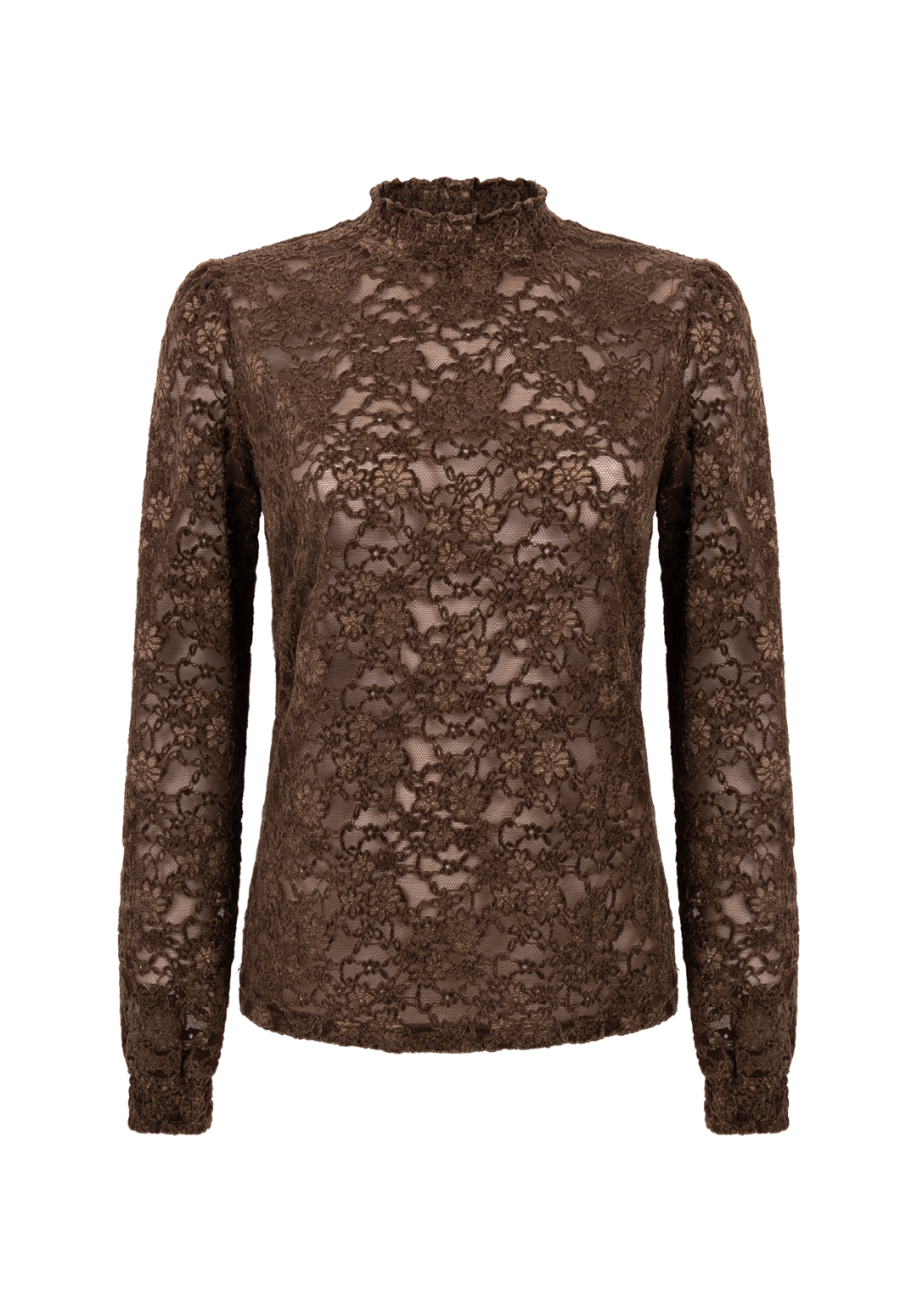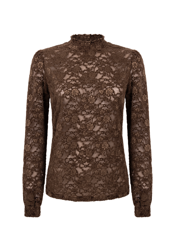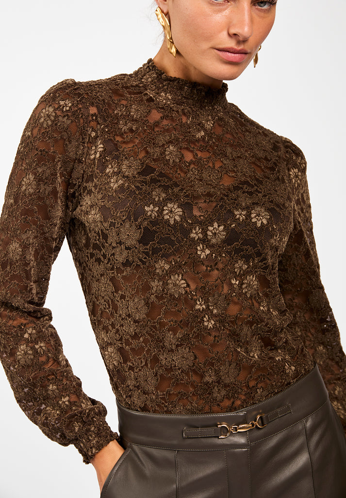 De Tory Lace Top is een verfijnde groene longsleeve, uitgevoerd in een semi-transparante kanten stof. De hoge halslijn en licht gepofte mouwen geven het item een vrouwelijke en moderne uitstraling. Combineer met een mooie bralette of top eronder voor een gedurfde, maar stijlvolle layered look. Stijl af met broek Sonja.