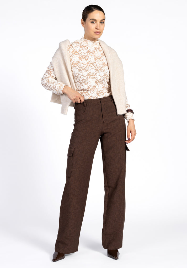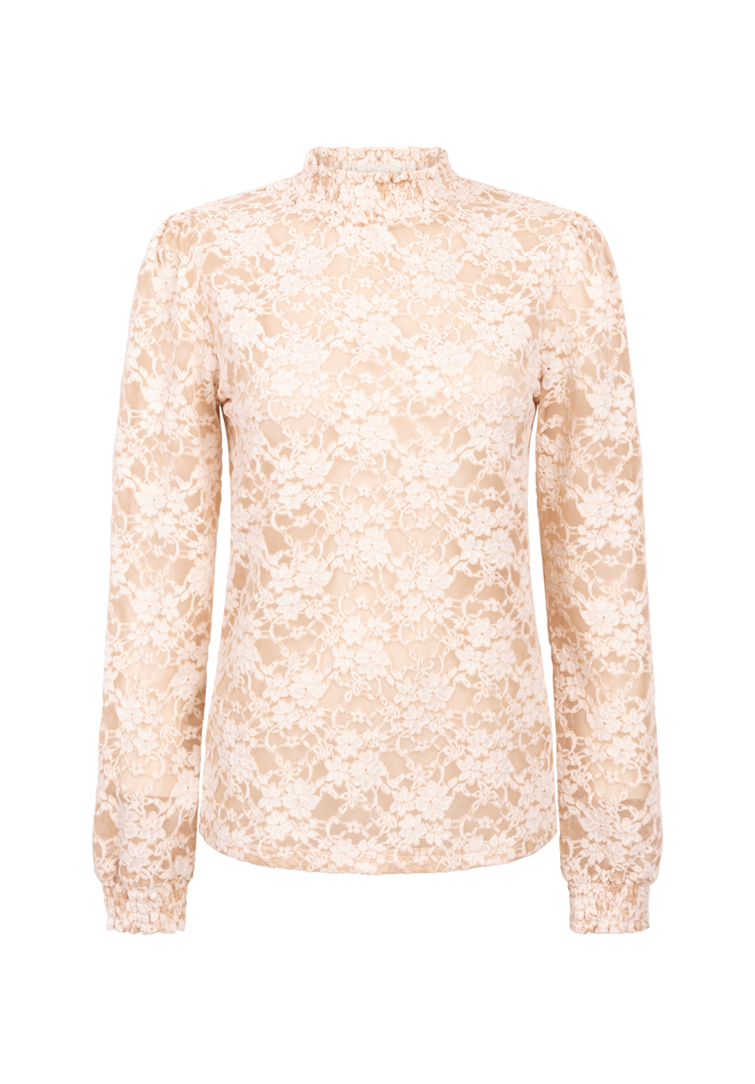 The Tory Lace Top is a sophisticated, cream-colored long-sleeve top crafted from semi-sheer lace. Featuring a delicate knitted floral motif, it combines elegance with a modern edge. The high smocked neckline and subtly puffed sleeves add a feminine touch. Style it with a chic bralette underneath for a bold yet refined layered look. Pairs beautifully with the Chantalle trousers.