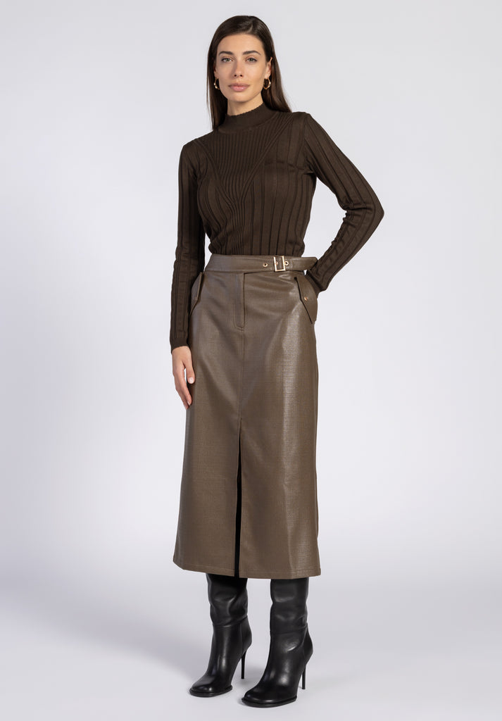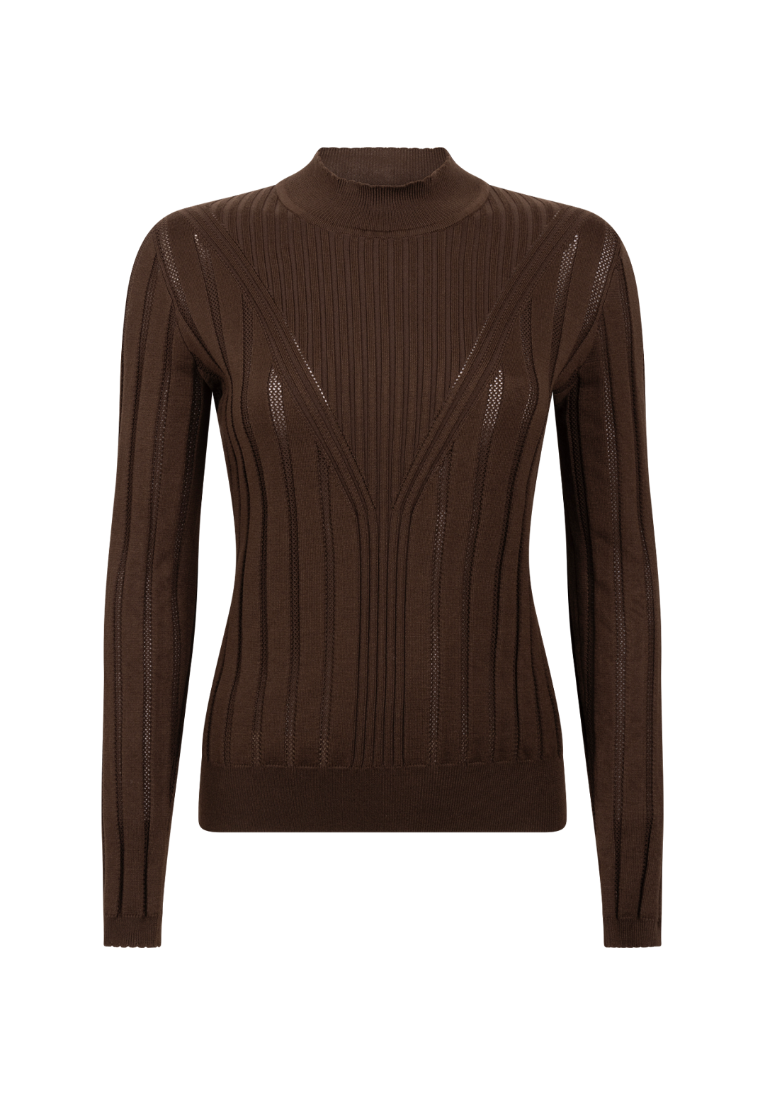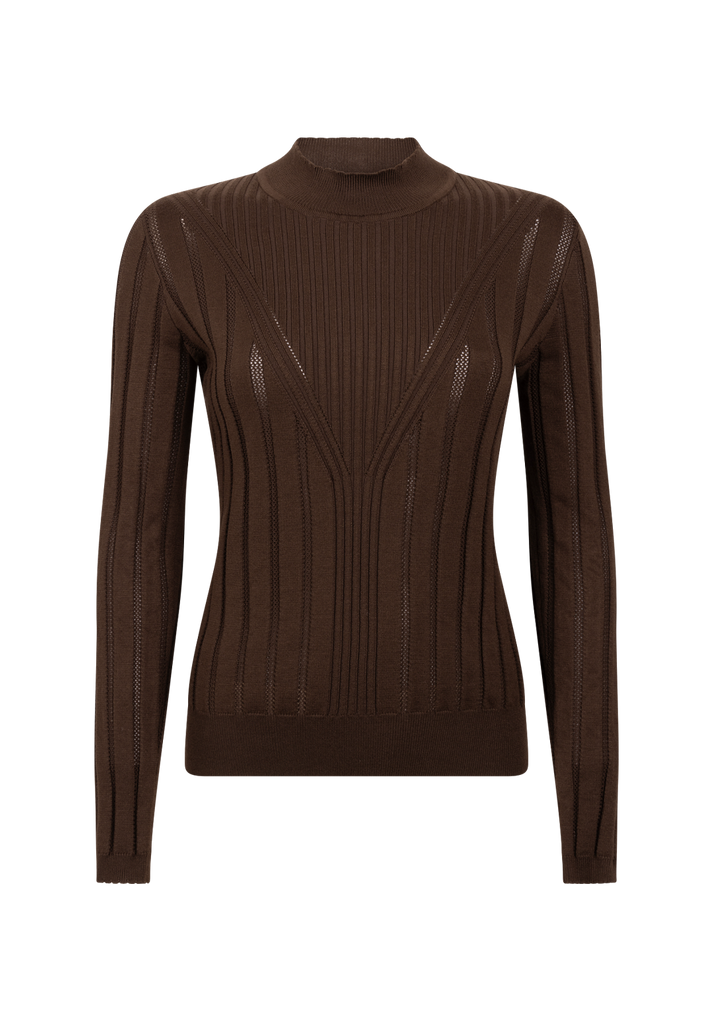 The Vida Sweater is a refined knit with a modern, edgy twist. The fitted silhouette is beautifully defined by an asymmetrical ribbed pattern that adds depth and visual interest. Featuring a high round neckline and long sleeves, it is perfect for layering or wearing on its own. The rich, deep hue gives the sweater a luxurious feel with just the right amount of attitude. Pair it effortlessly with the Sonja trousers for a sleek, elevated look.
